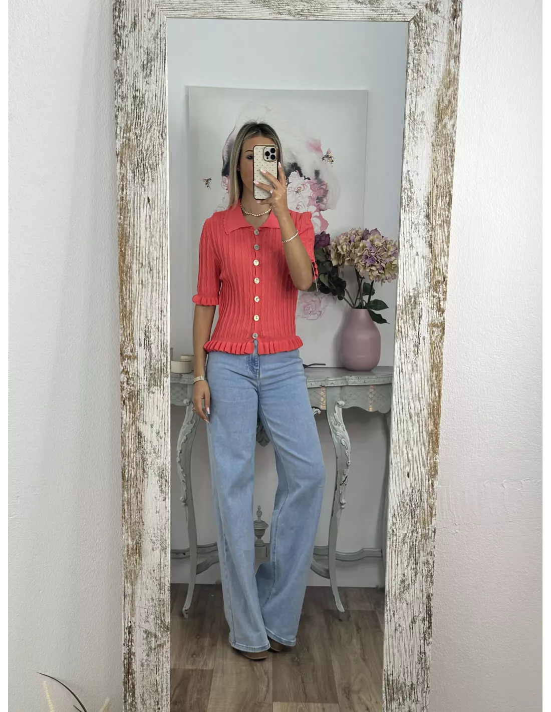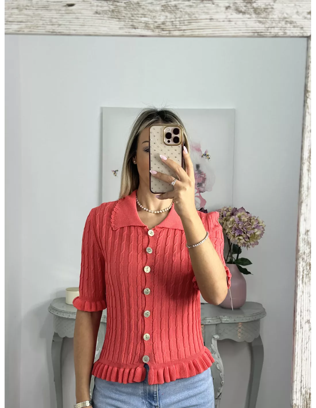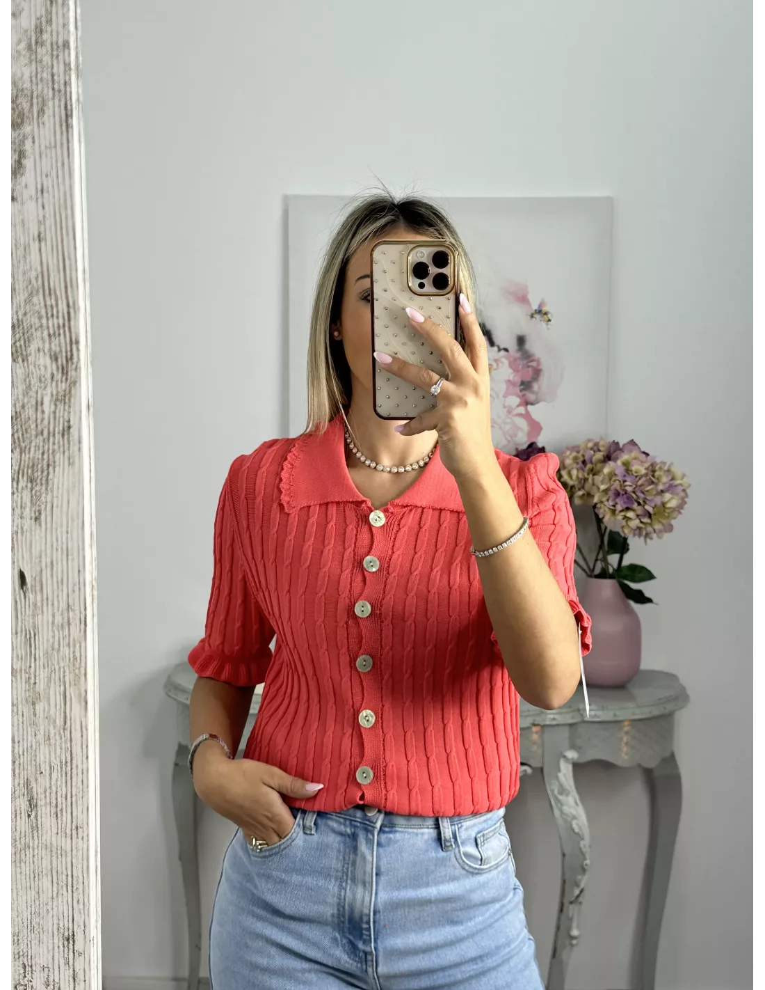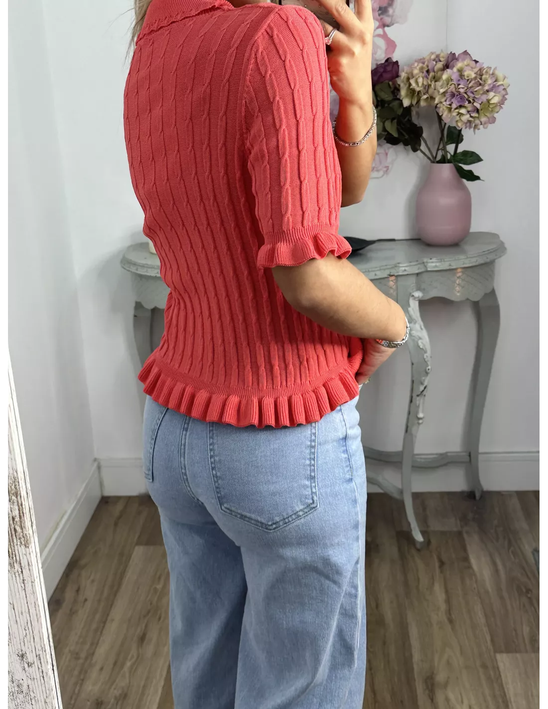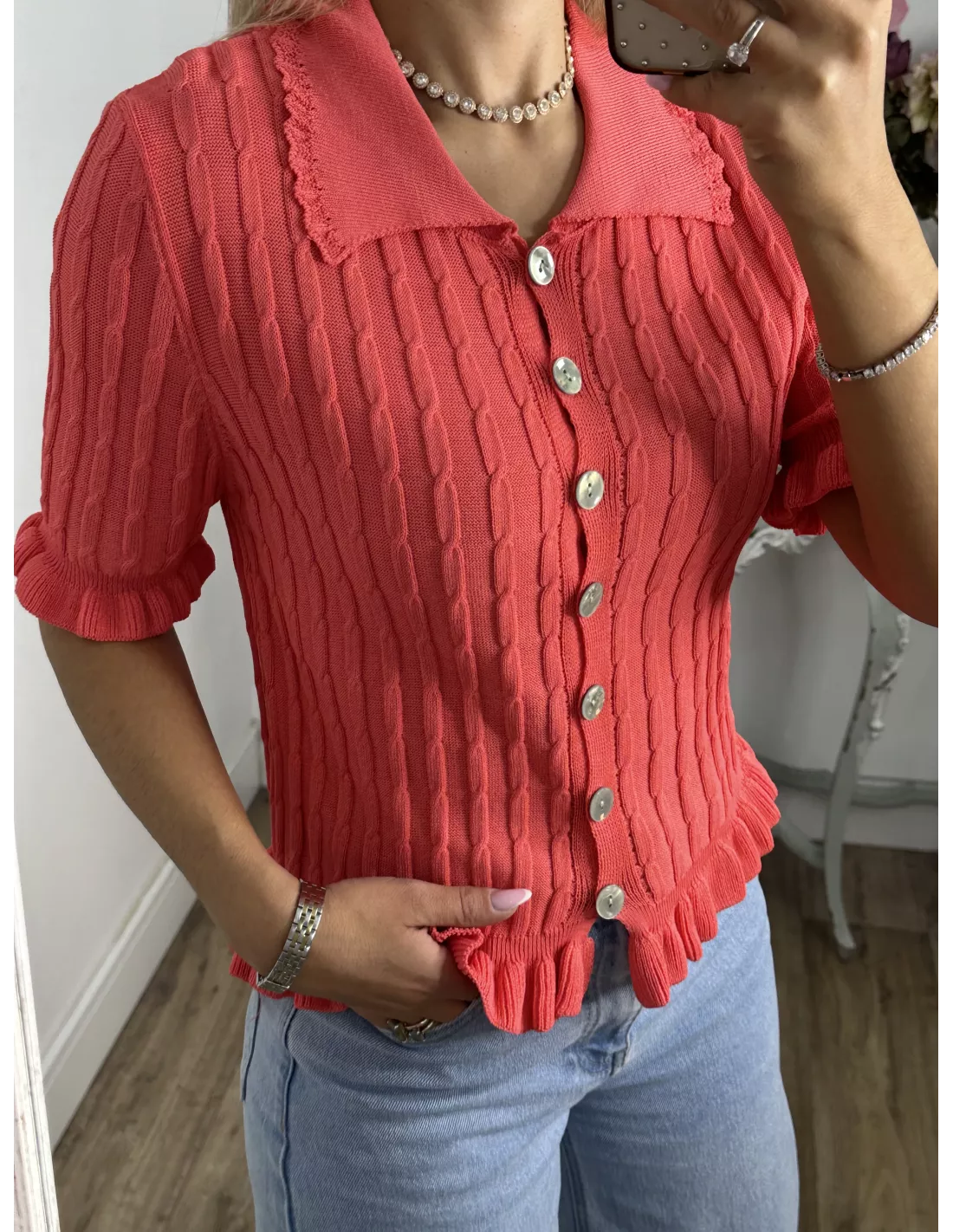 Jersey cuello polo trenzado coral