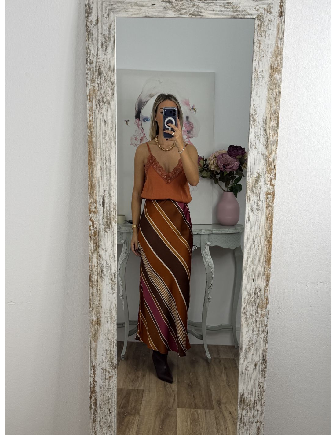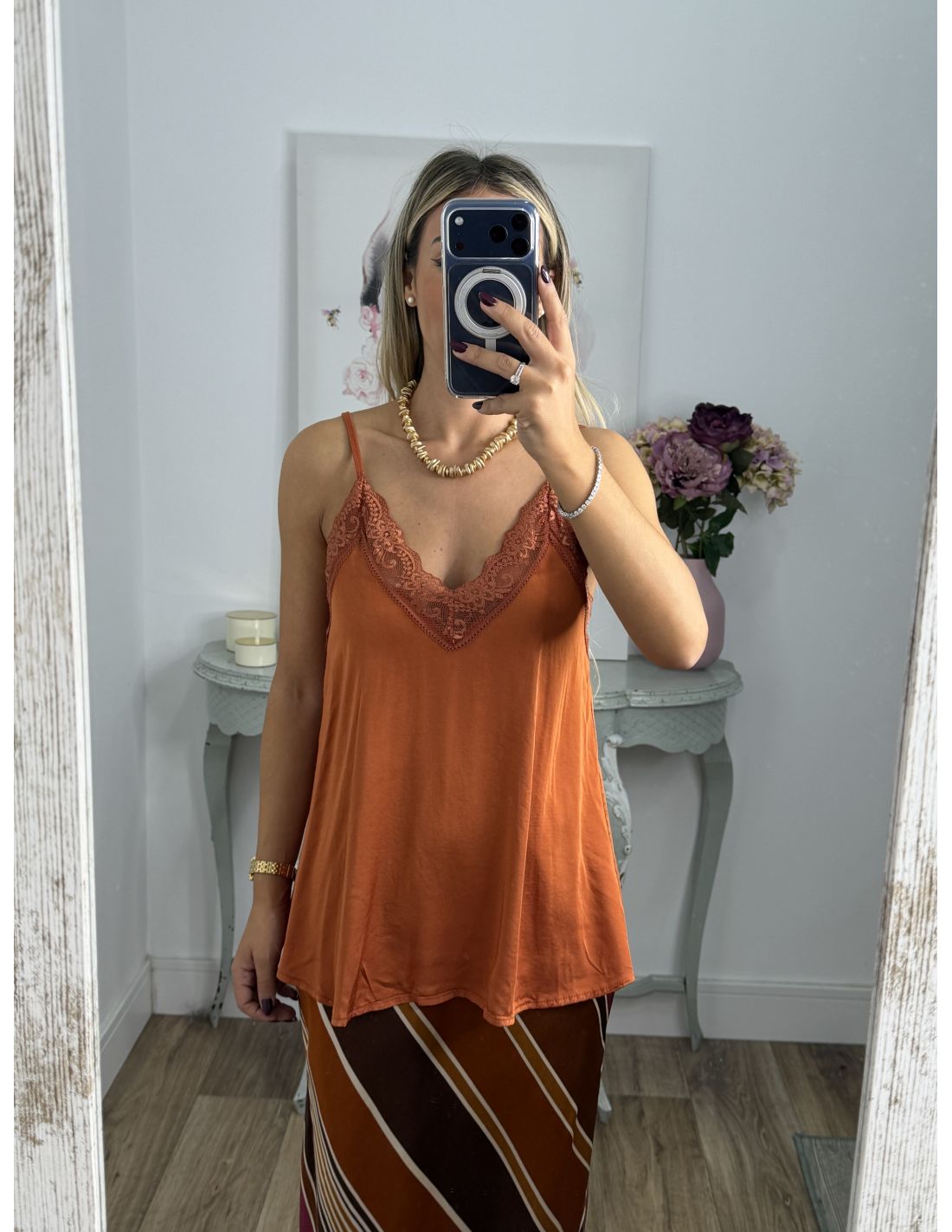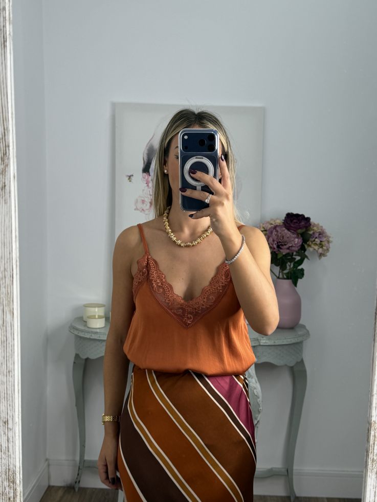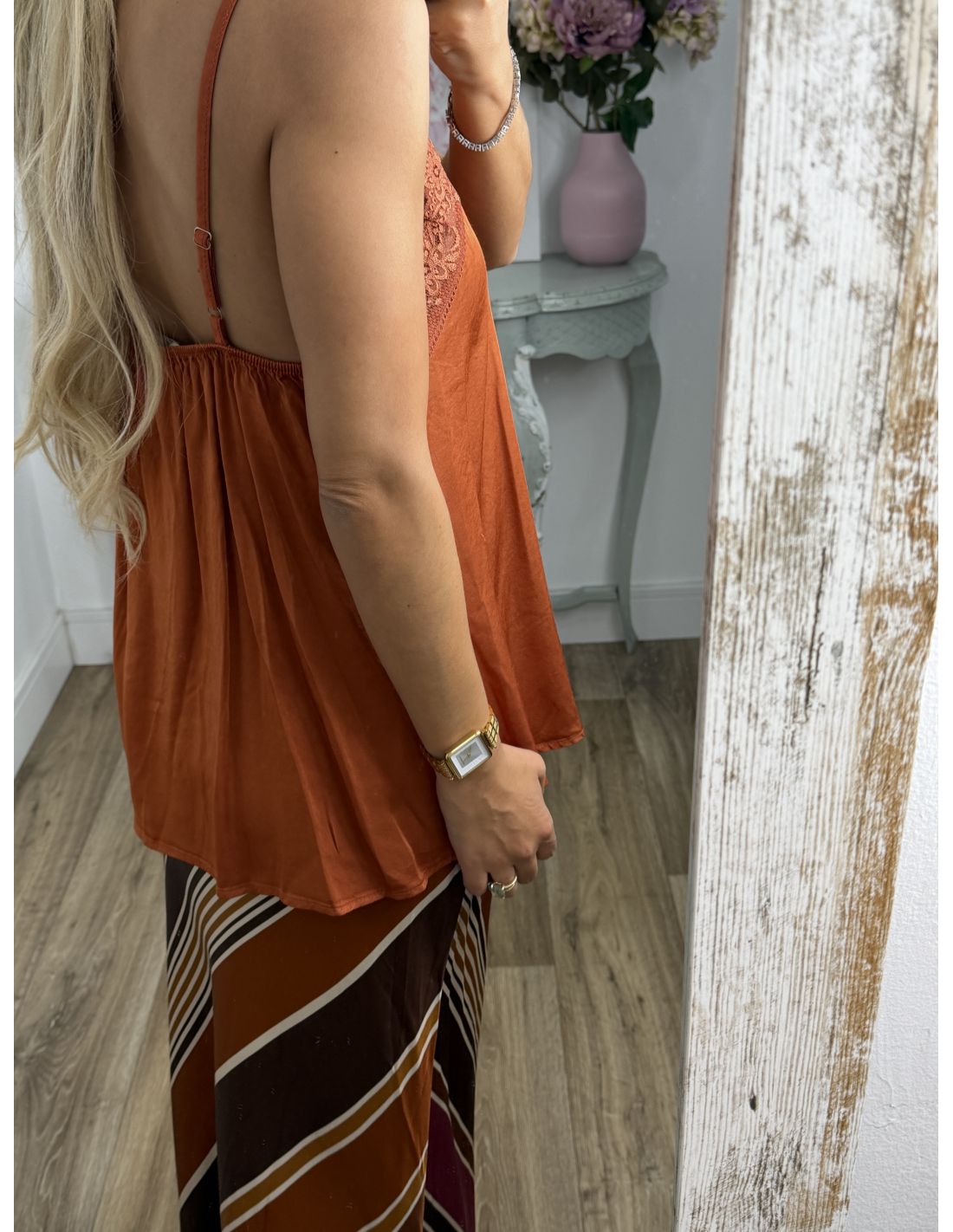 Lencera de tejido satinado con tiranta regulable. La parte de atrás lleva goma.