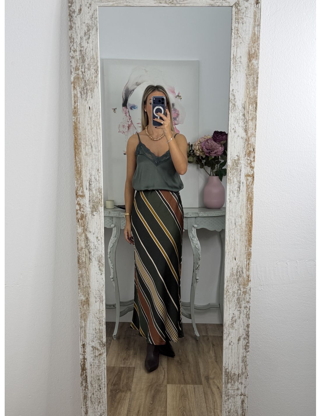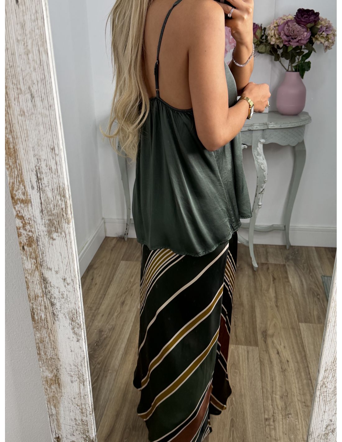 Medidas: Sisa sin estirar: 32 cm, Sisa estirada: 52cm, Largo desde la sisa: 38cm, Largo desde la tiranta: 63cm