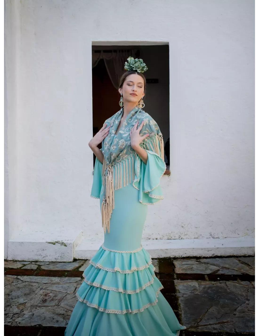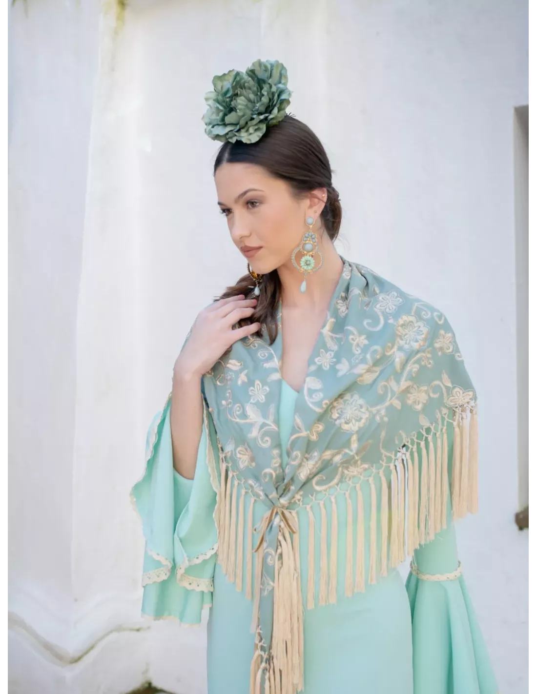 Mantón Rocio bordado verde agua y beige