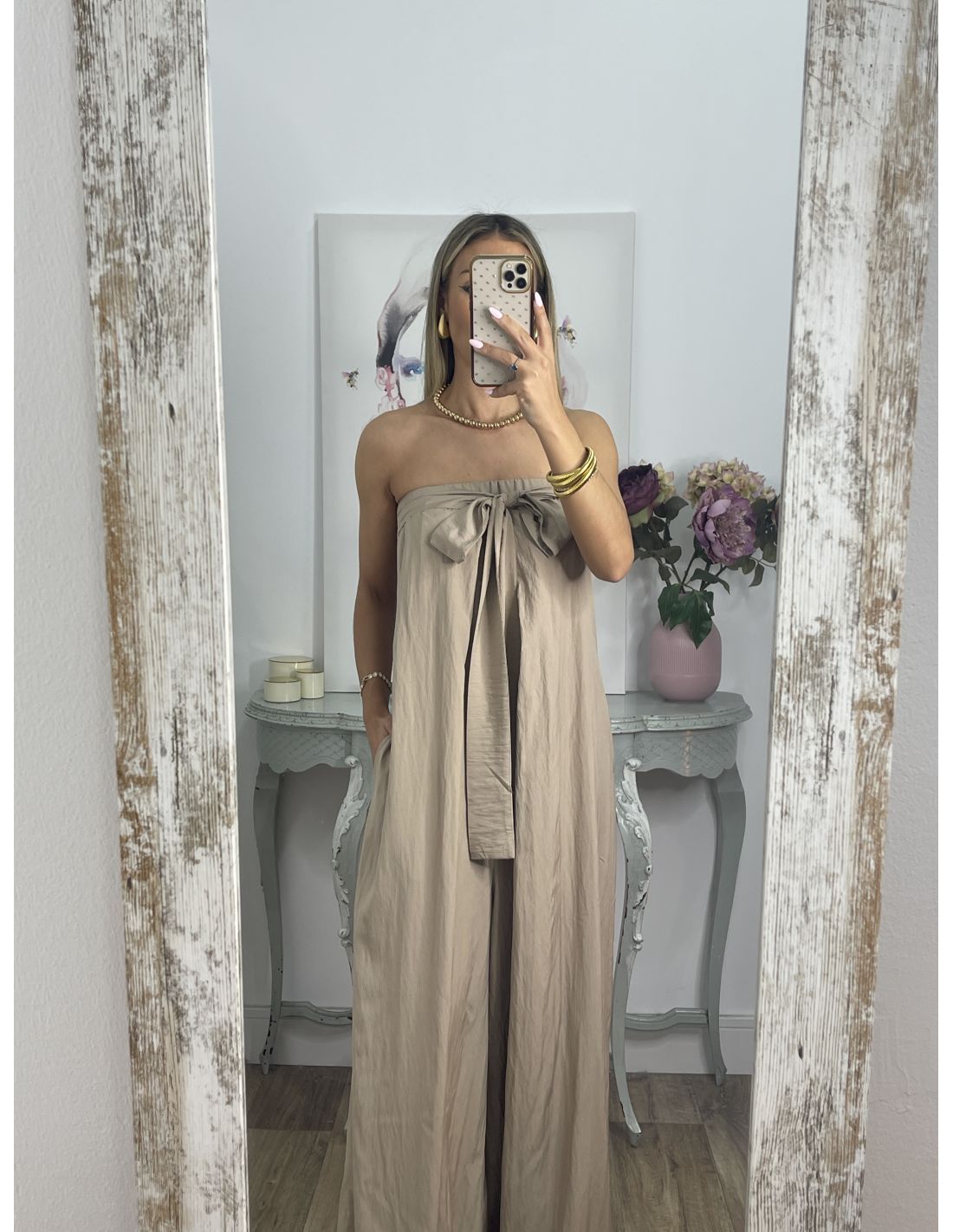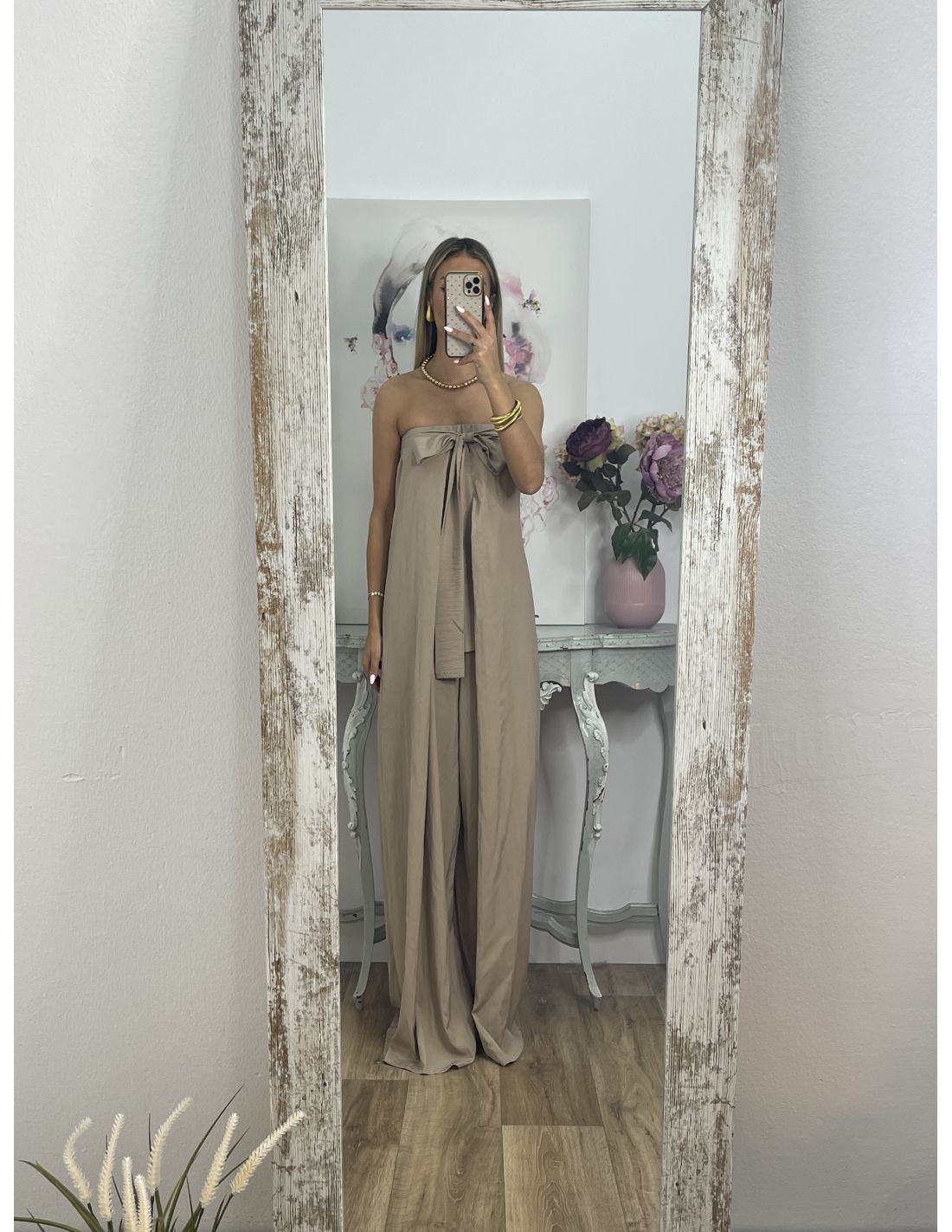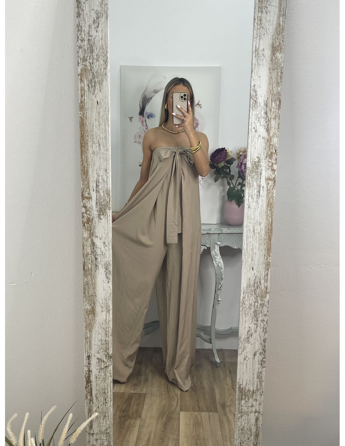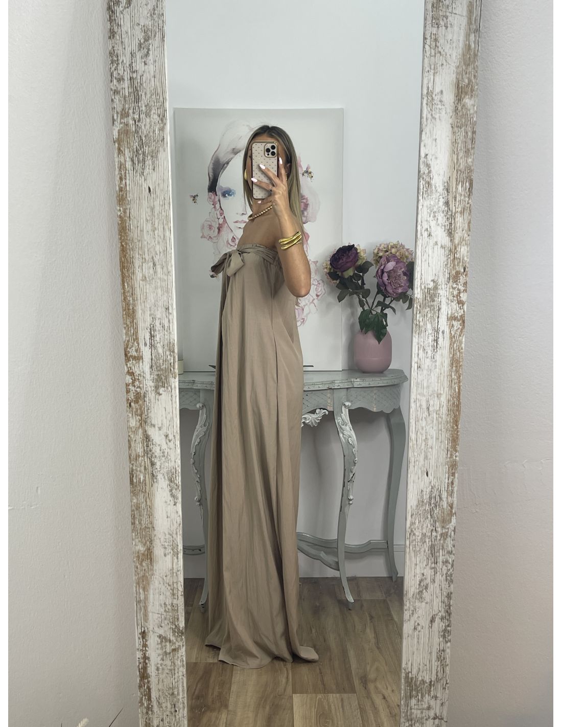 Mono palabra de honor de corte muy amplio. Lleva goma en la zona de arriba. Desde la costura lateral salen dos tiras que se pueden anudar tanto en la parte delantera con una lazada como en la parte de atrás. El mono es bastante largo, La chica que son altas no van a tener problema.