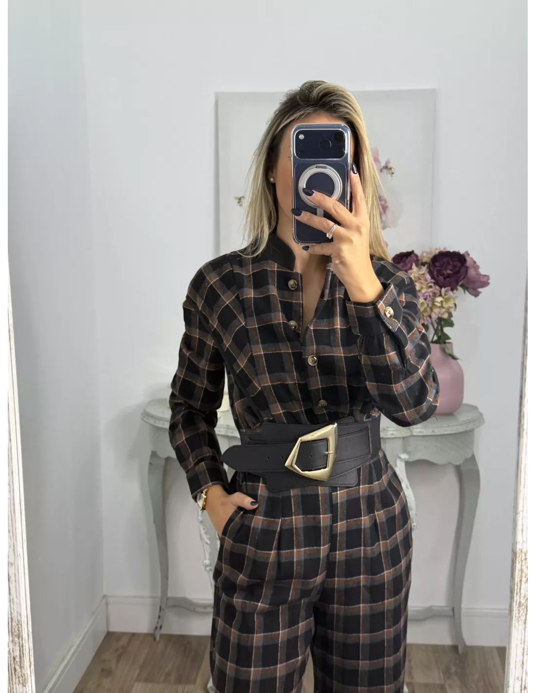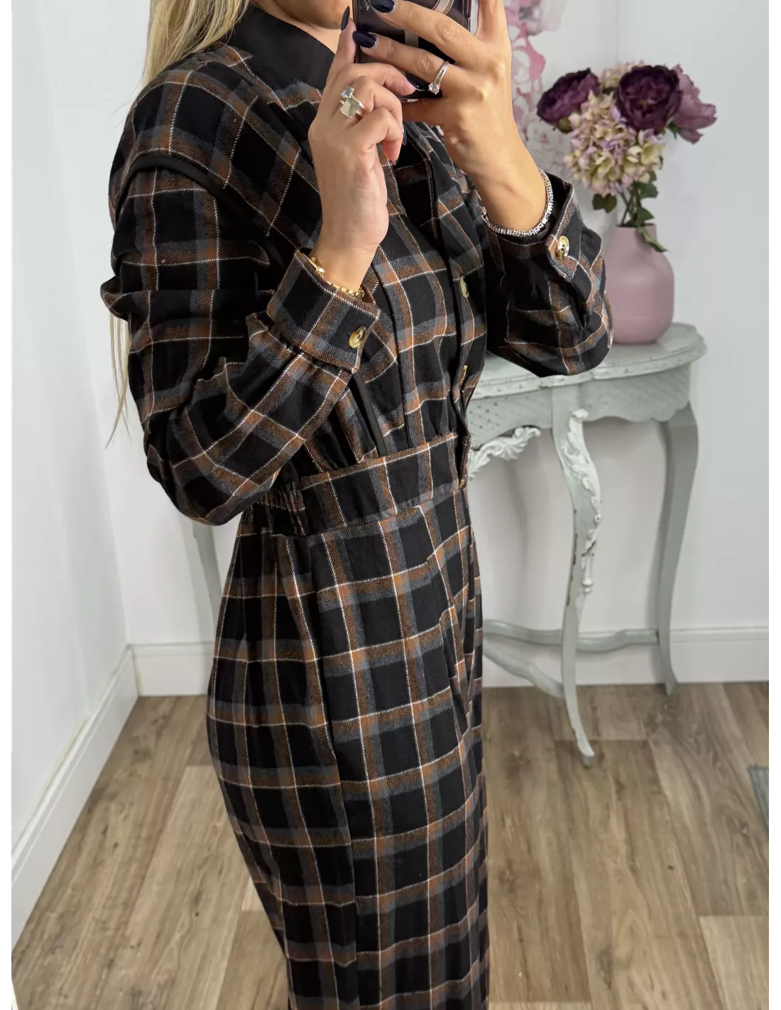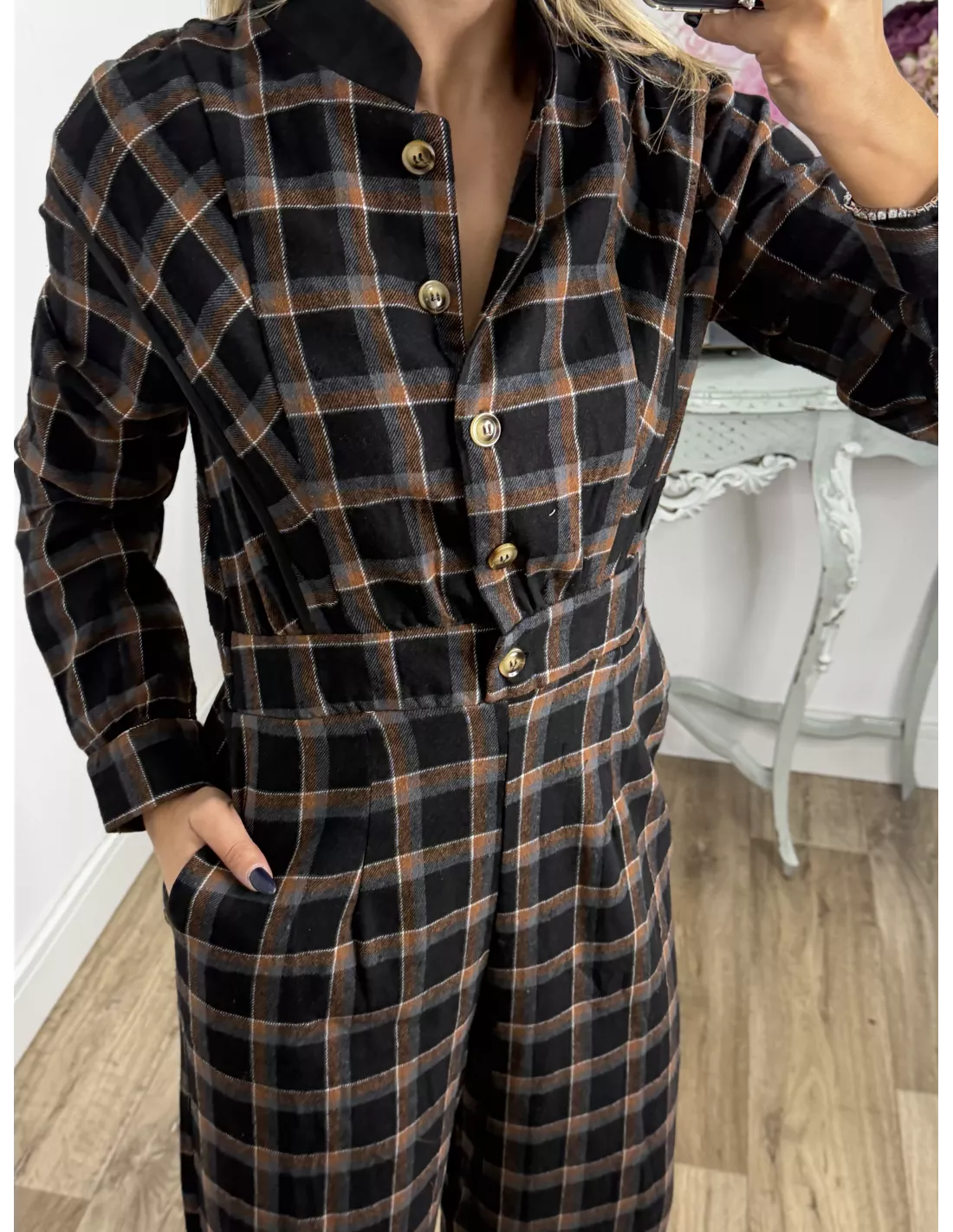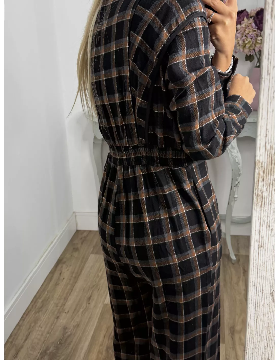 Mono de cuadros con cuello de tirilla. La parte delantera es abotonada. Tiene goma en la parte de atrás de la espalda.