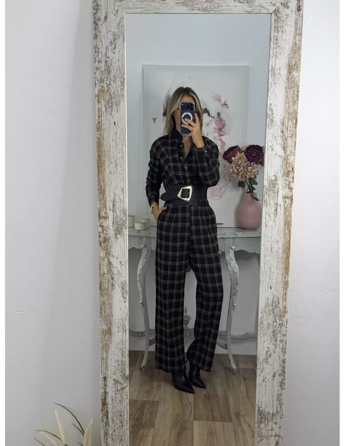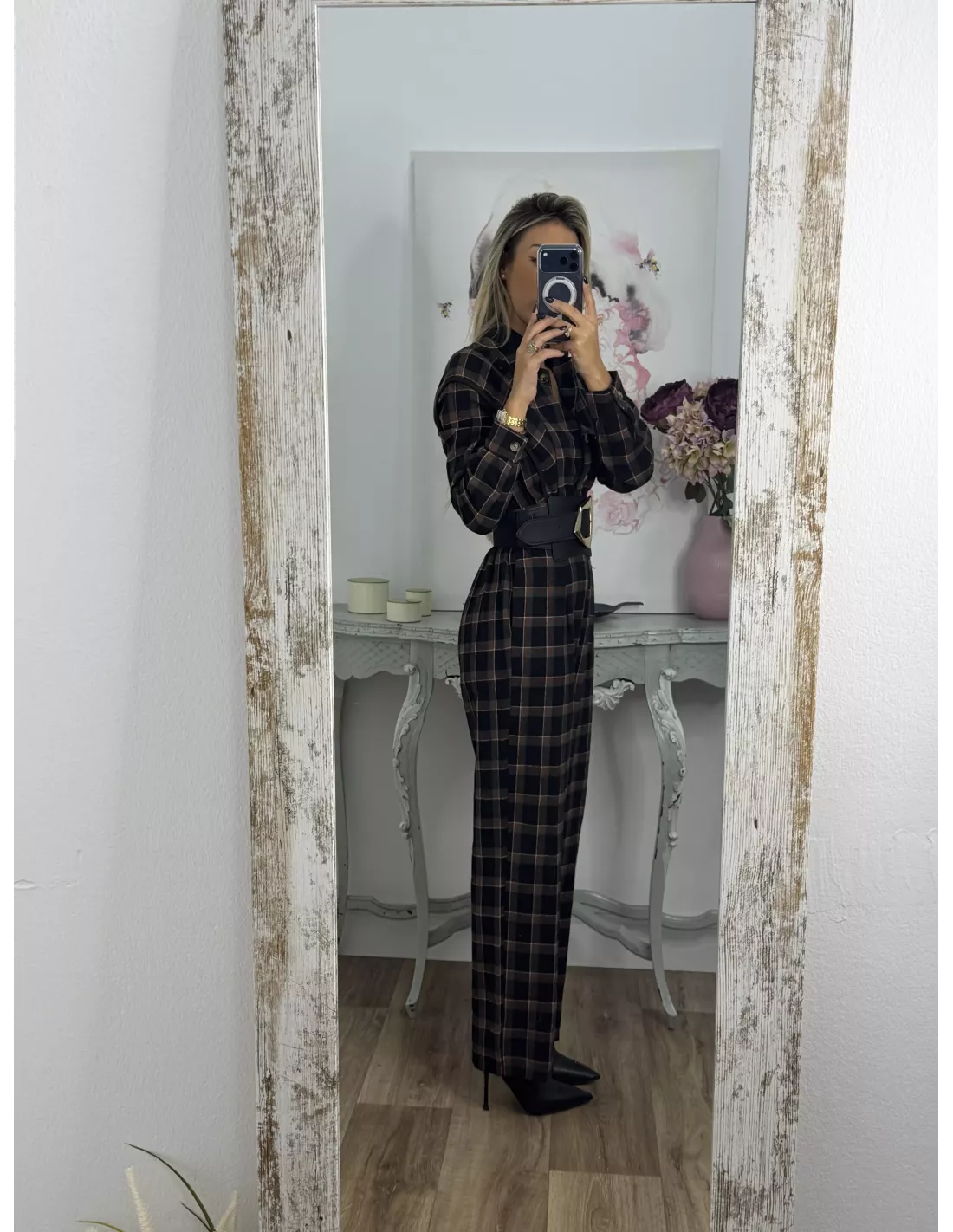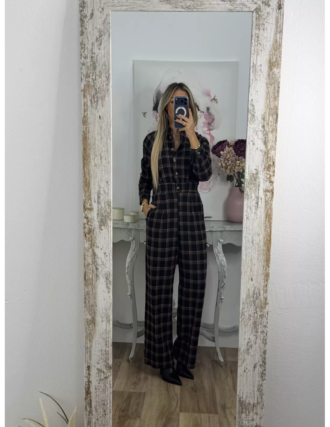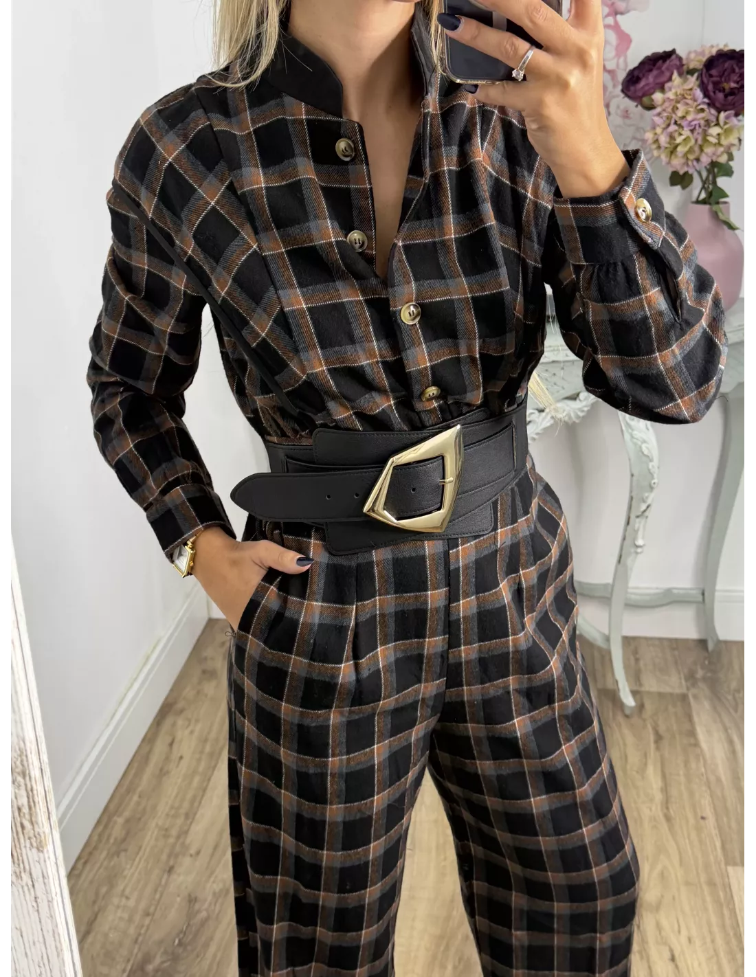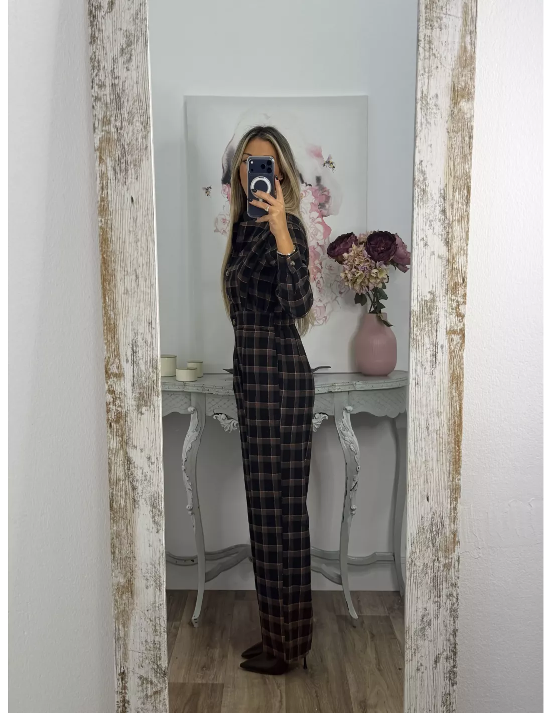 Mono de cuadros con cuello de tirilla. La parte delantera es abotonada. Tiene goma en la parte de atrás de la espalda.