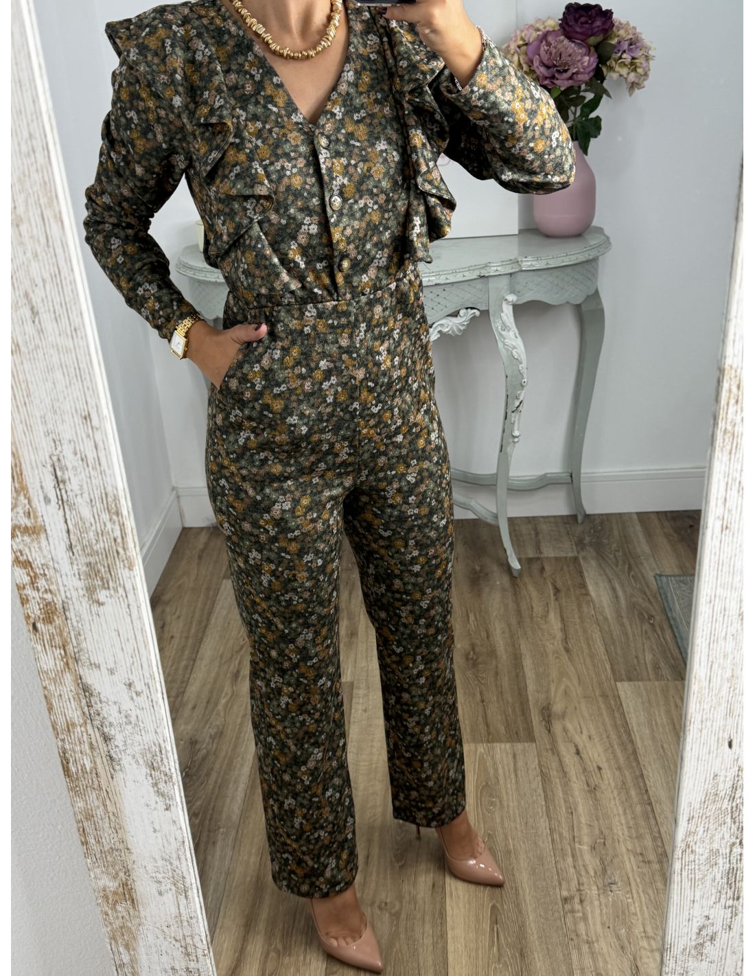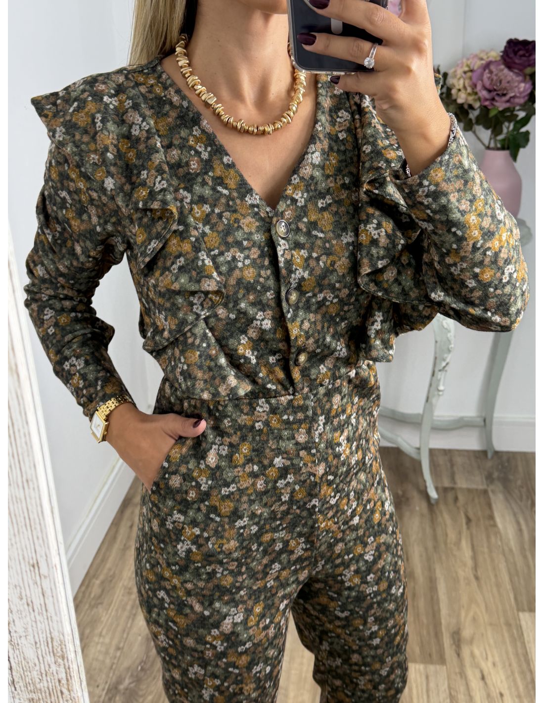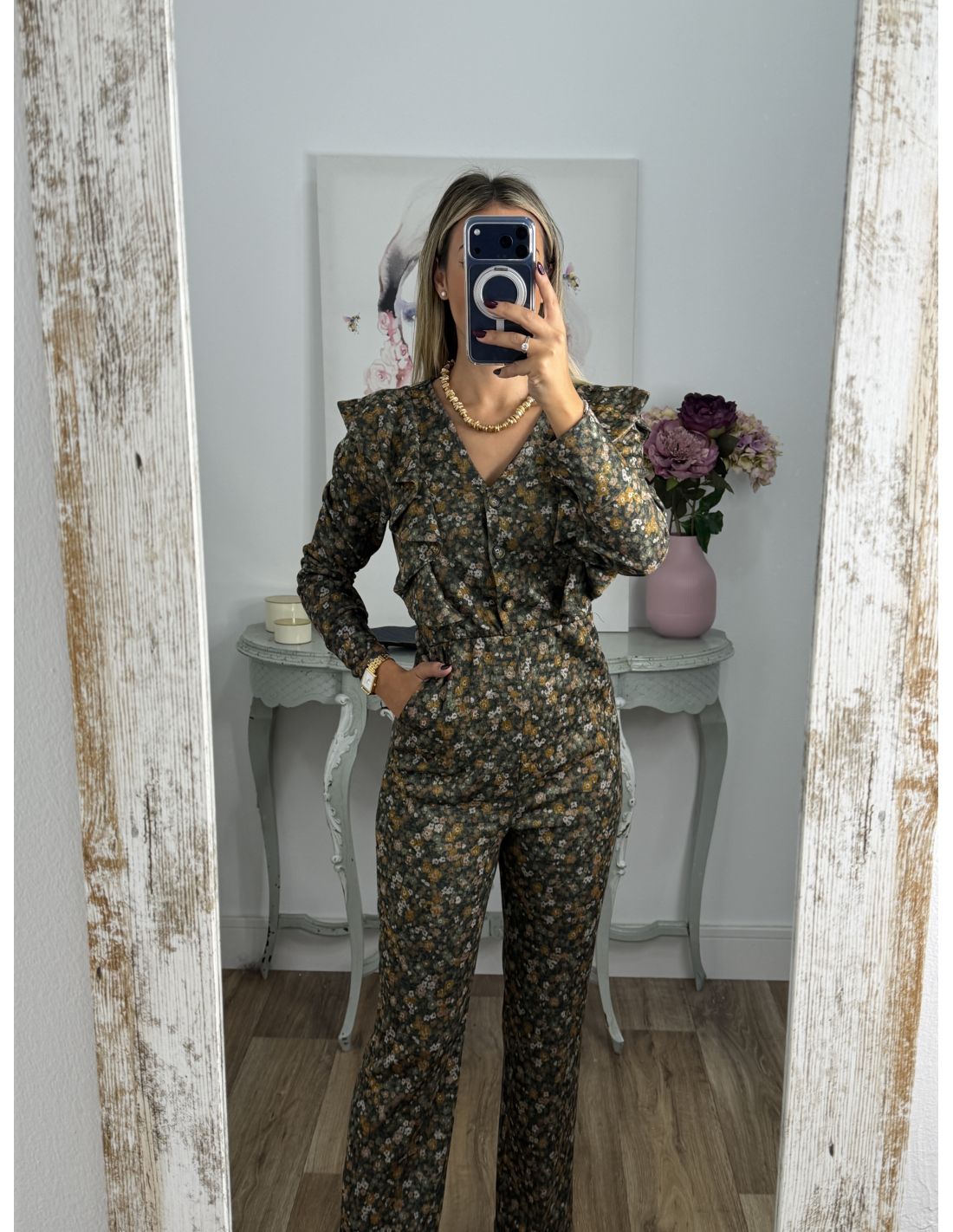 Mono de floress con cuello a la caja abatanado, con volante en la zona del pecho. LAS CHICAS ALTAS MIRAR LA MEDIDA DEL TIRO PARA QUE ESTEN COMODAS.