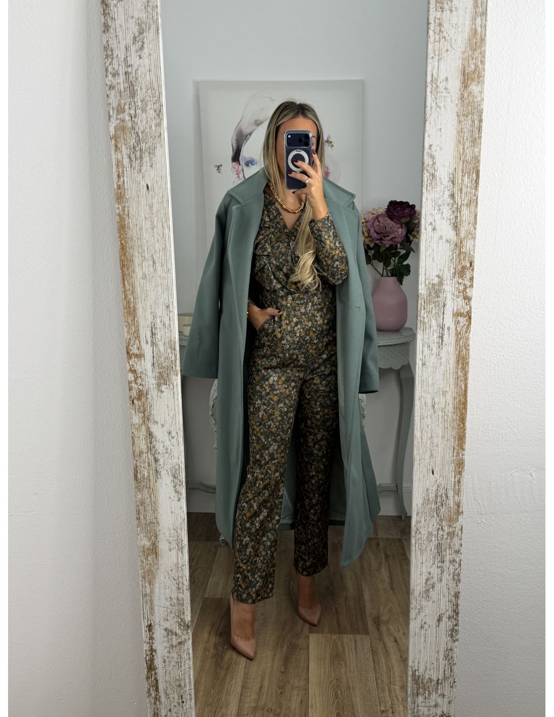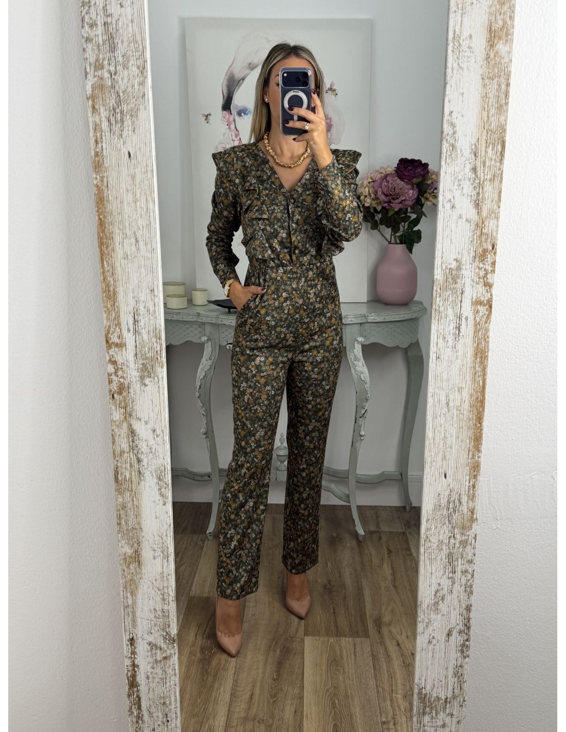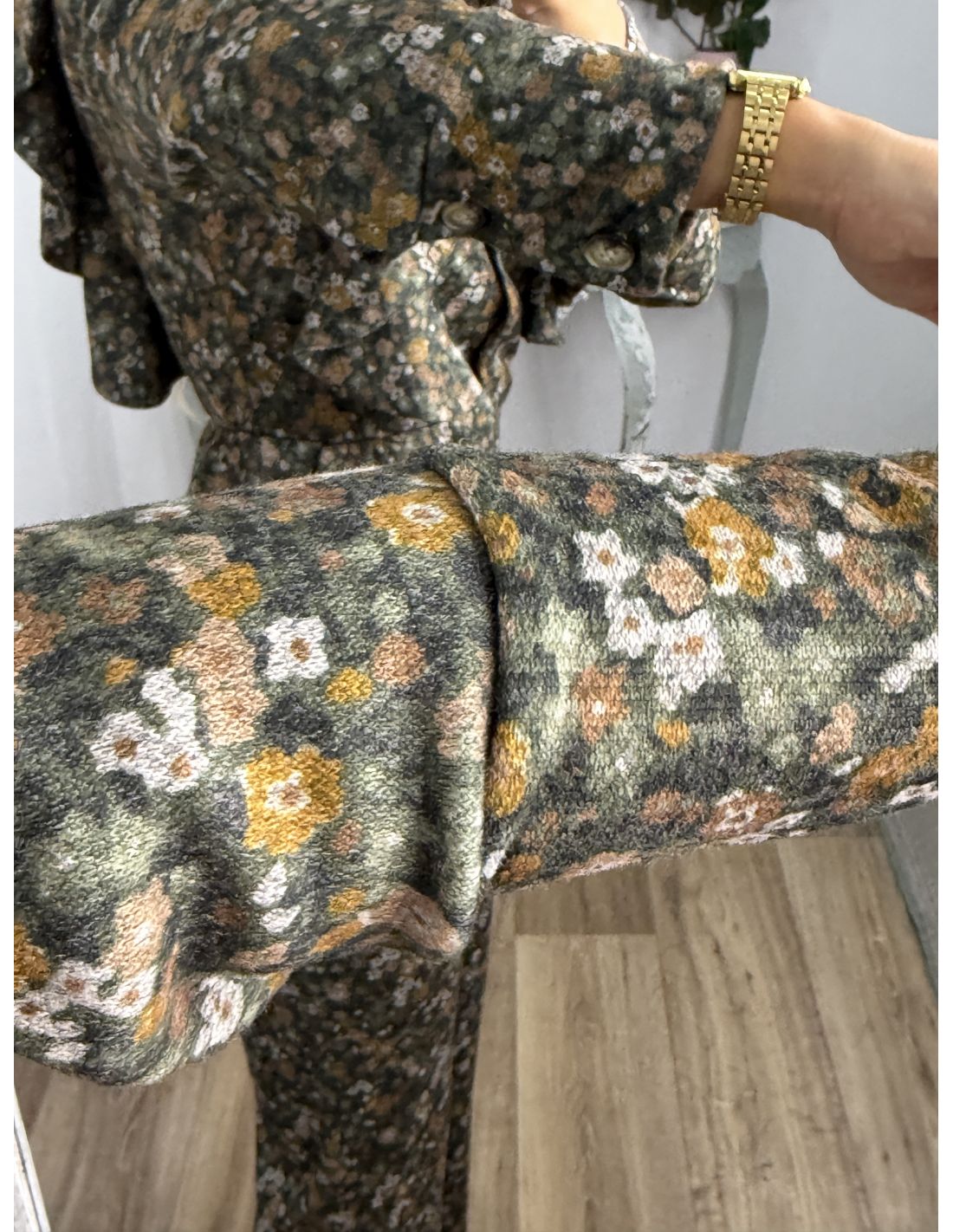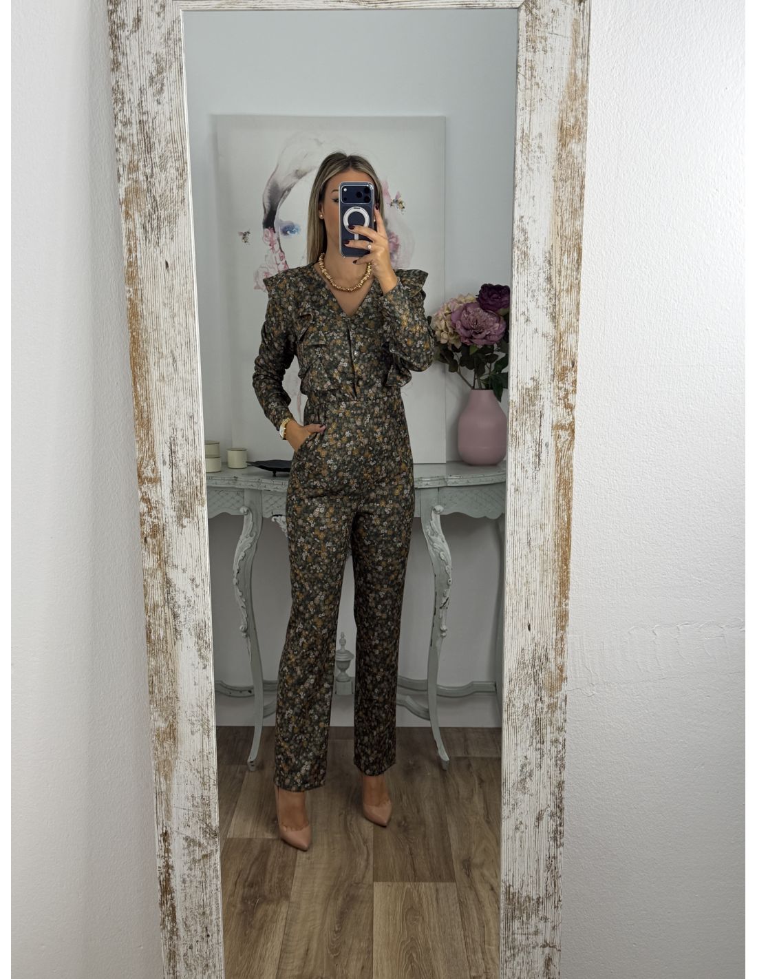 Mono de floress con cuello a la caja abatanado, con volante en la zona del pecho. LAS CHICAS ALTAS MIRAR LA MEDIDA DEL TIRO PARA QUE ESTEN COMODAS.