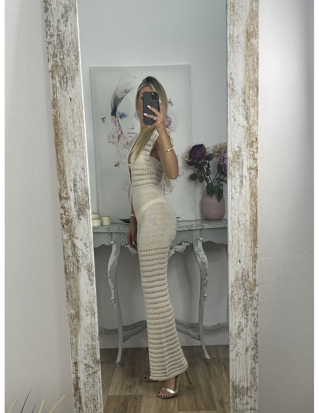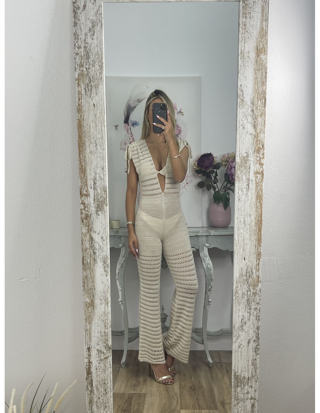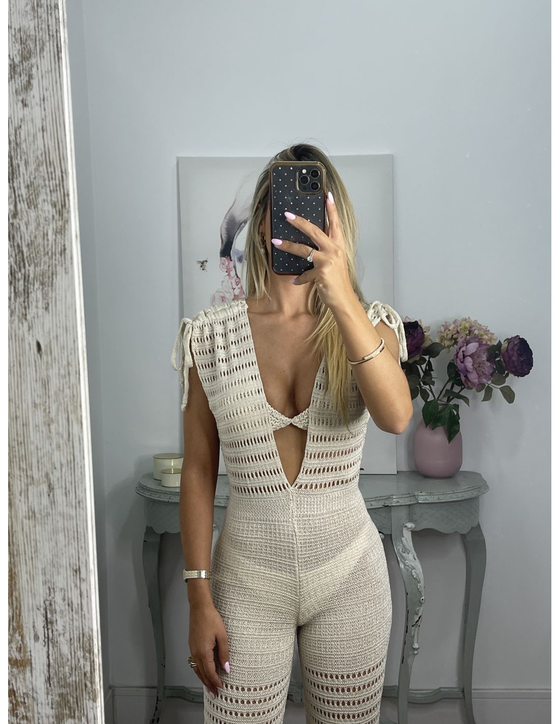 Mono de hilo calado, no va forrado. La zona del cuelte el hilo es más tupido. Tiene escote en V tanto en la parte delantera como en la parte de atrás.