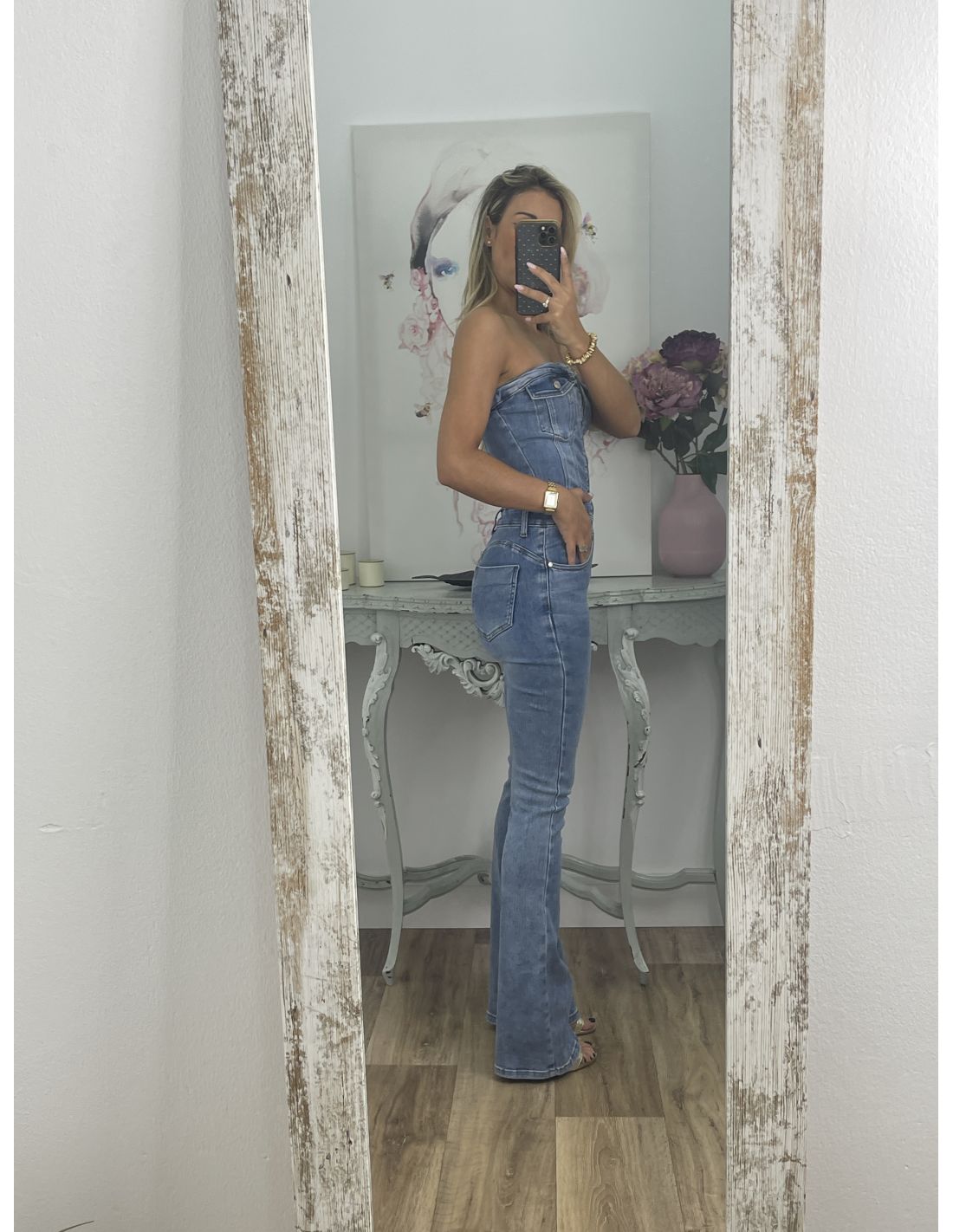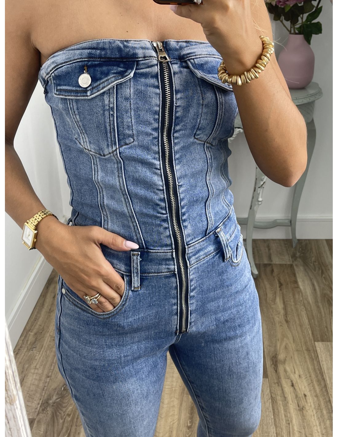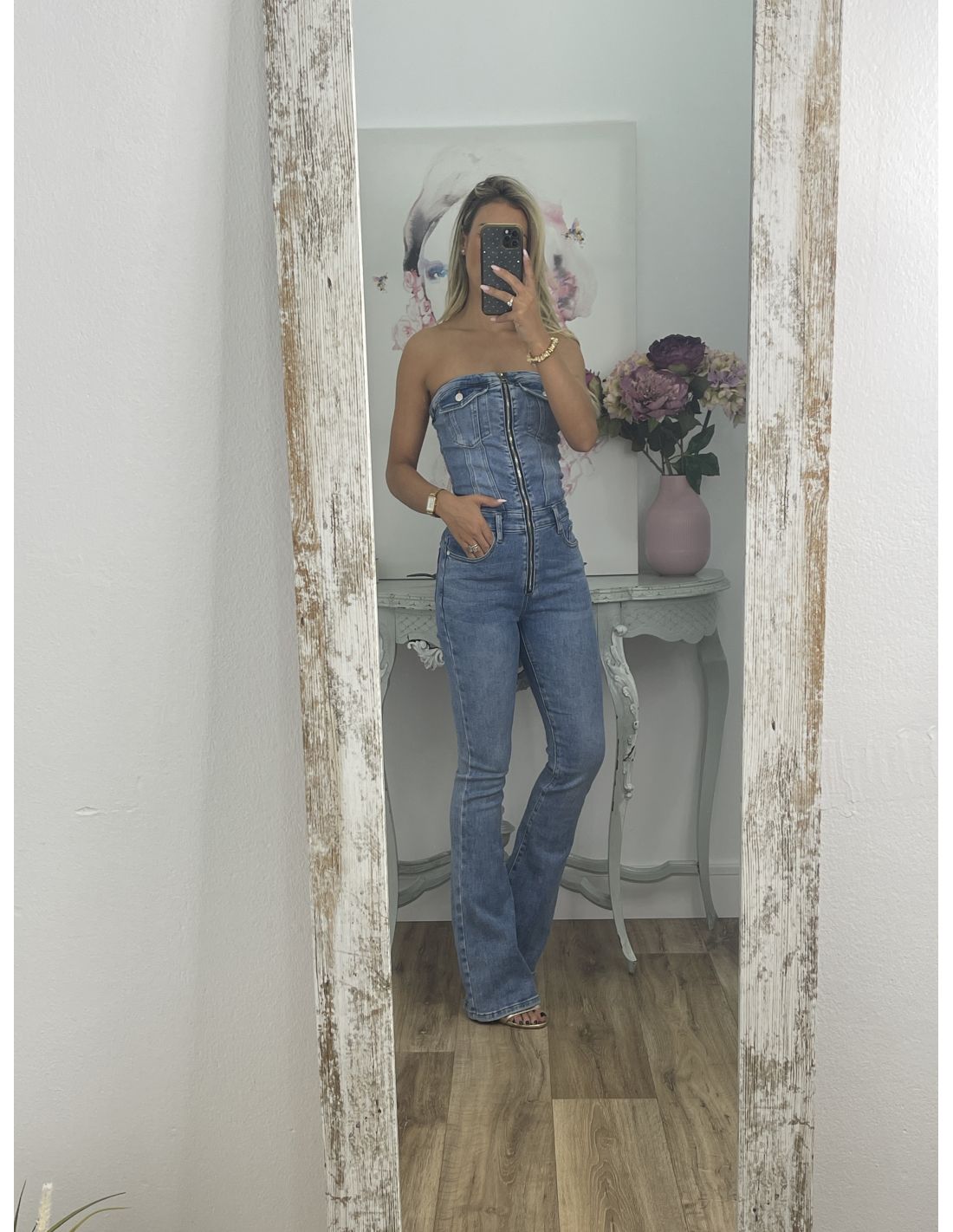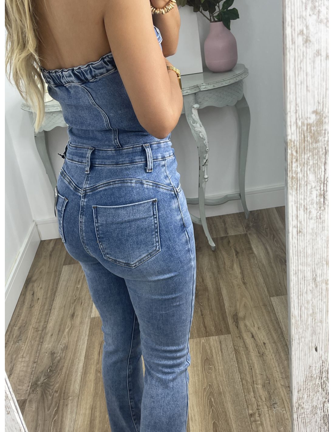 Mono vaquero palabra de honor que se cierra con cremallera plateada en la parte delantera. El corte es ajustado. ¡ OJO, LAS CHICAS ALTAS, MIRAR LA MEDIDA DEL LARGO! El tejido es elástico. Si estás entre dos tallas coger la talla más pequeña, si te gusta ajustado coger una talla menos de la habitual.