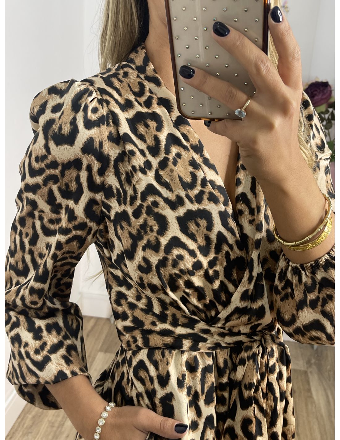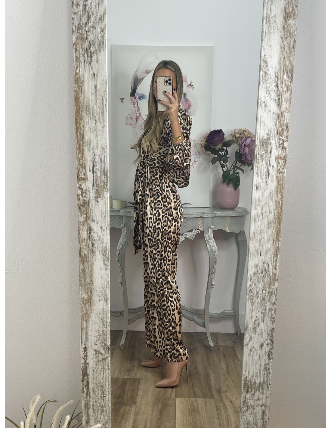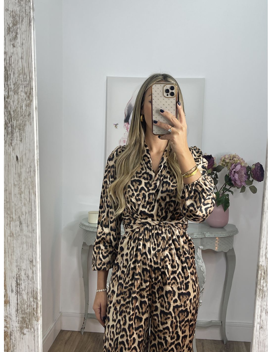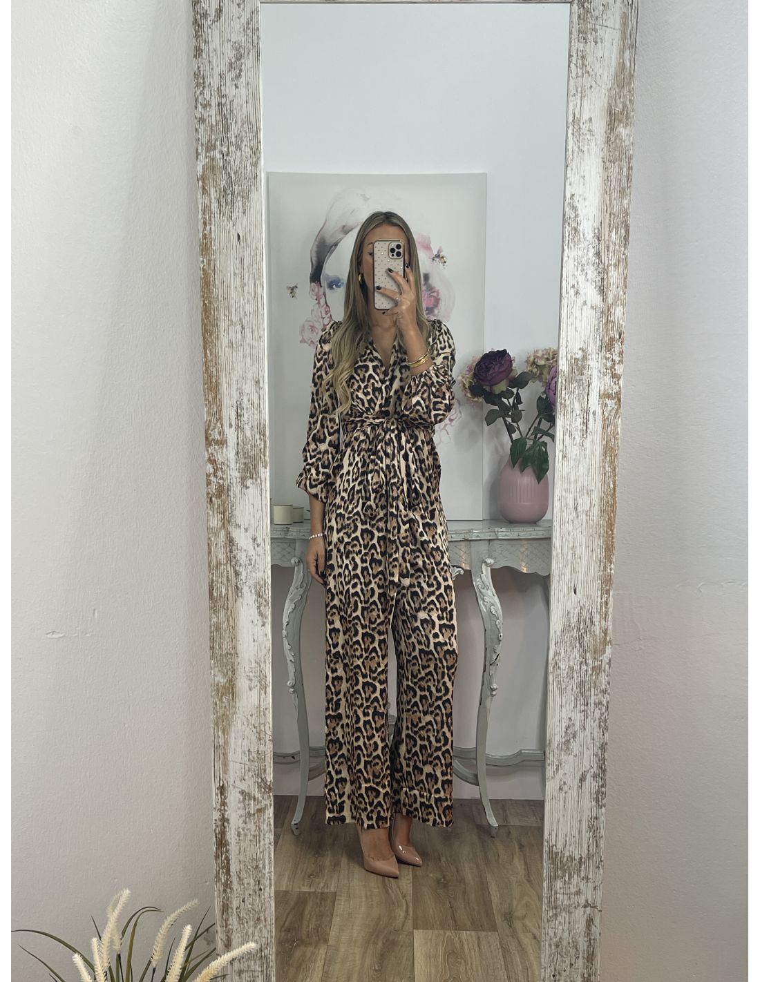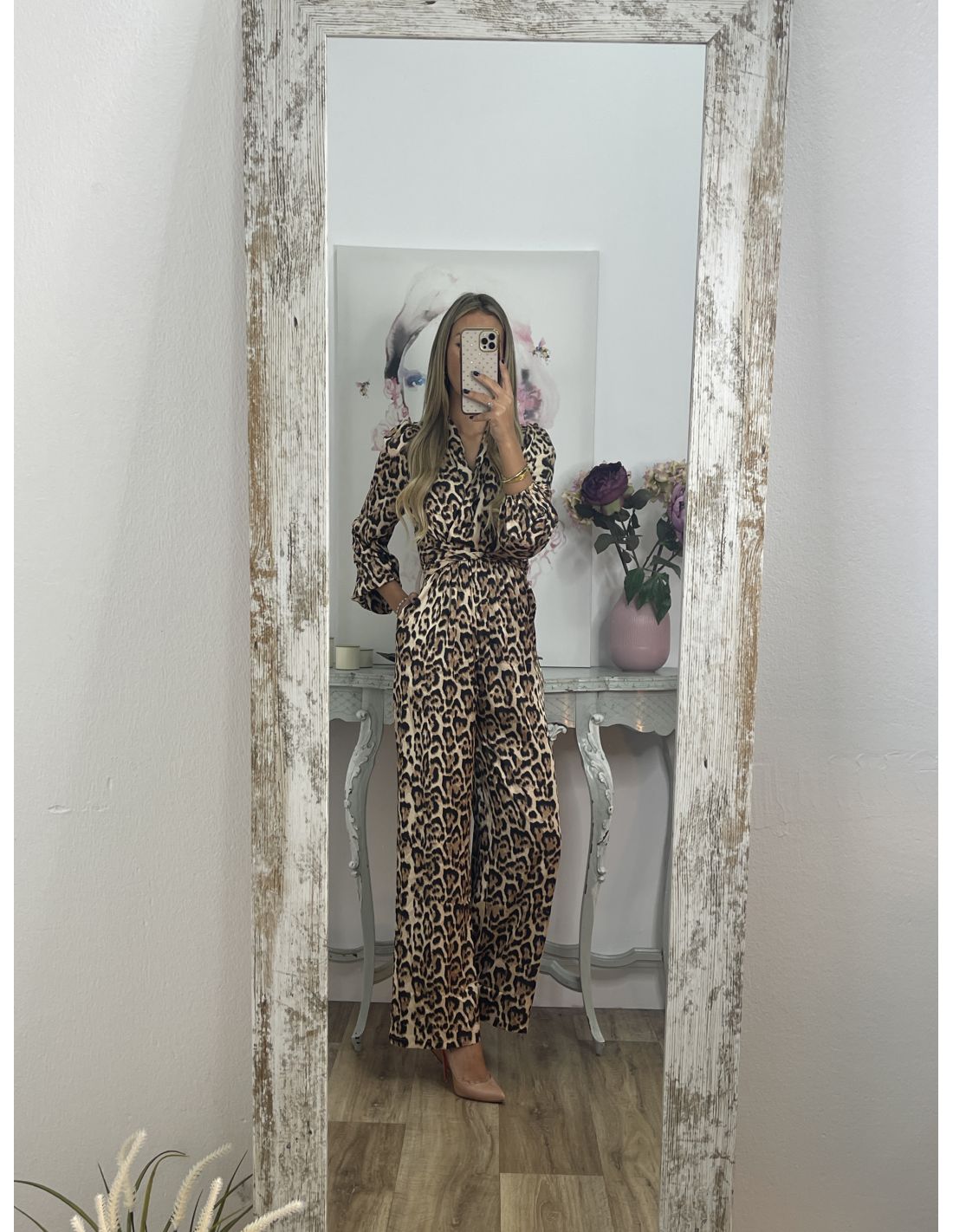 Mono de animal print de corte culote. Lleva manga farol y en el puño lleva una goma. Tiene hombreras y se cierra en la parte de atrás en el centro con cremallera invisible. El mono tiene el corte en la cintura con escote cruzado y goma en la parte de atrás de la cintura. En las costuras laterales de la cintura lleva dos tiras del mismo tejido para anudarlo tanto en la parte delantera como en la parte de atrás.