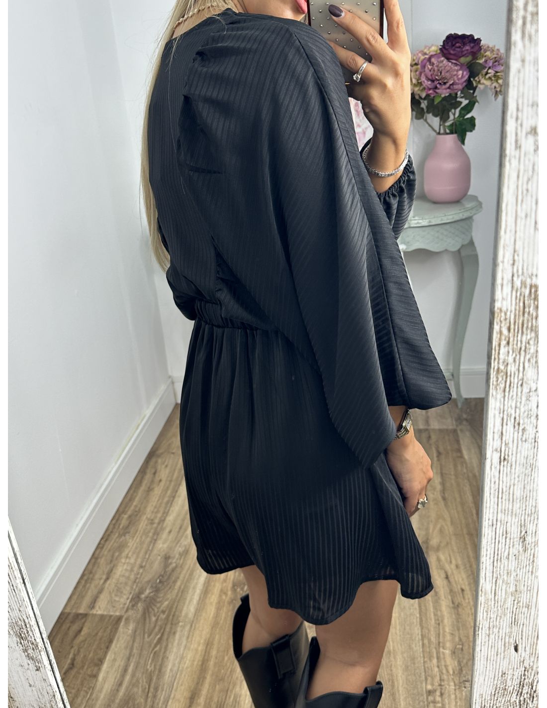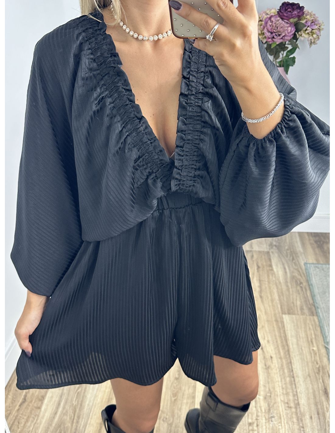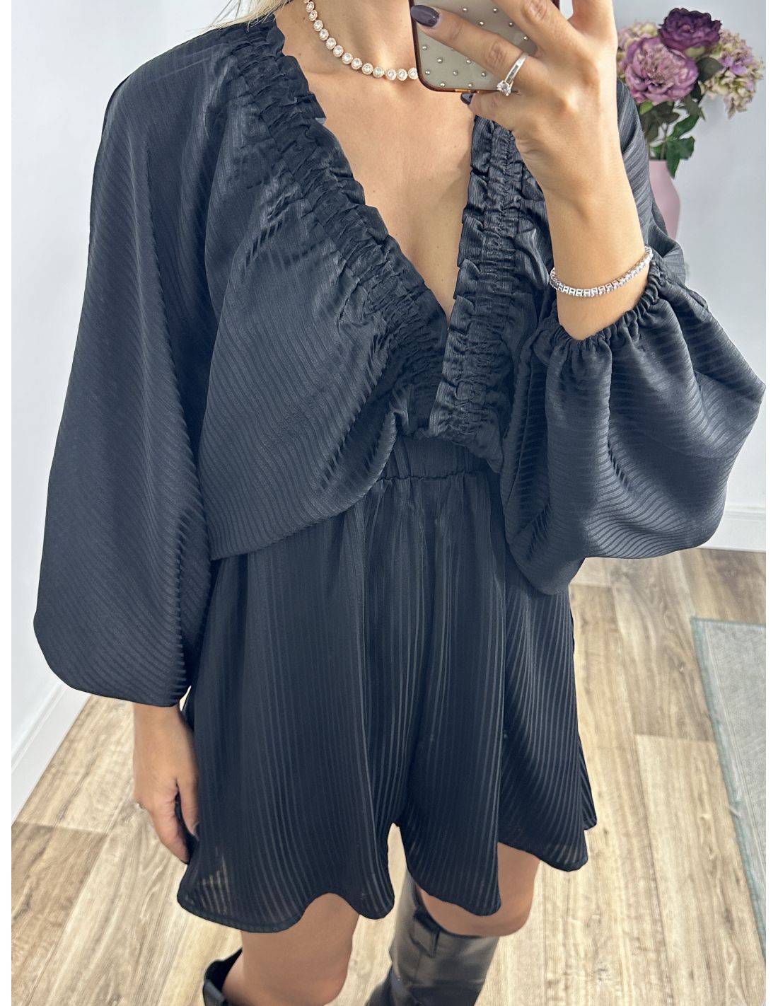 Mono de manga tipo murcielago, con escote en V. Lleva corte debajo del pecho que es una goma. La zona del pantalón queda suelta y va forrada.