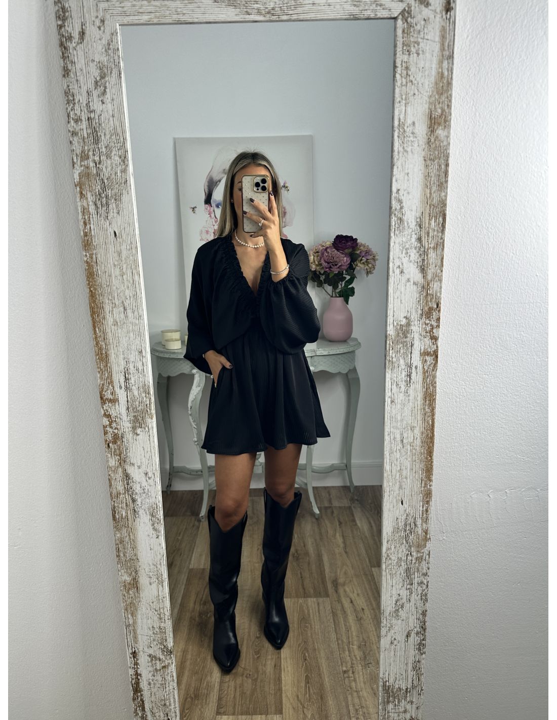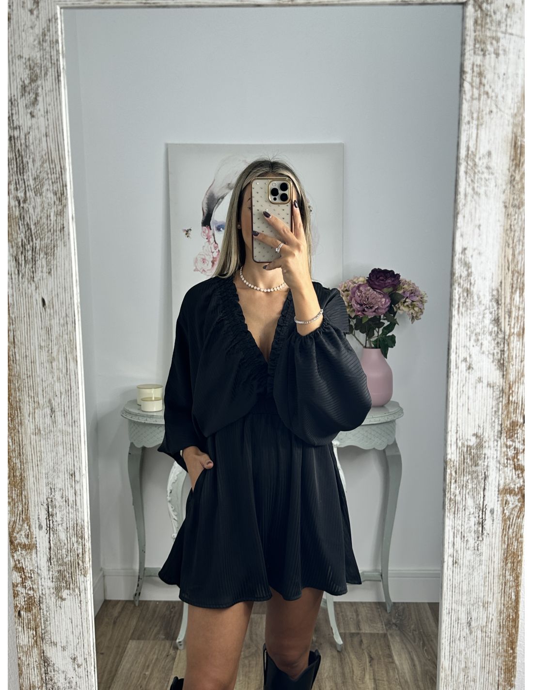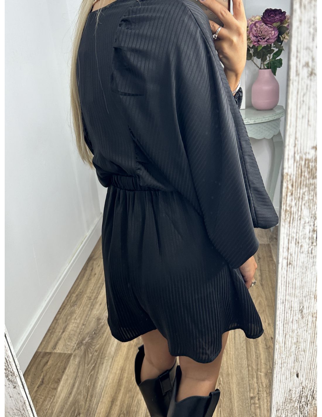 Mono de manga tipo murcielago, con escote en V. Lleva corte debajo del pecho que es una goma. La zona del pantalón queda suelta y va forrada.