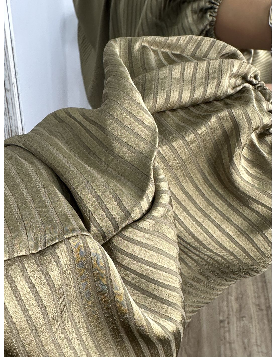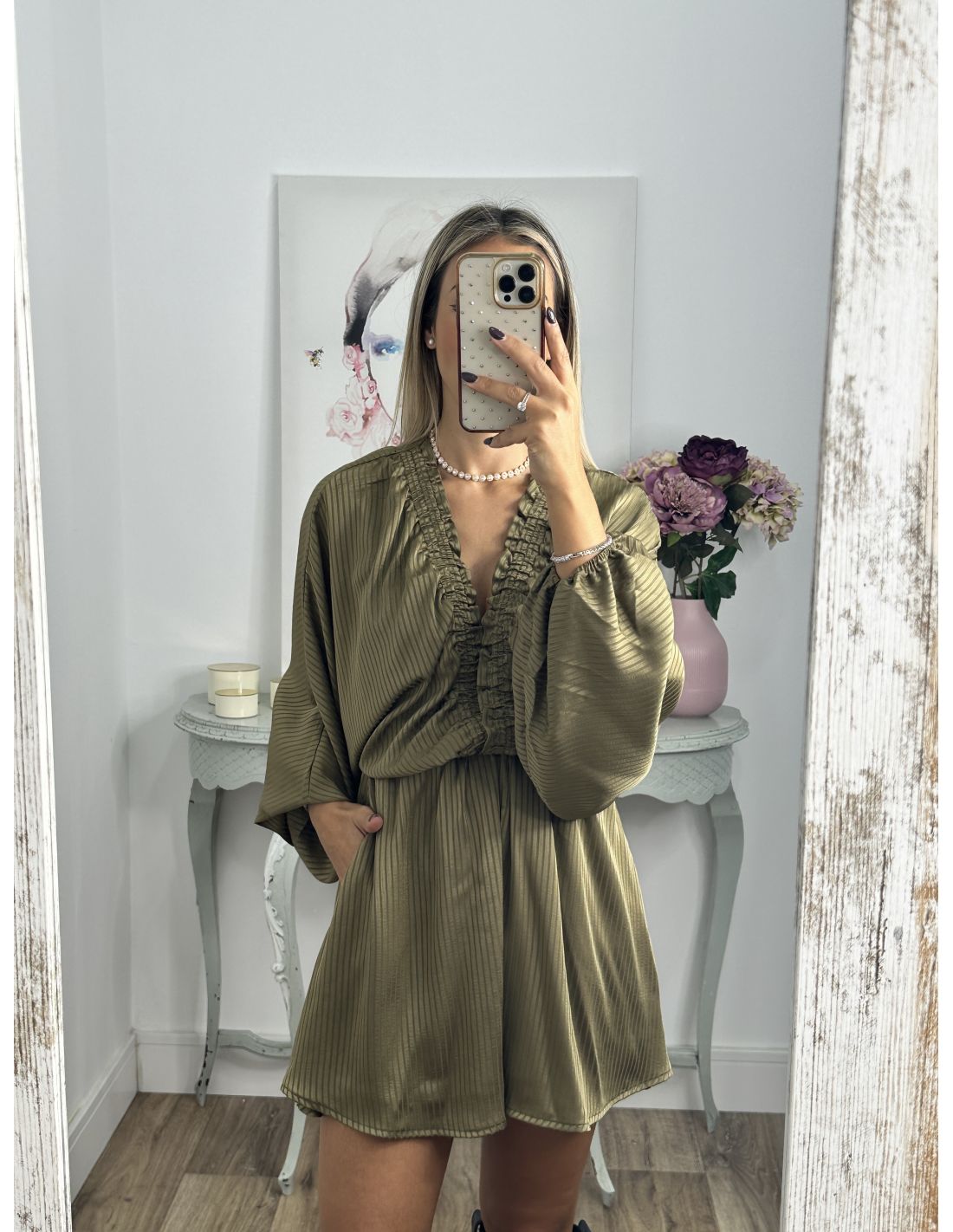 Mono de manga tipo murcielago, con escote en V. Lleva corte debajo del pecho que es una goma. La zona del pantalón queda suelta y va forrada.