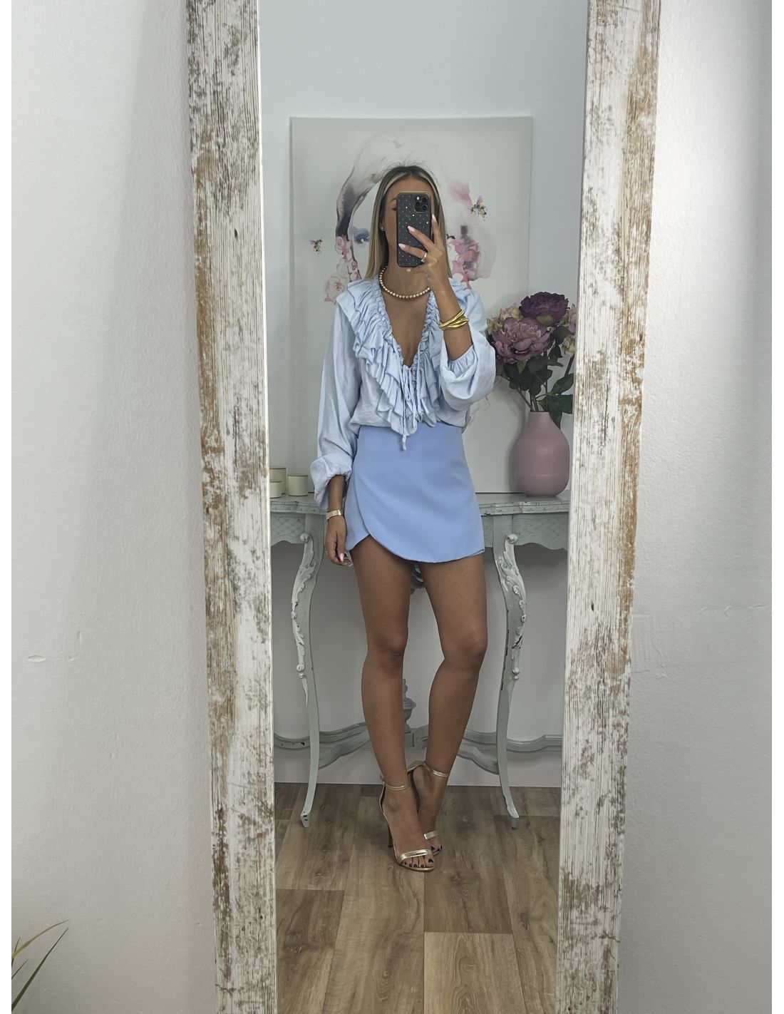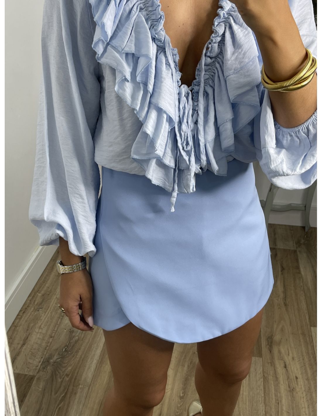 Falda pantalón, la parte delantera es tipo falda y la parte de atrás es como un pantalón (no parece una falda) lleva cremallera invisible en la parte de atrás en el centro. Lleva pinzas en la parte de atrás.