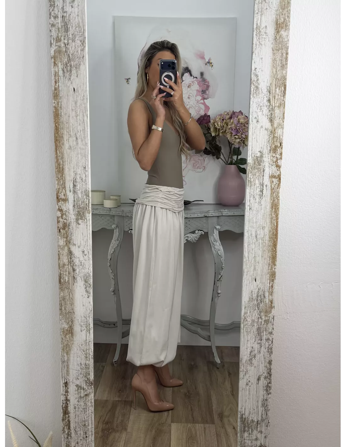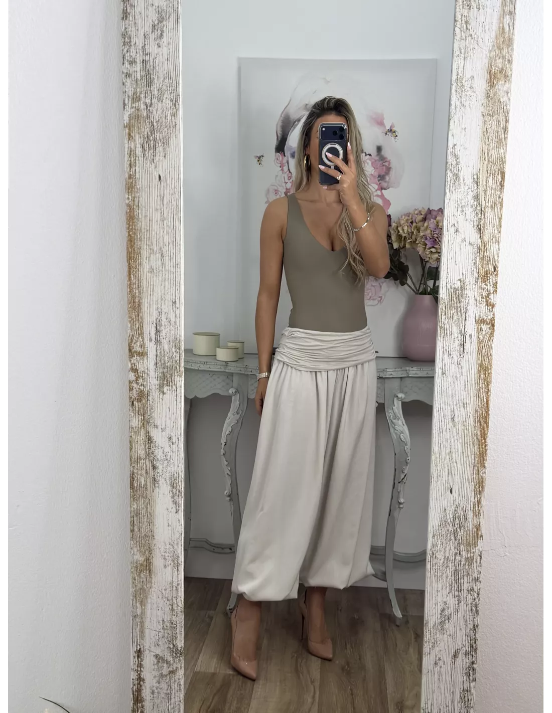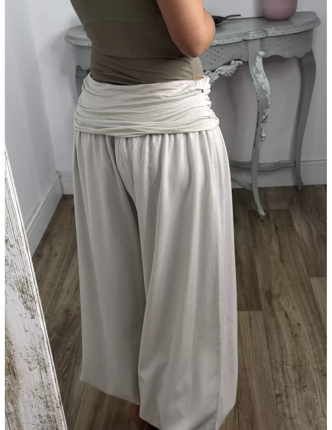 Pantalón bombacho ancho. LLeva goma en la parte de abajo. Las cintura es de algodón, otro tejido.