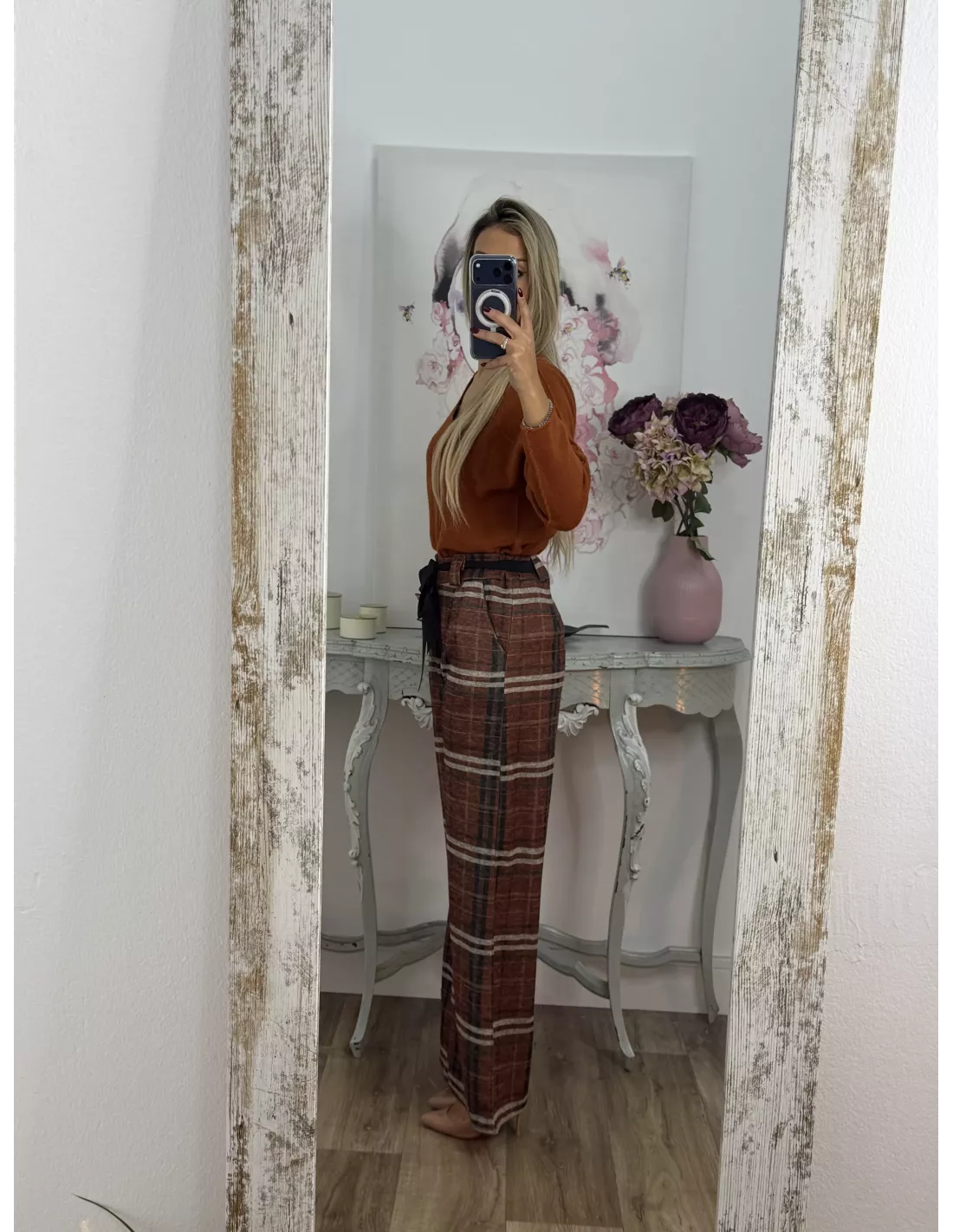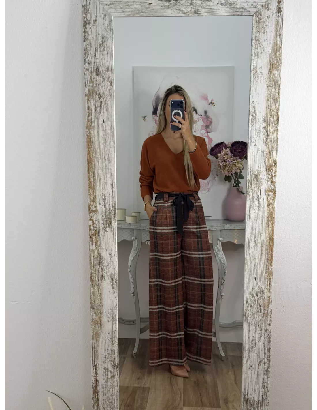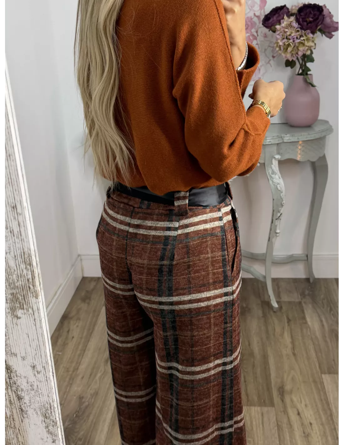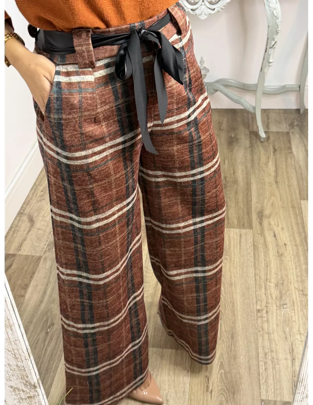 Pantalón de cuadros, pinzas y bolsillos delantero. Trae cinta a modo de cinturón.