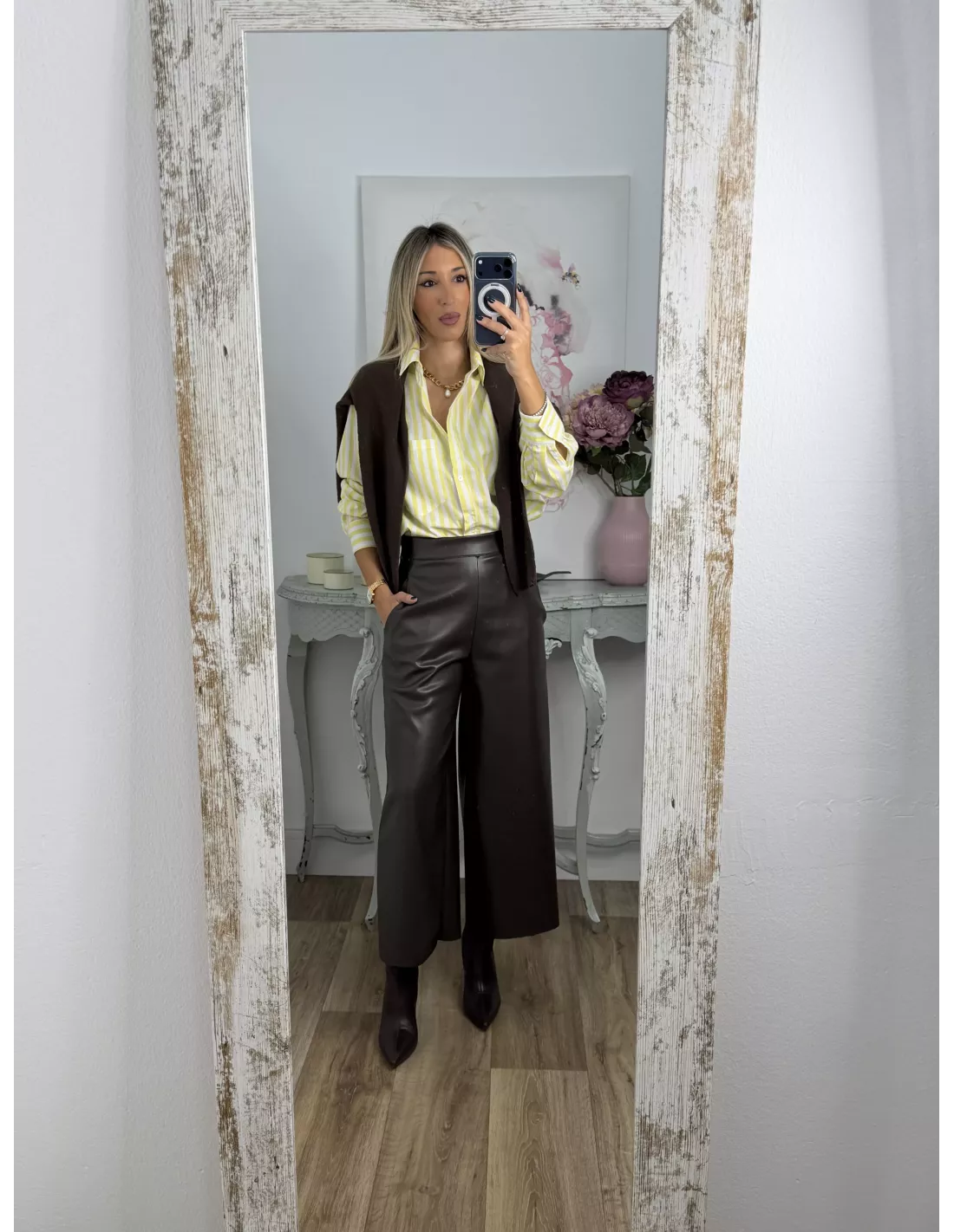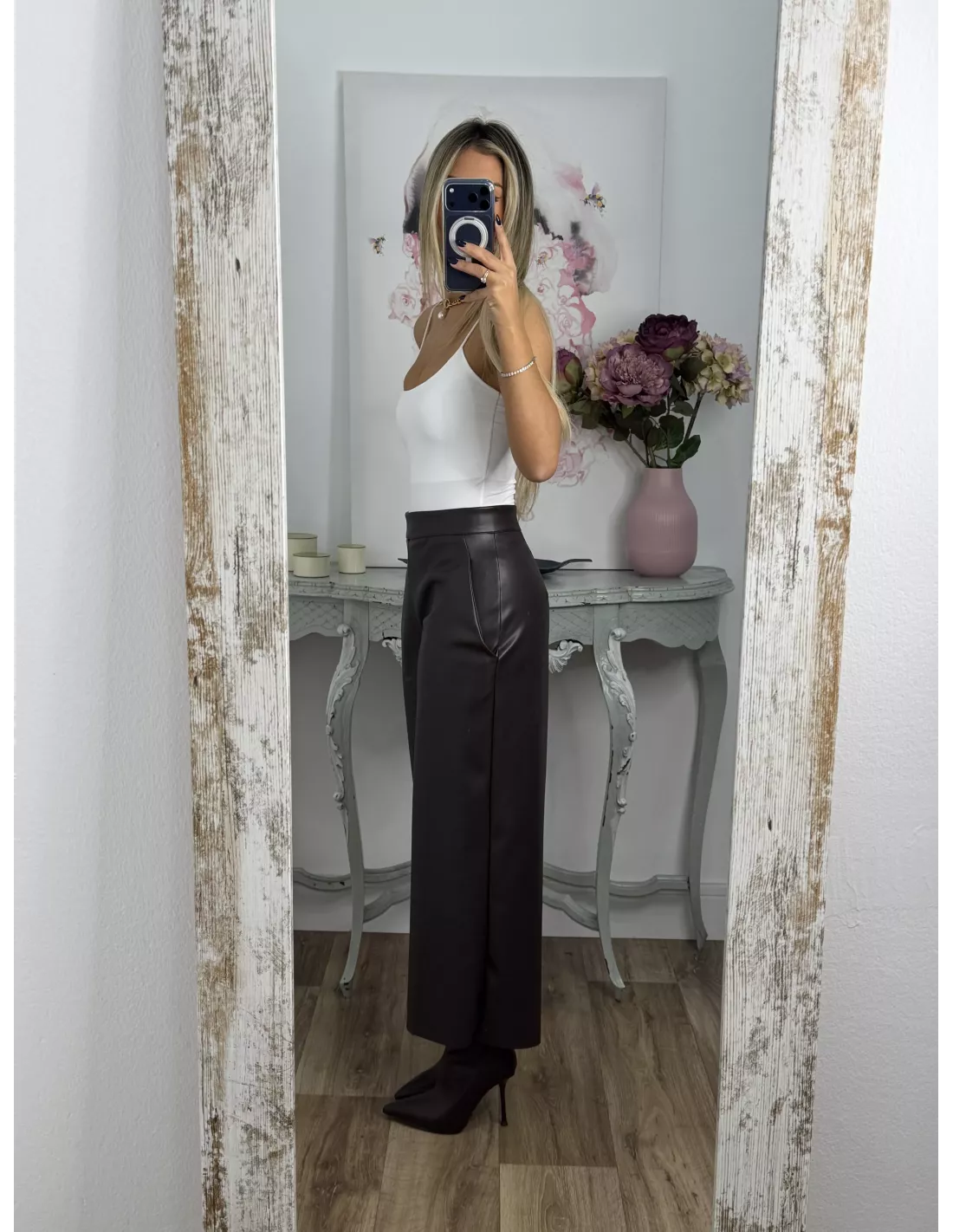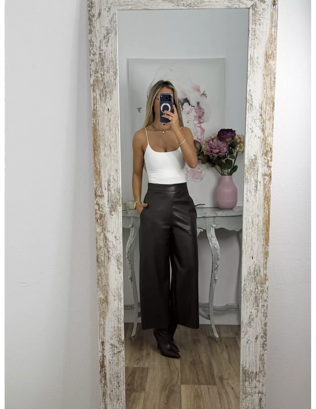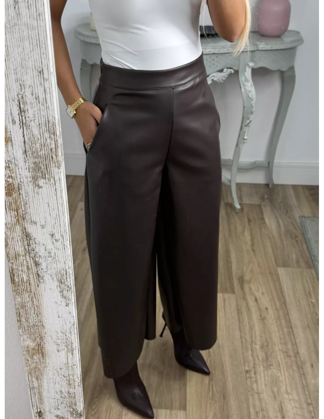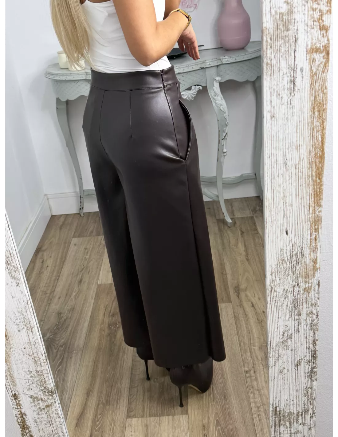 Pantalón de corte culotte de polipiel, no es de piel. Se cierra con cremallera invisible en la costura lateral. Talla amplio.