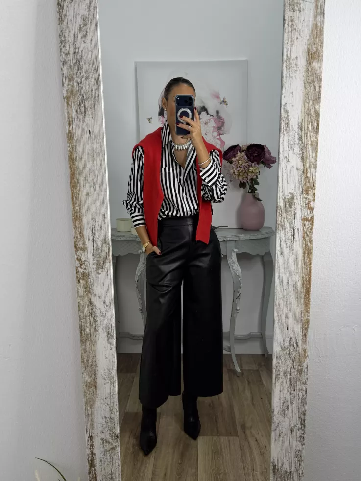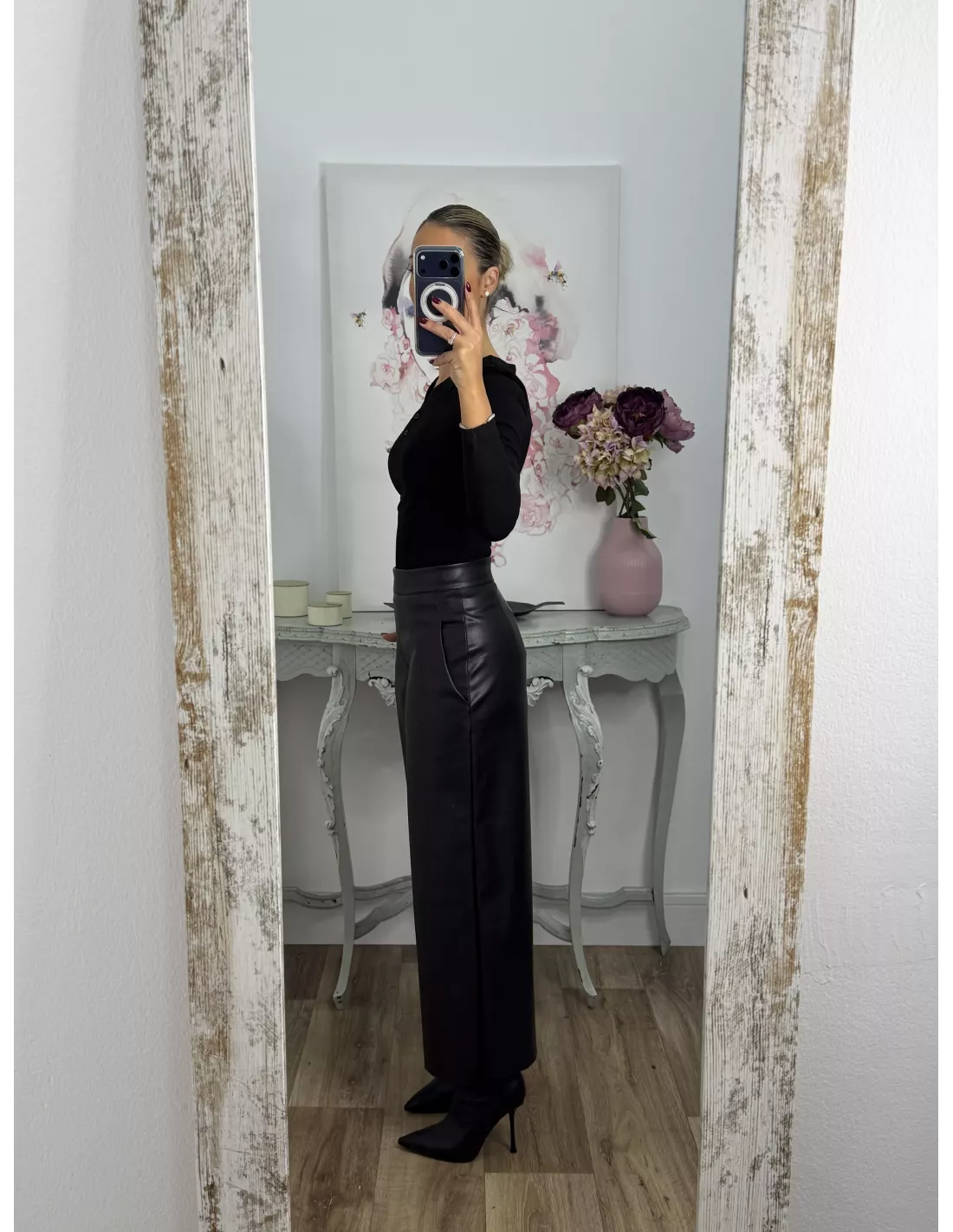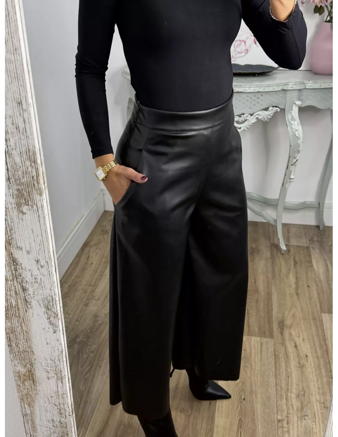 Pantalón de corte culotte de polipiel, no es de piel. Se cierra con cremallera invisible en la costura lateral. Talla amplio.