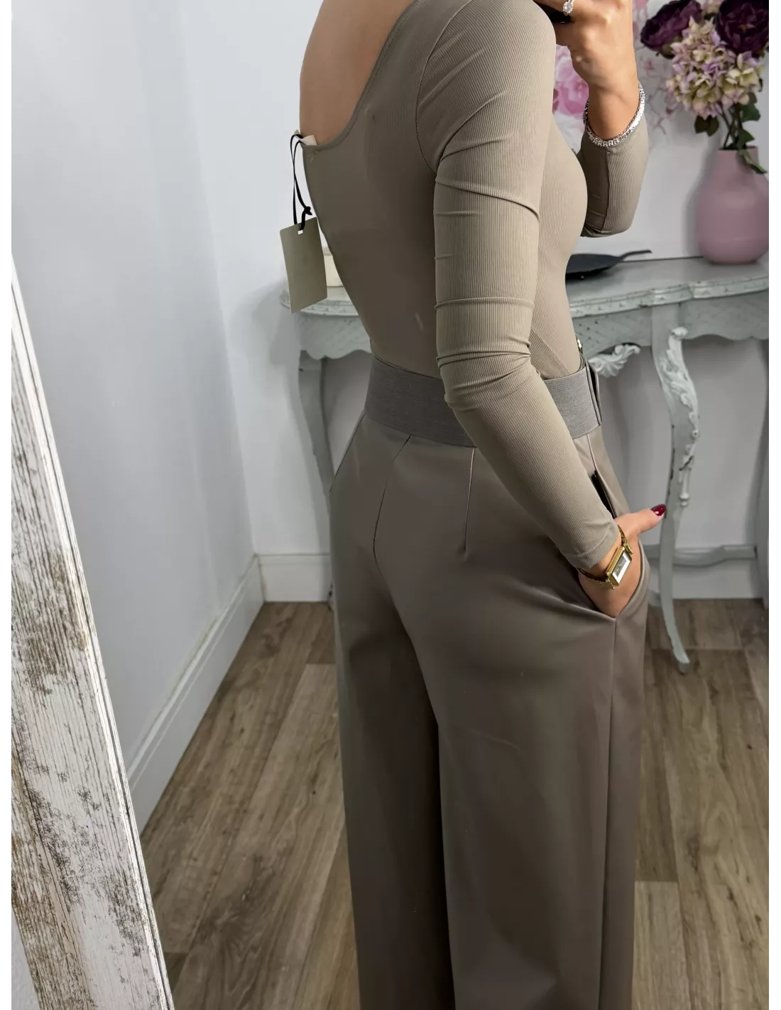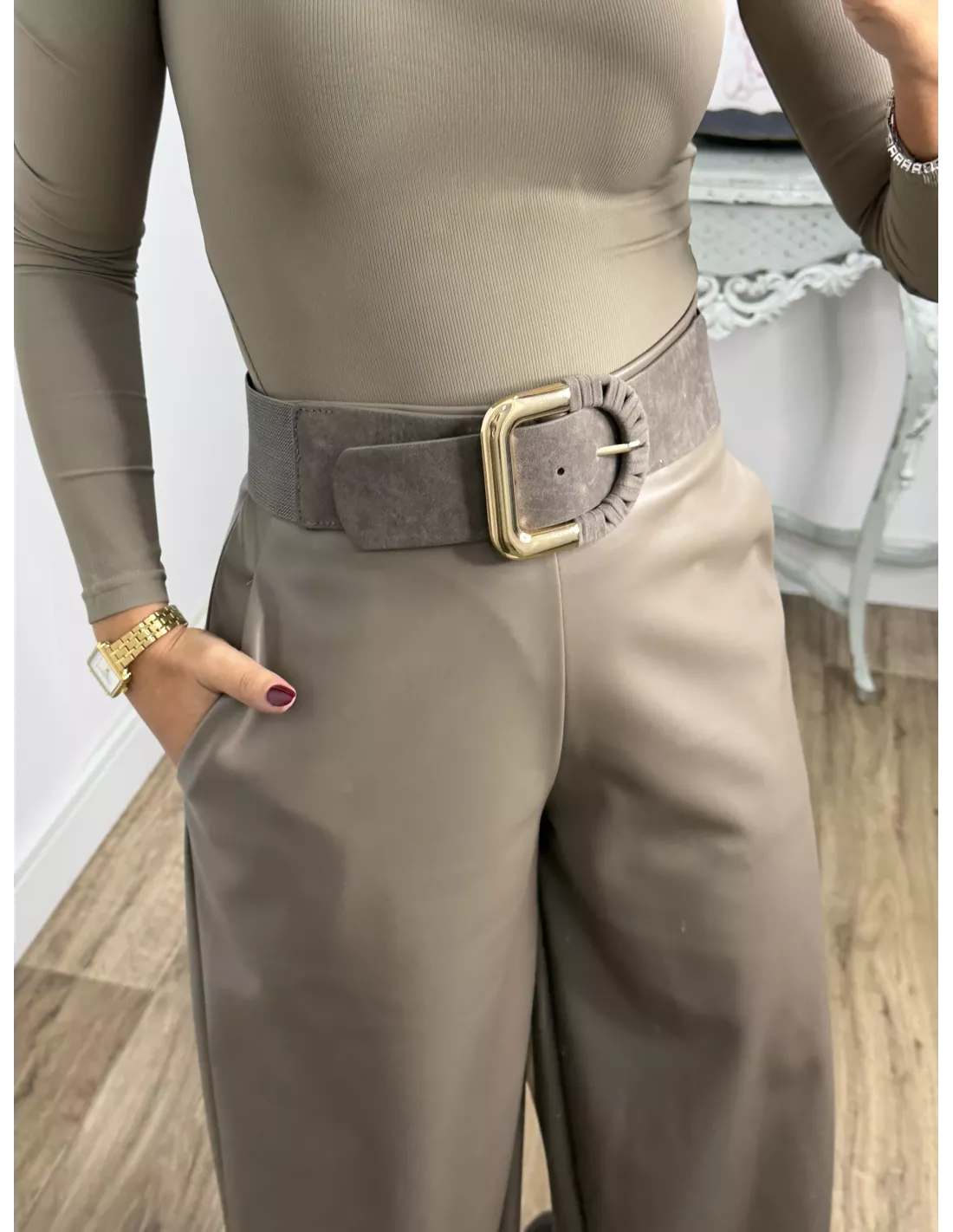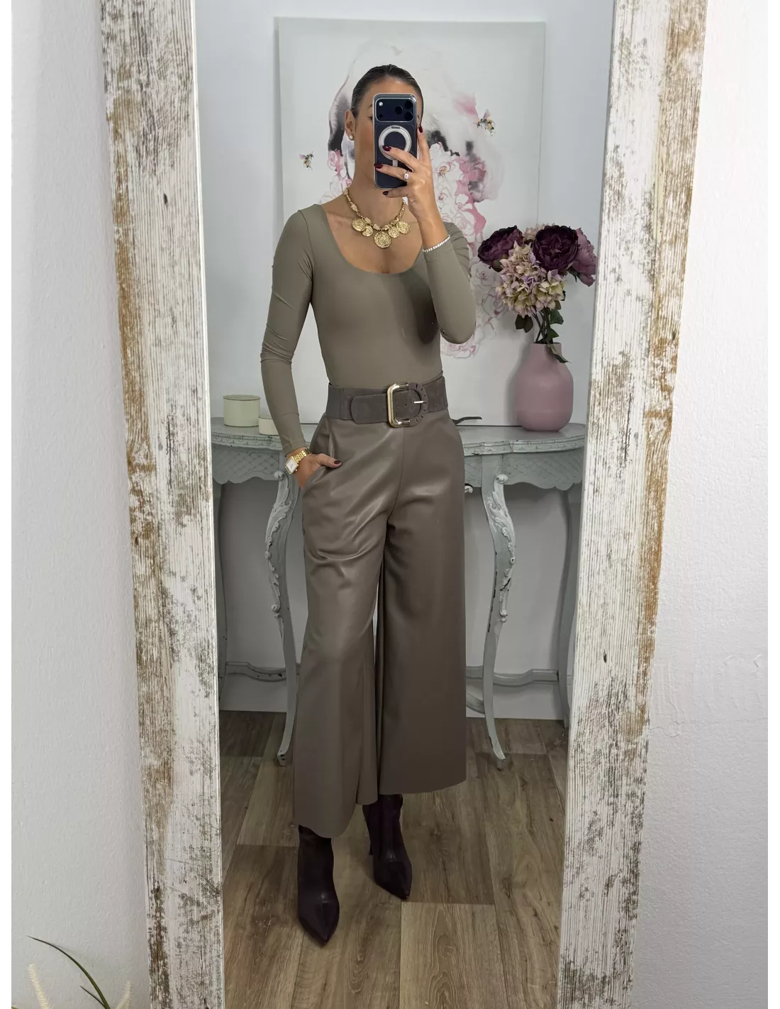Pantalón de corte culotte de polipiel, no es de piel. Se cierra con cremallera invisible en la costura lateral. Talla amplio.
