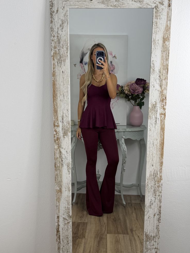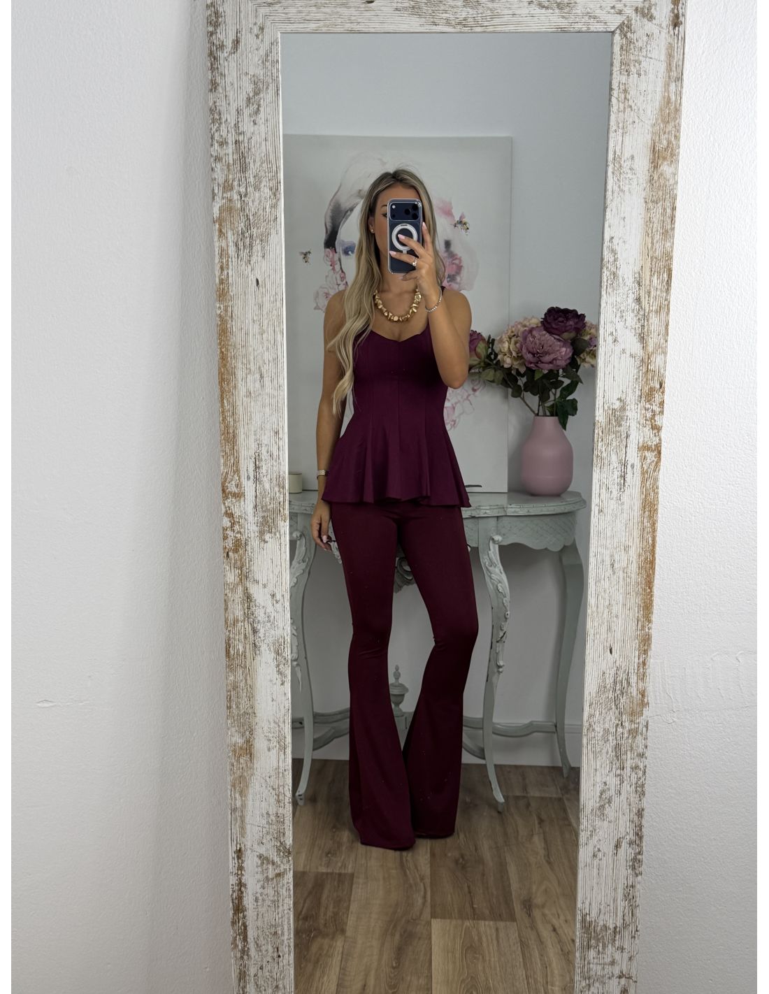Pantalón de campana de licra de tiro alto, con frunce en la parte delantera y en la parte de atrás. El corte es ajustado hasta la rodilla y luego acampanado.