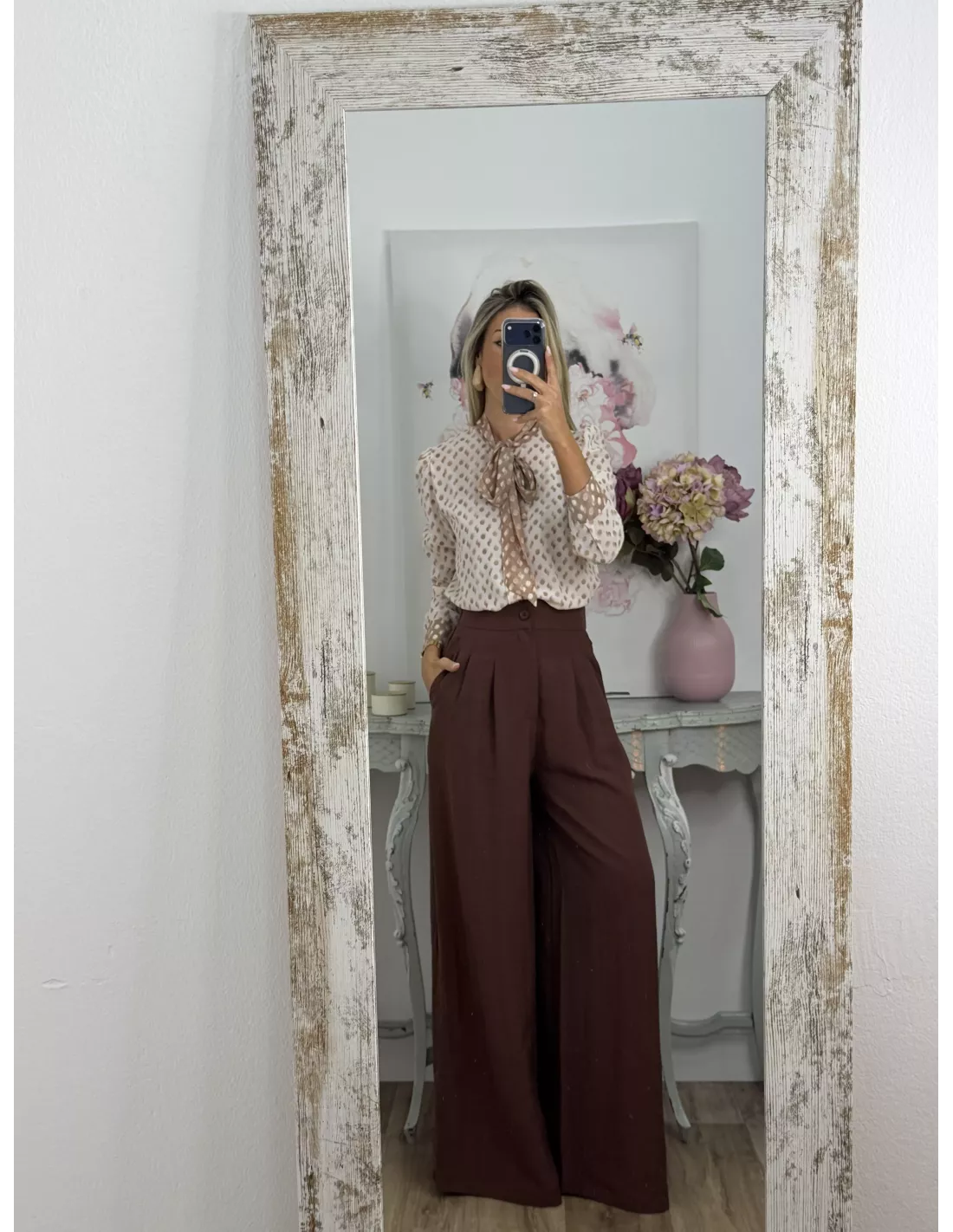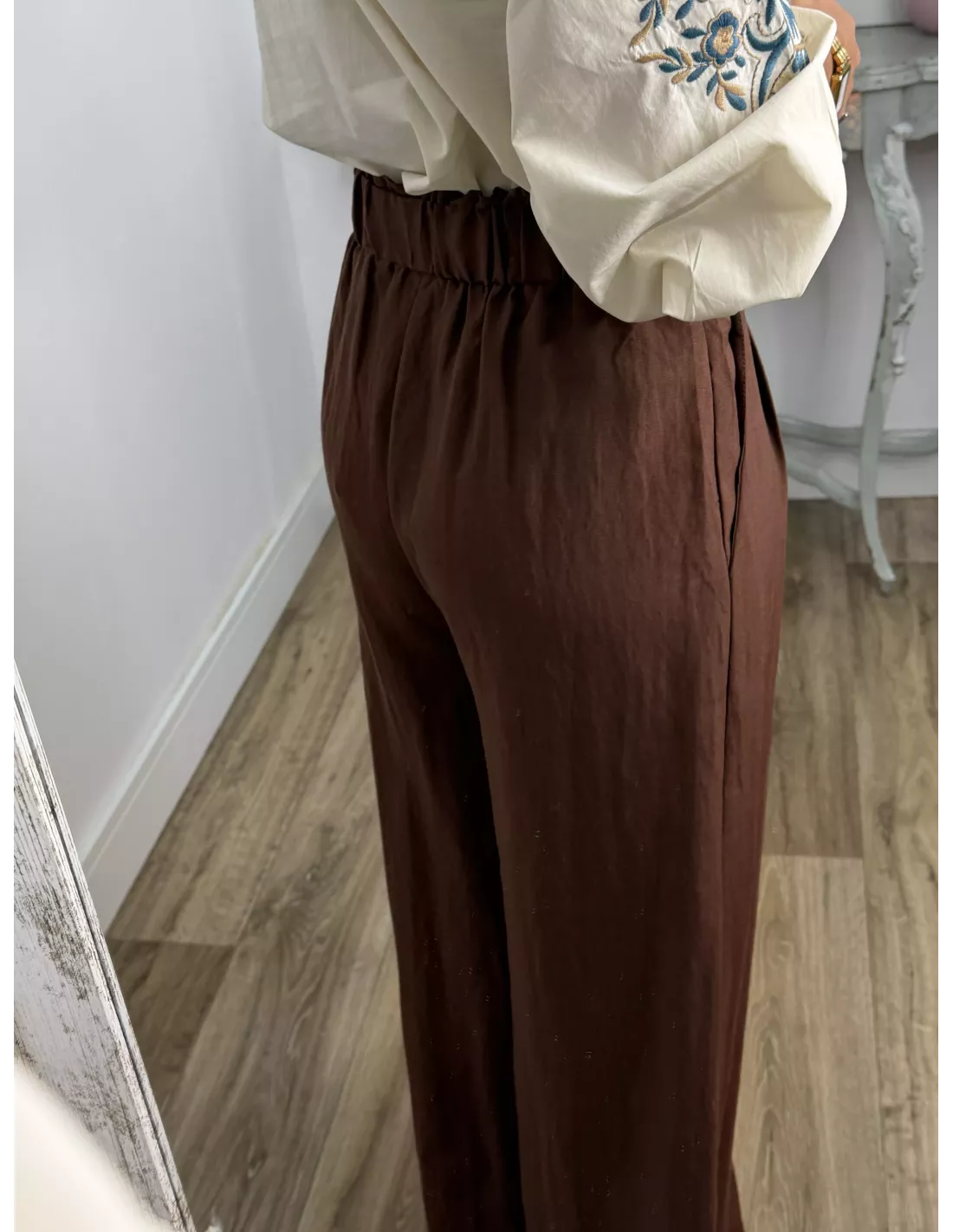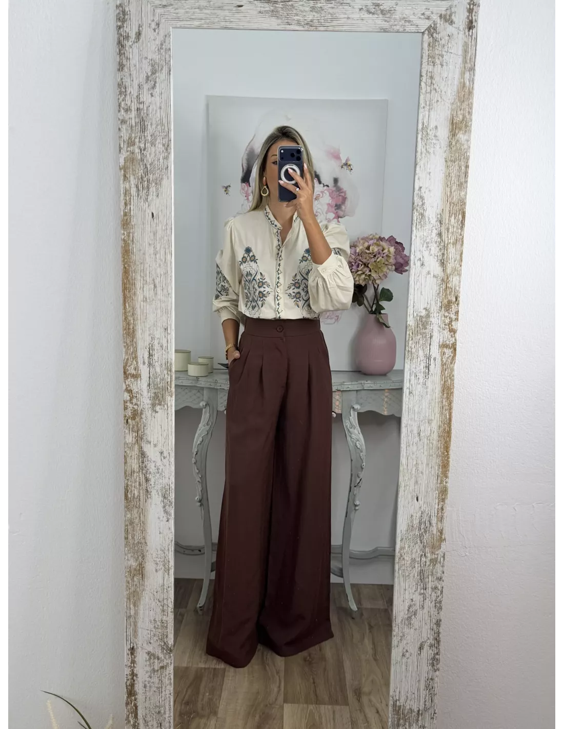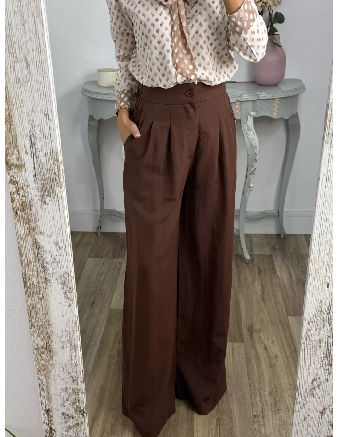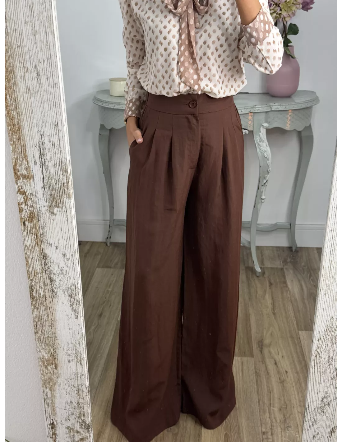 Pantalón de tiro alto con doble pinzas en la parte delantera. Lleva goma en la parte de atrás de la cintura. Es de corte ancho.