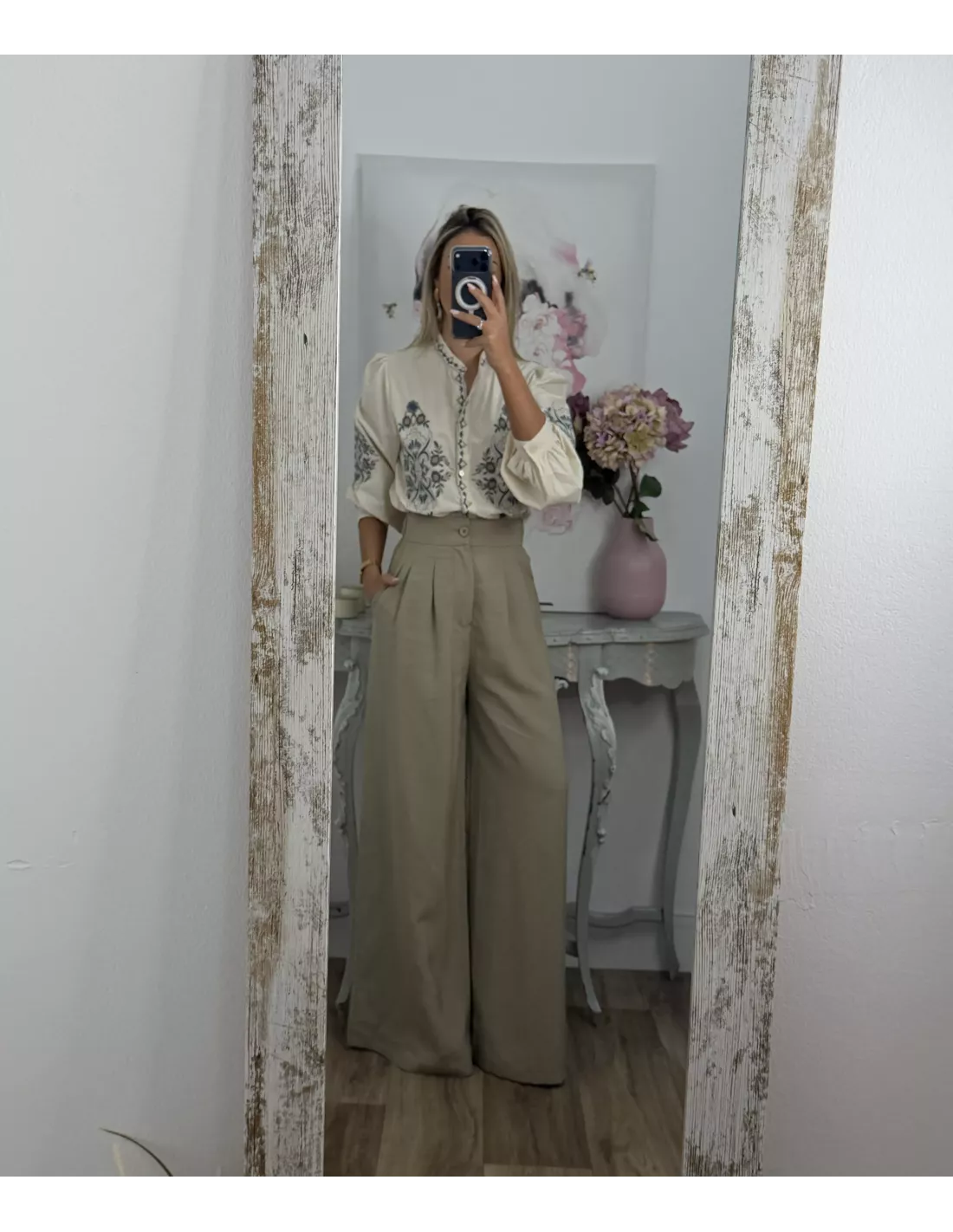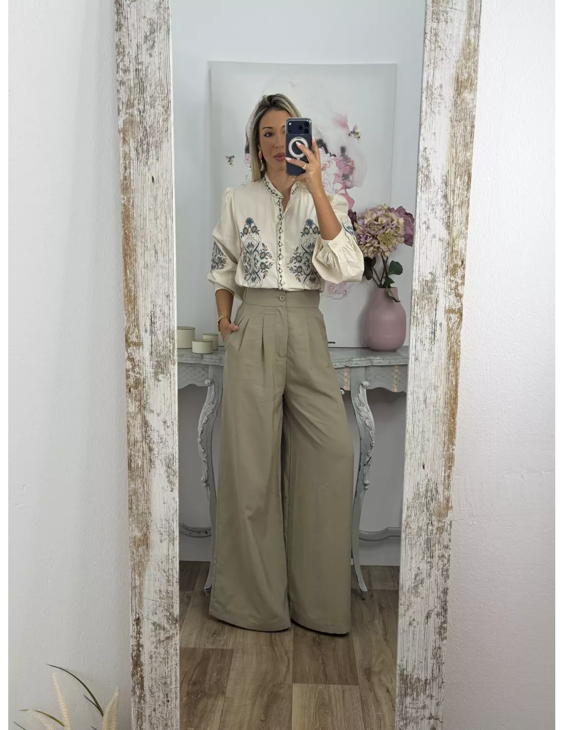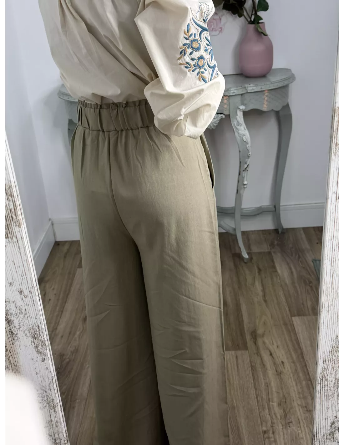 Pantalón de tiro alto con doble pinzas en la parte delantera. Lleva goma en la parte de atrás de la cintura. Es de corte ancho.