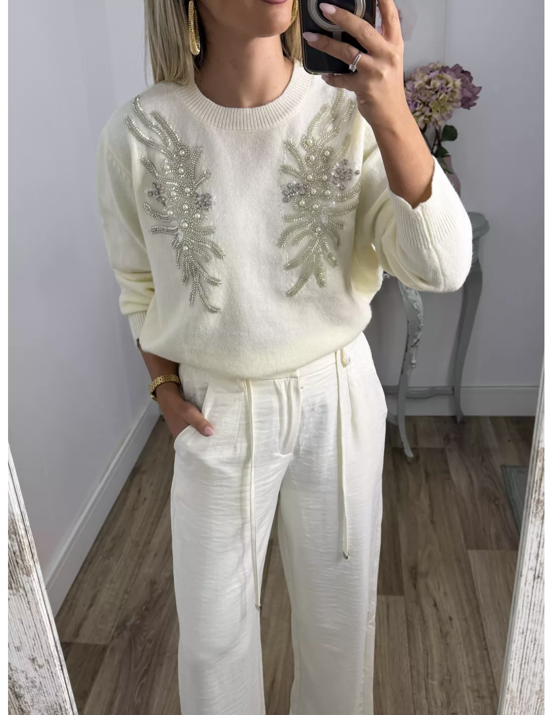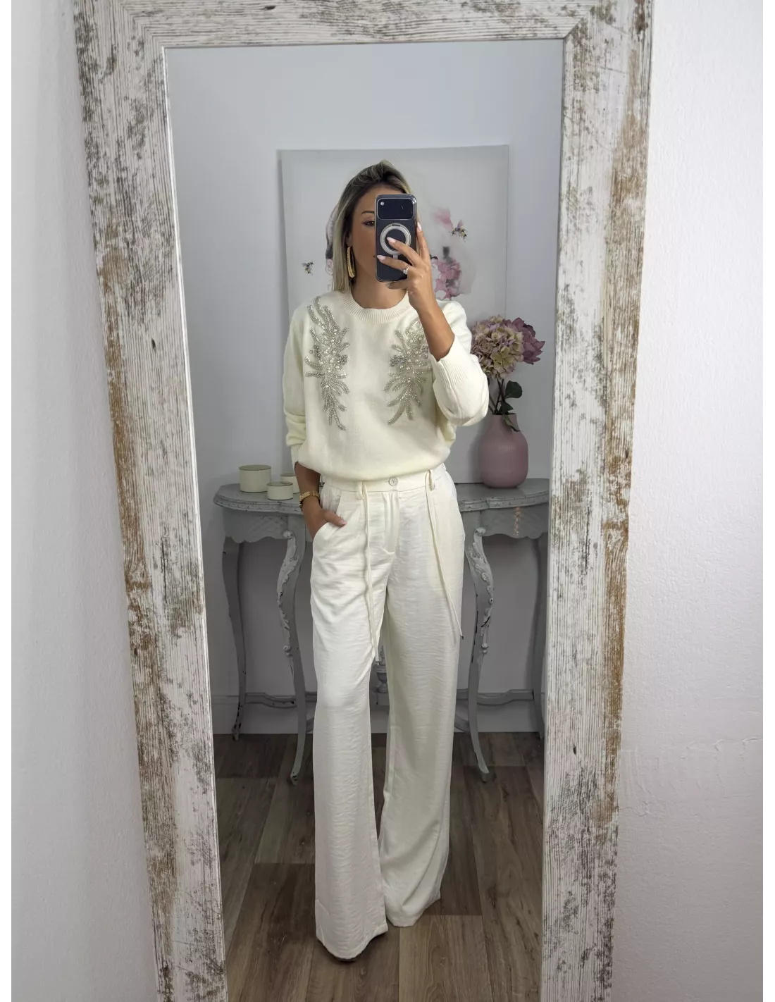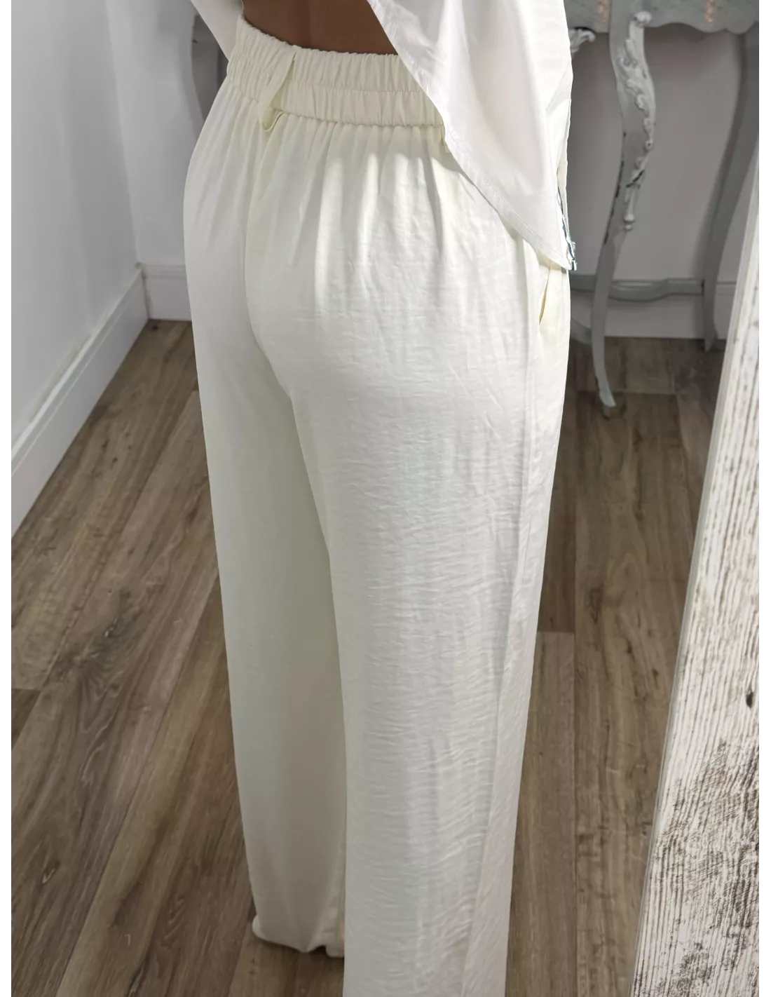 Pantalón de viscosa, tejido tipo satinado. Lleva goma en la cintura. Es de corte recto y amplio. Se recomienda la talla habitual y si estás entre dos tallas la talla mayor.