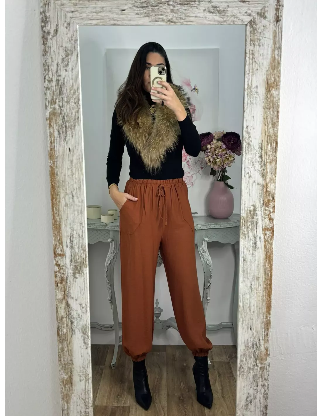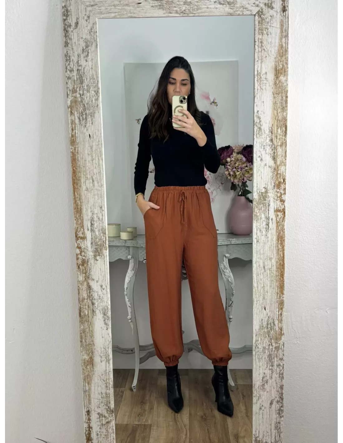 Pantalón bombacho con goma en la cintura y tiene goma en la parte de abajo ( en la zona del tobillo)