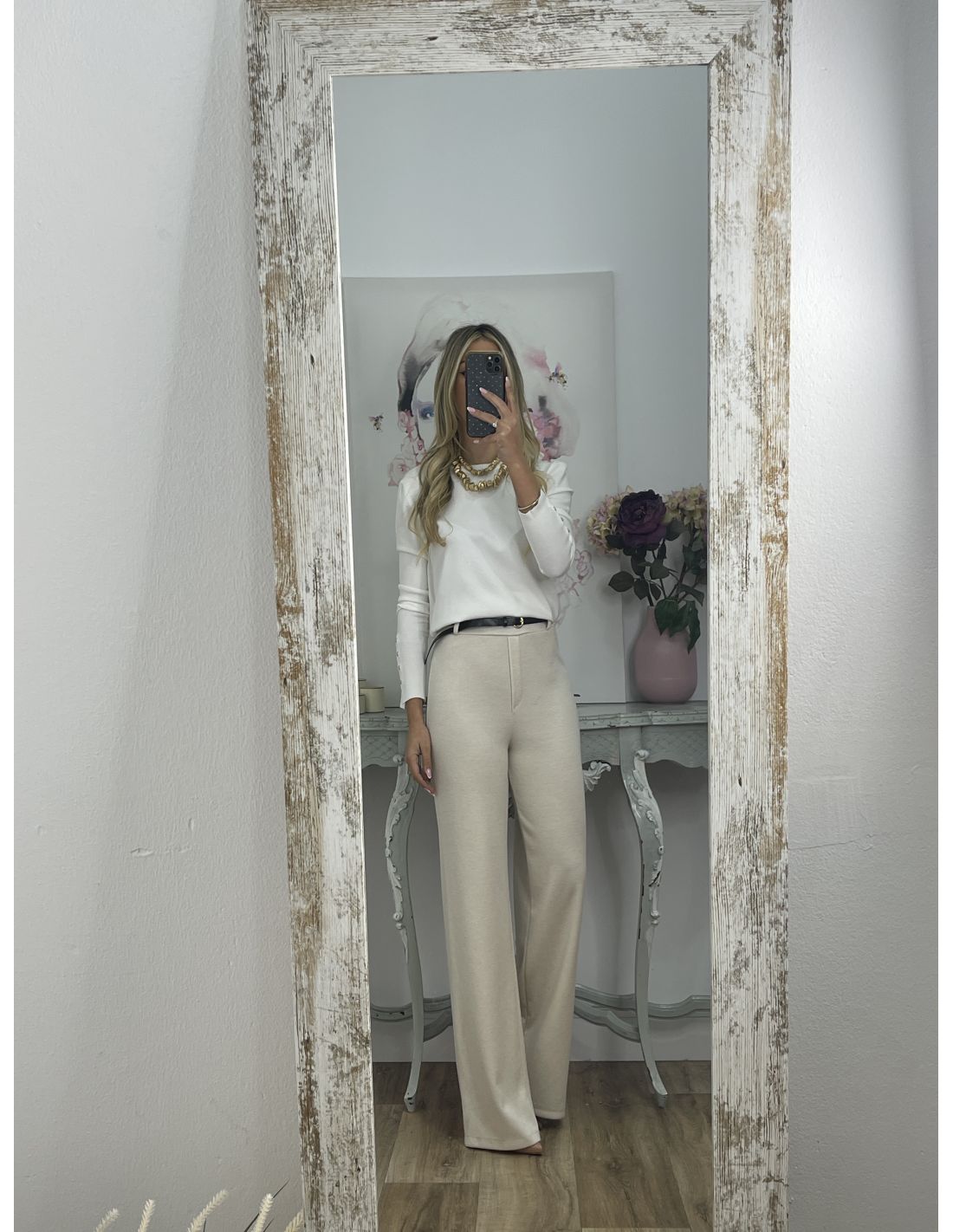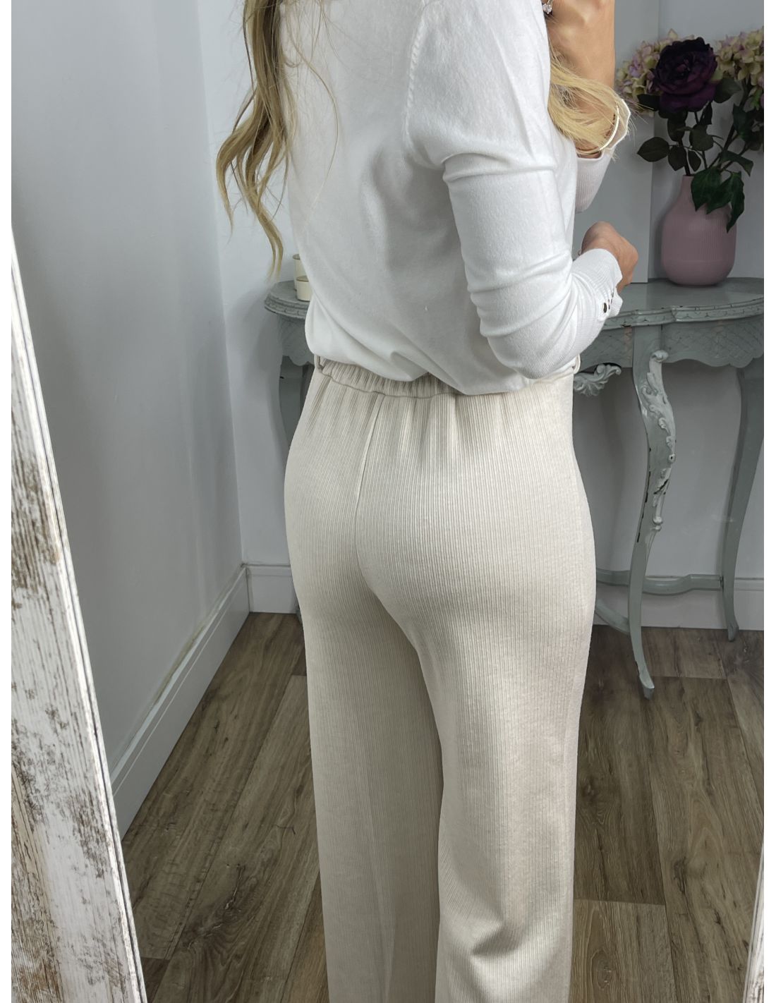 Pantalón de punto que incluye el cinturón que es negro con la hebilla dorada. El pantalón lleva goma en la cintura en la parte de atrás y el corte recto.