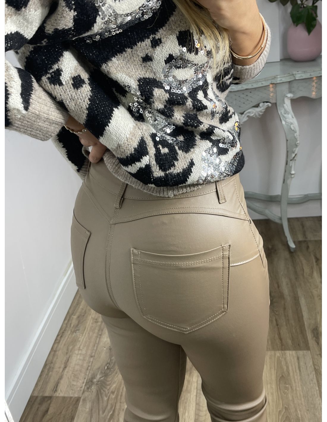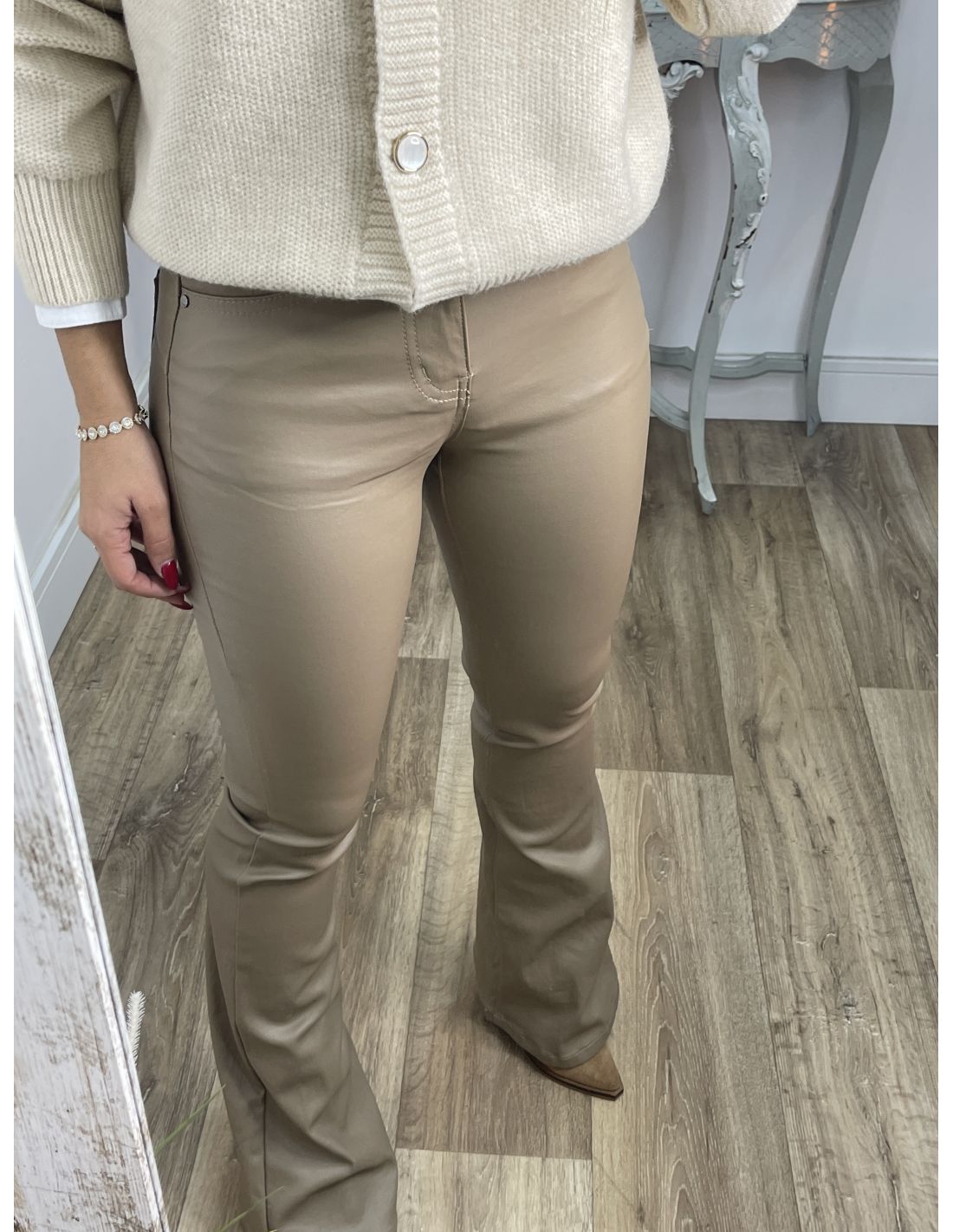 Pantalón polipiel acampanado taupe