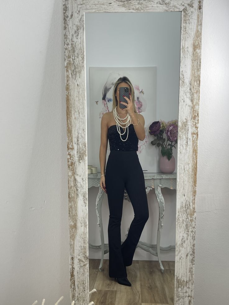 Pantalón de tejido punto Roma. Lleva goma en la cintura con corte acampanado en la parte de abajo. El pantalón no tapa el zapato. Recomendamos la talla habitual.