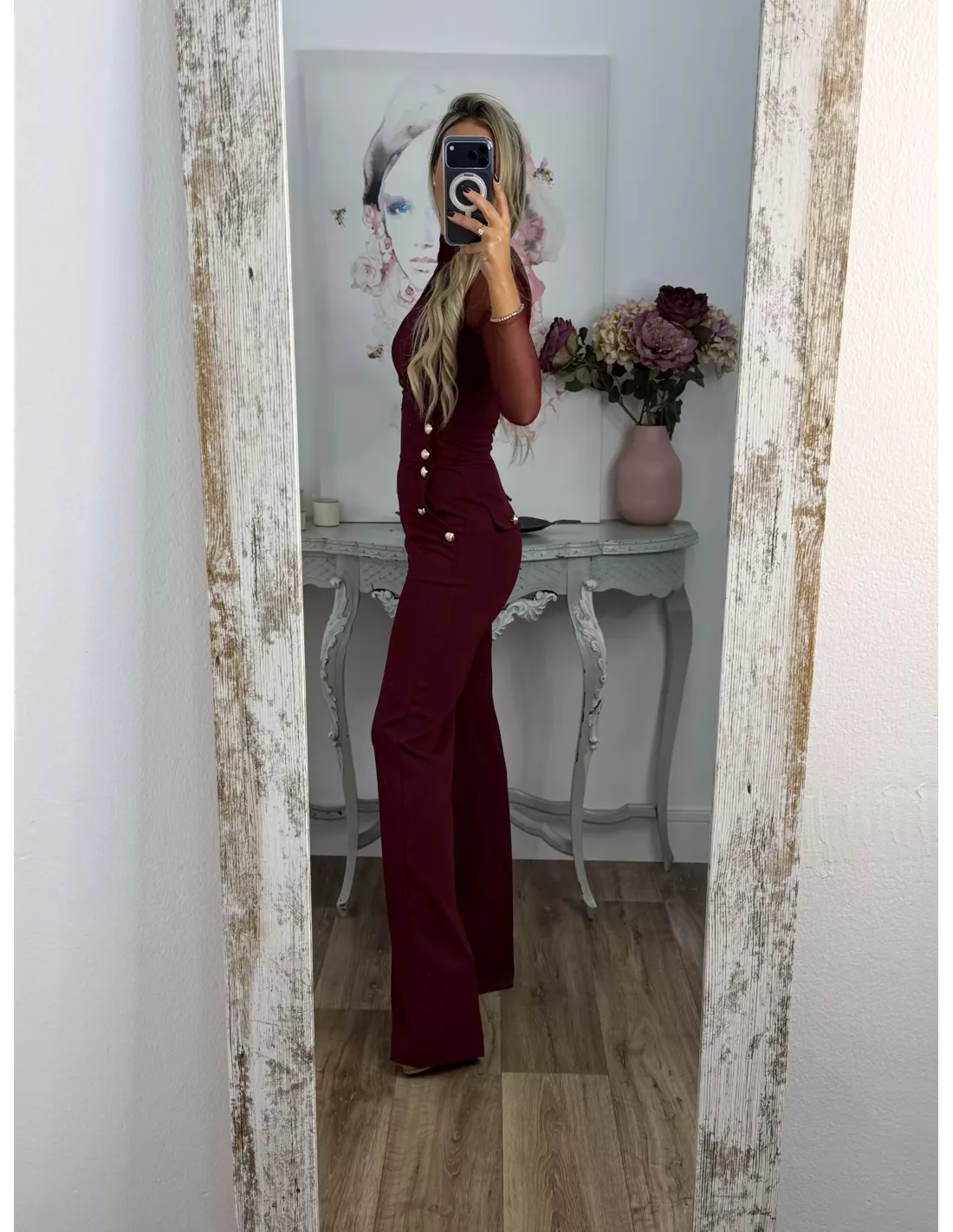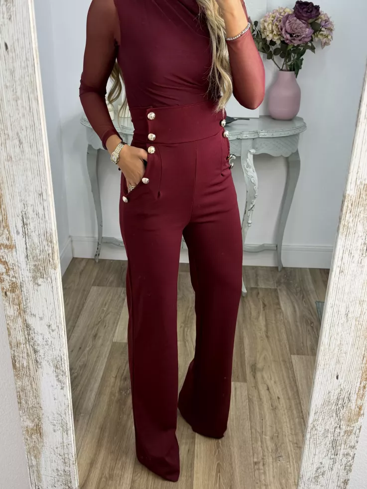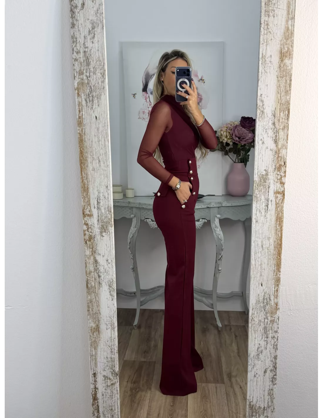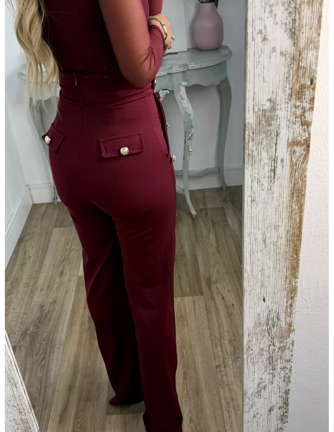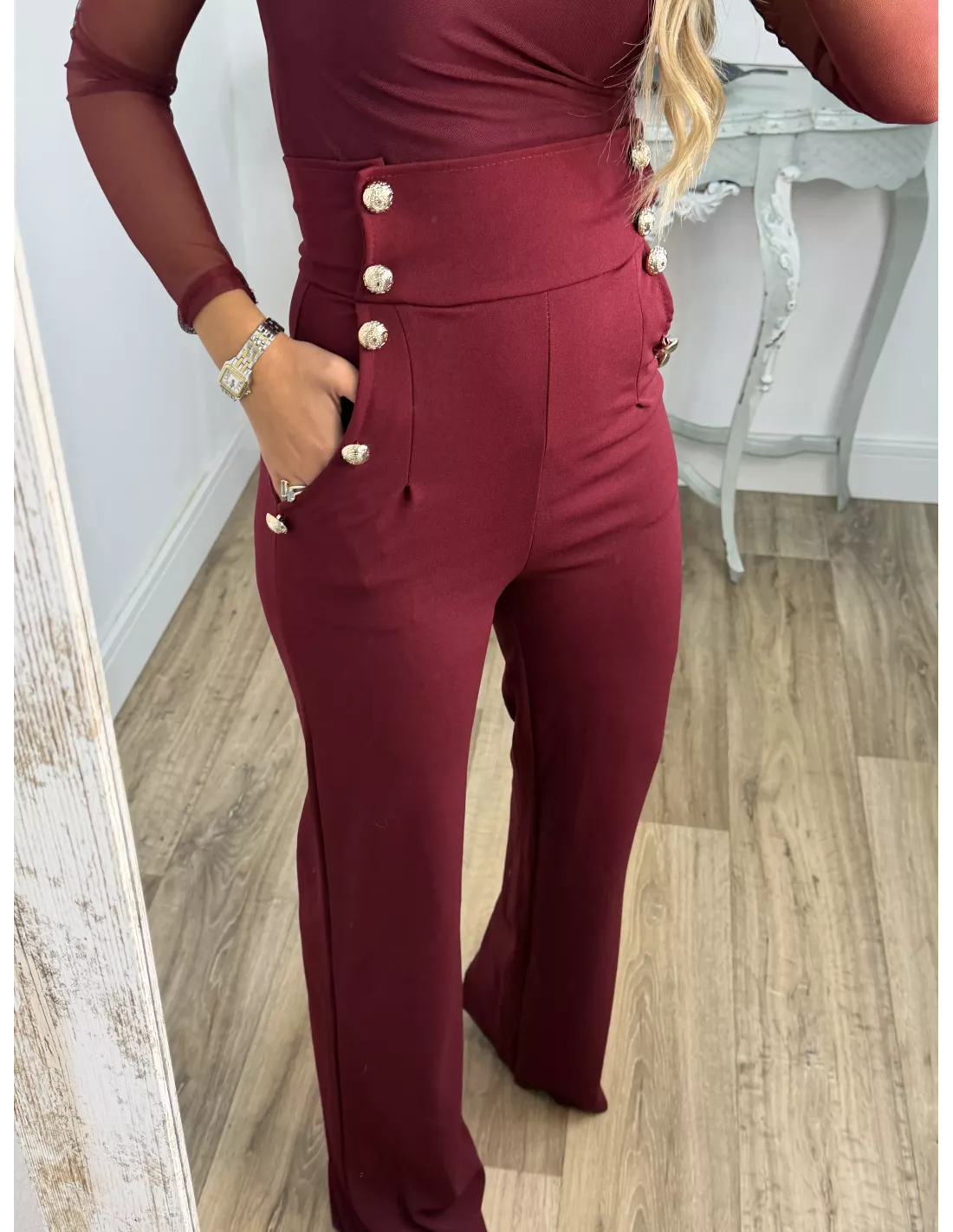 Pantalón de talle alto con botones dorados, que parecen plata. El corte es acampanado. Lleva cremallera invisible en la parte de atrás.