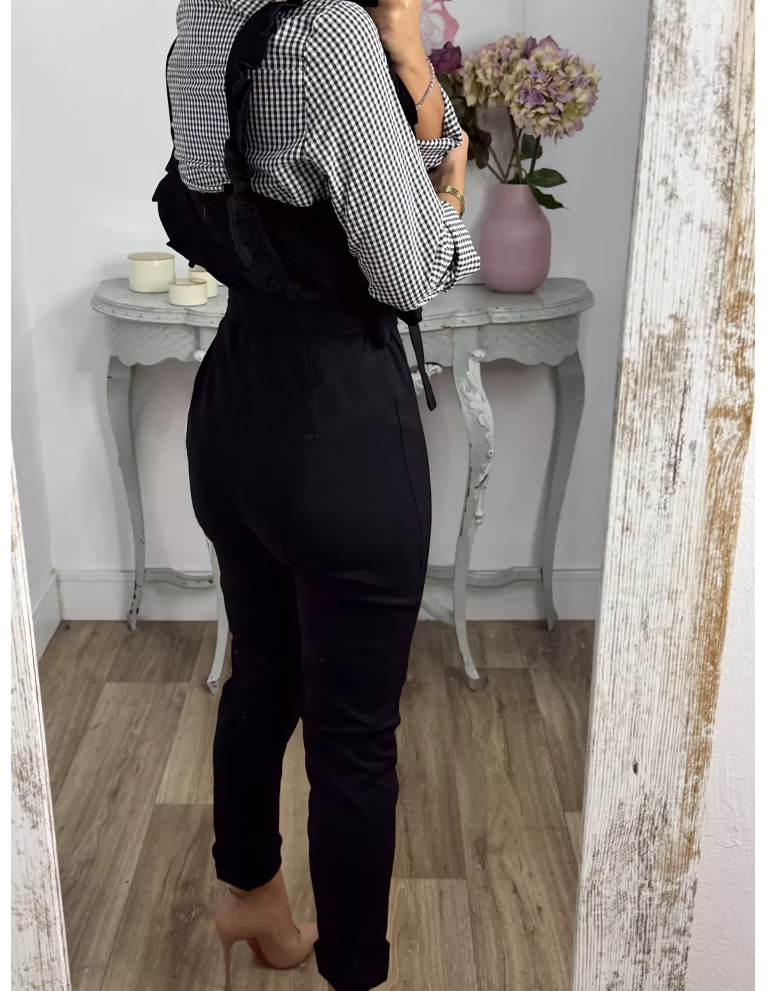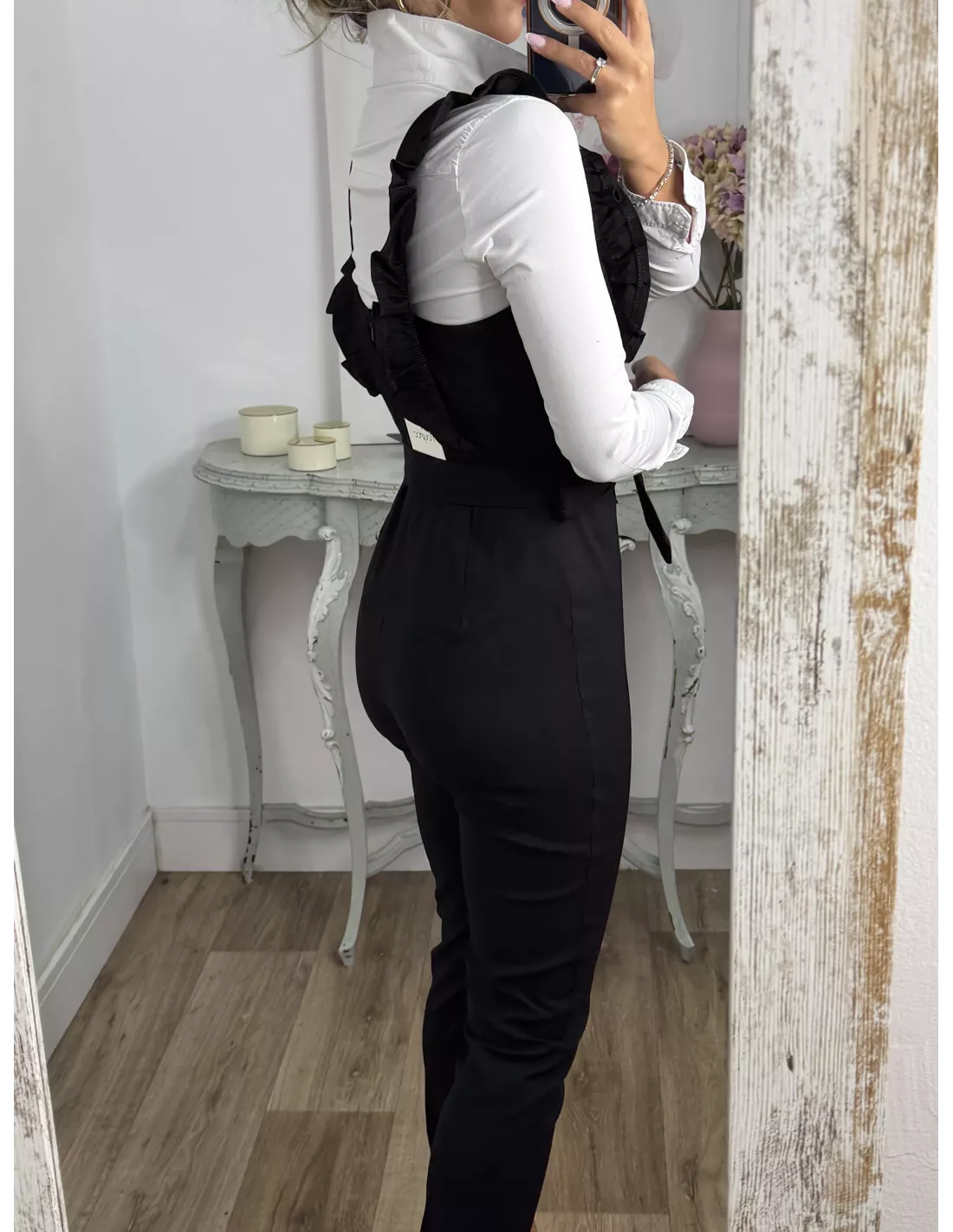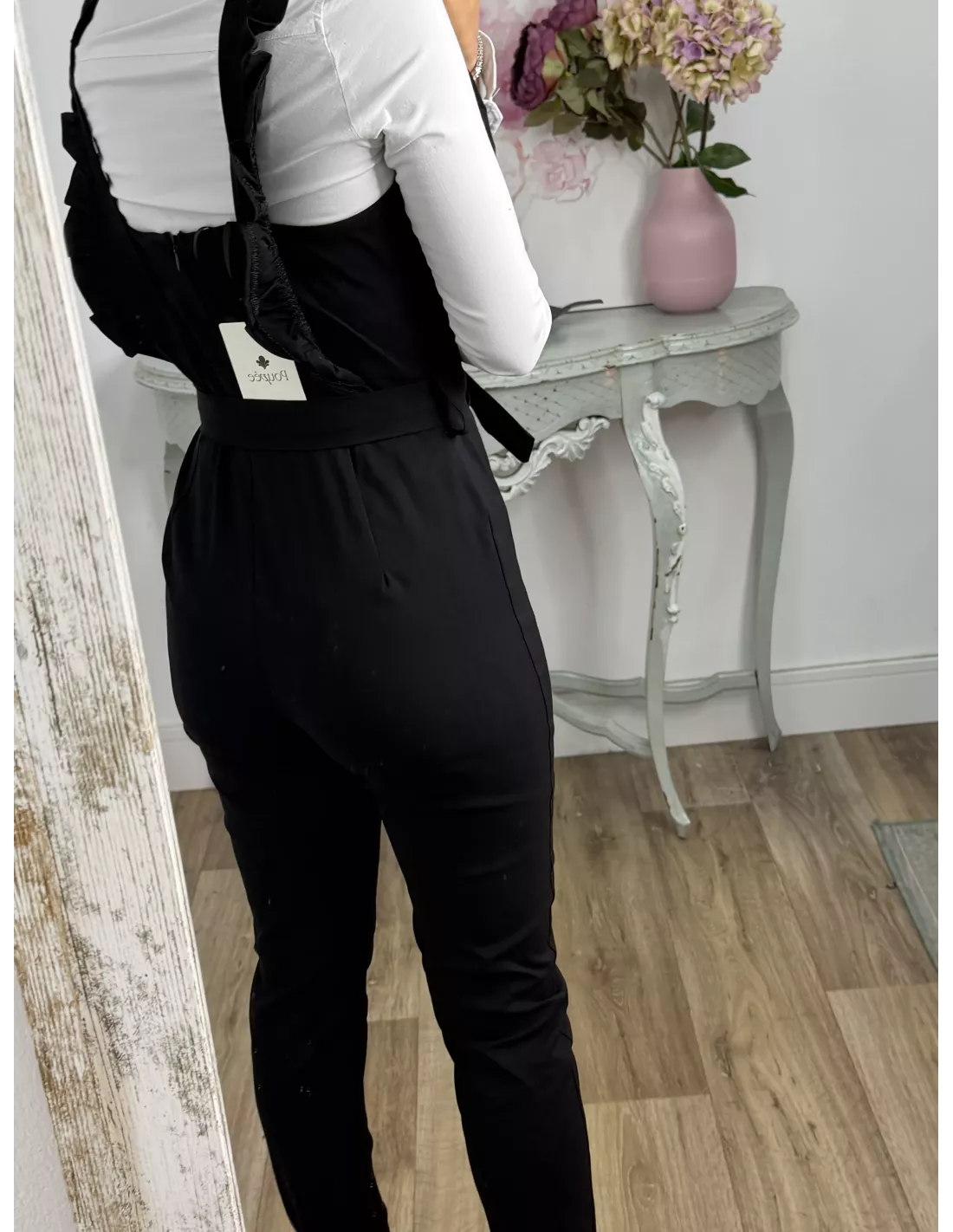 Mono elástico de tejido vaquero. Se cierra con cremallera invisible en la parte de atrás de la espalda. Trae cinturón del mismo tejido. !Ojo no indicado para chicas altas!
