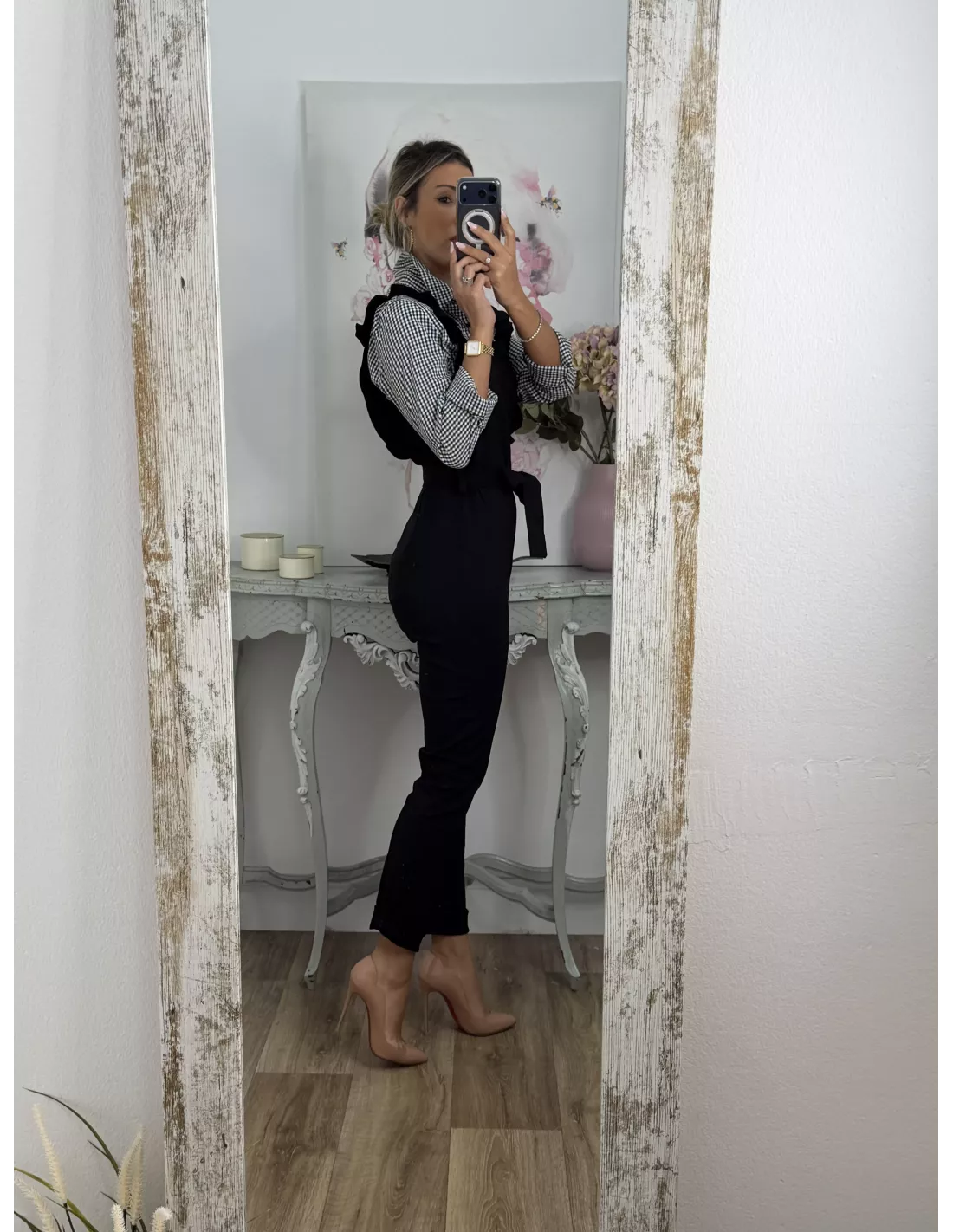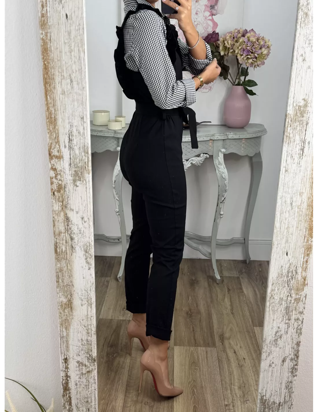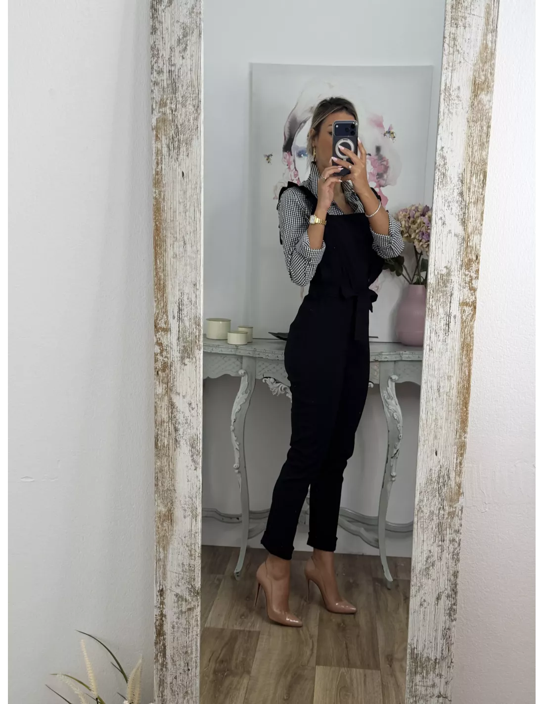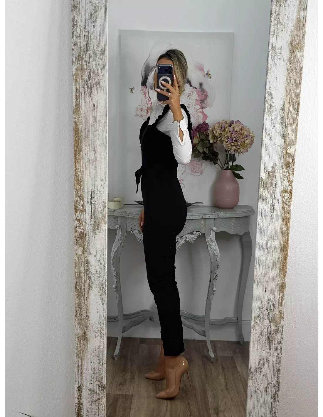 Mono elástico de tejido vaquero. Se cierra con cremallera invisible en la parte de atrás de la espalda. Trae cinturón del mismo tejido. !Ojo no indicado para chicas altas!