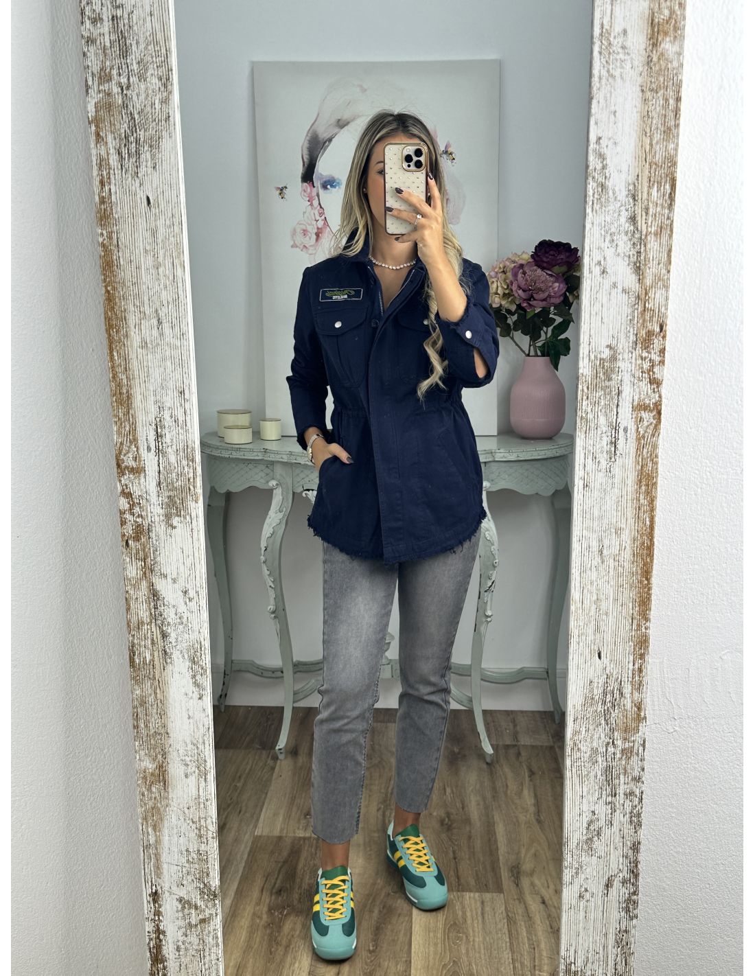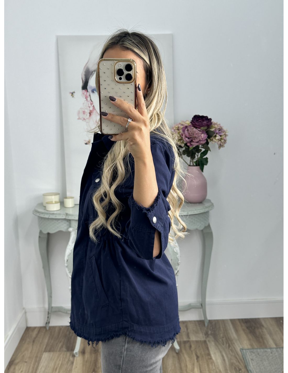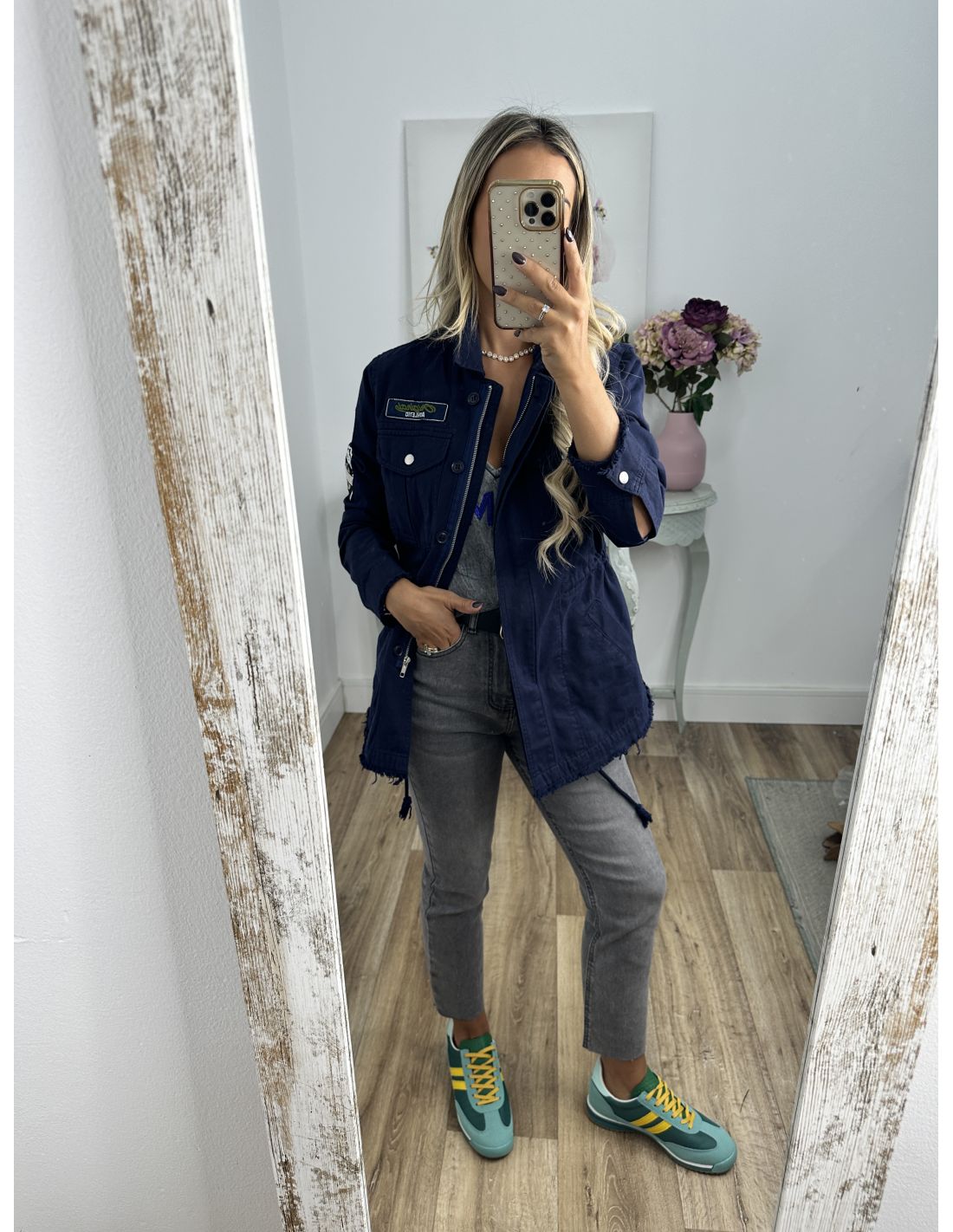 Parka vaquero que se ajusta la cintura. Se cierra con cremallera y botones de clips. No va forrada.
