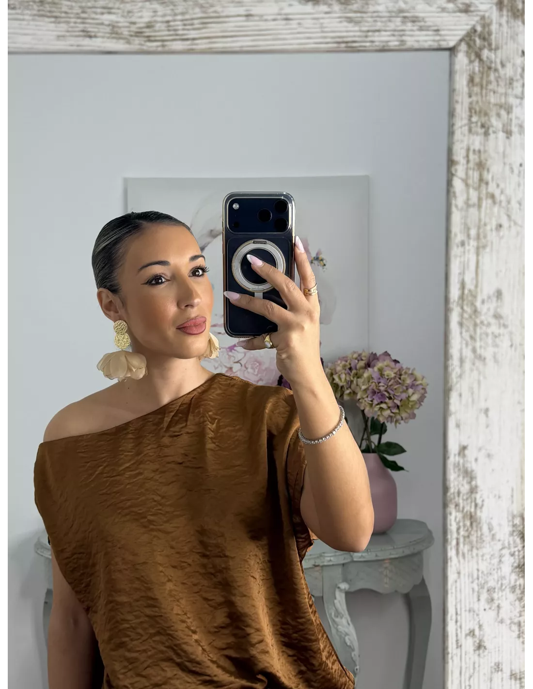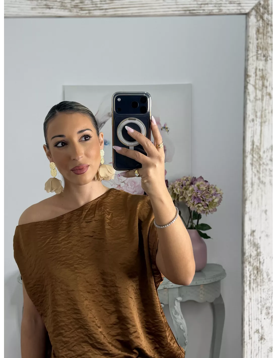 Pendientes monedas y flor beige