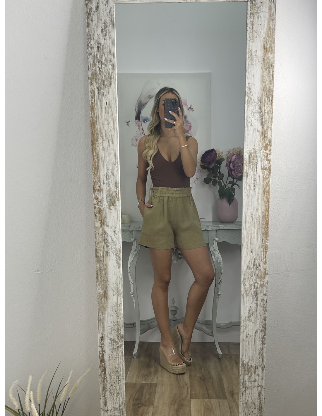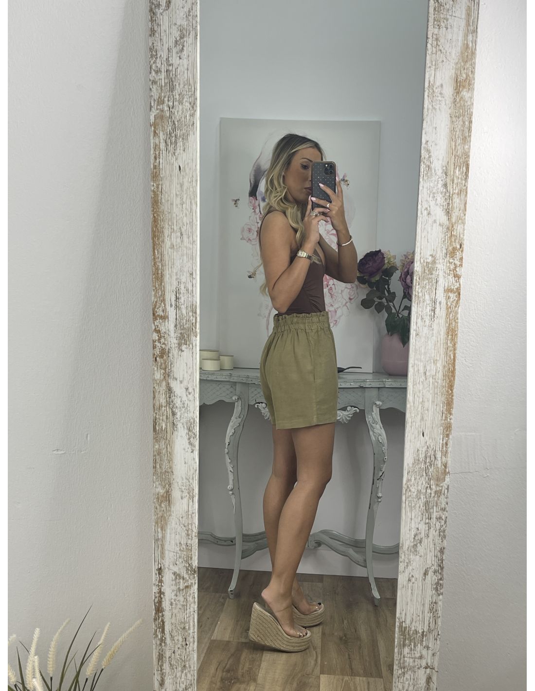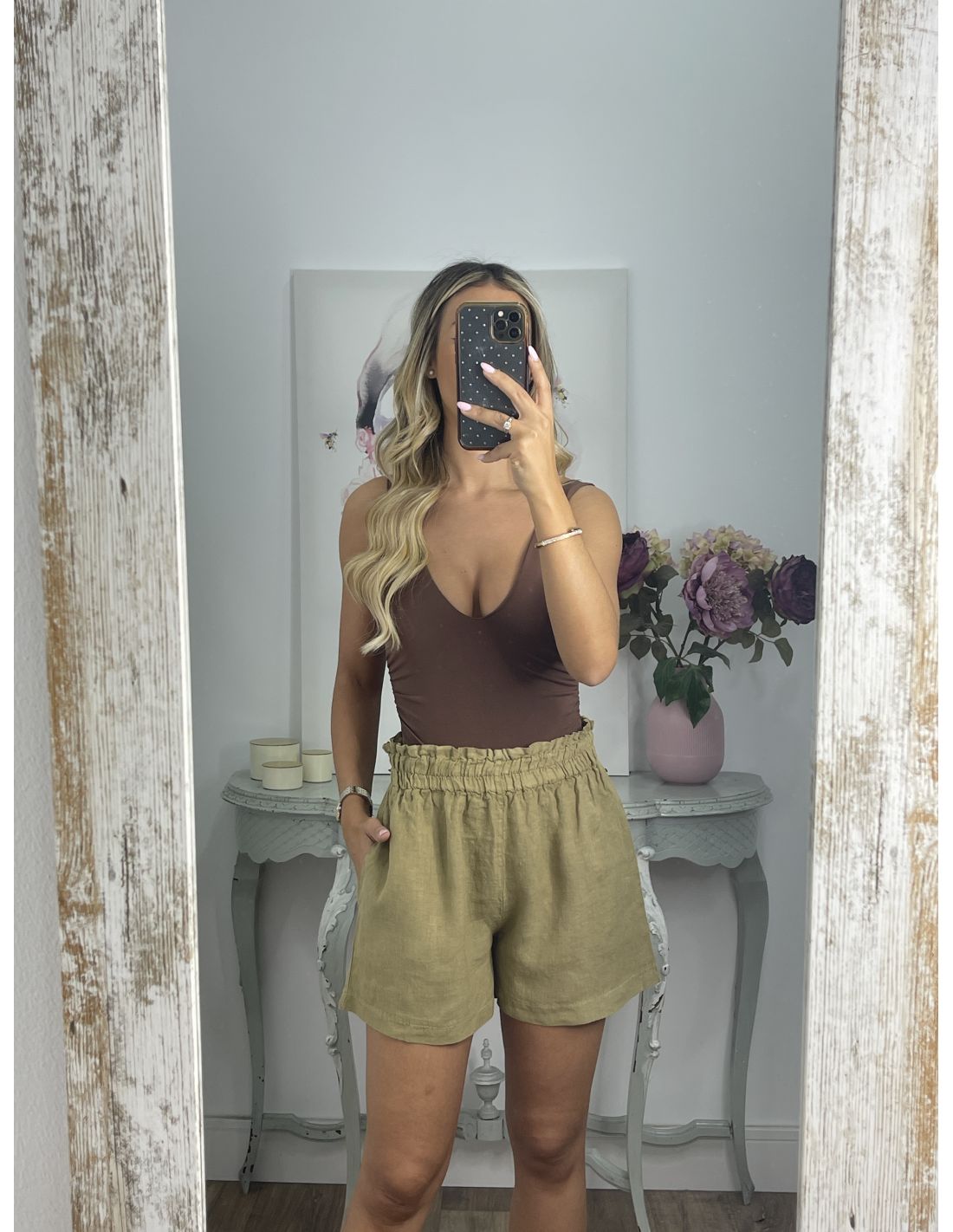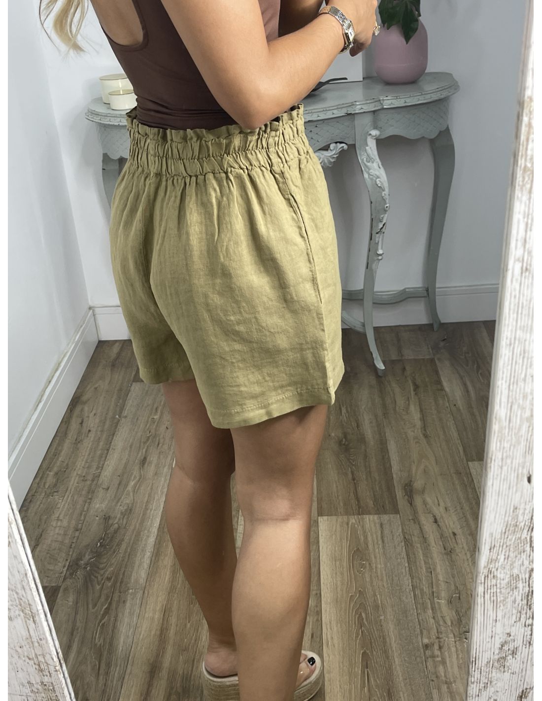 Short de tejido fluido con goma en la cintura que se ajusta, no va forrado y tiene bolsillos tipo chino.