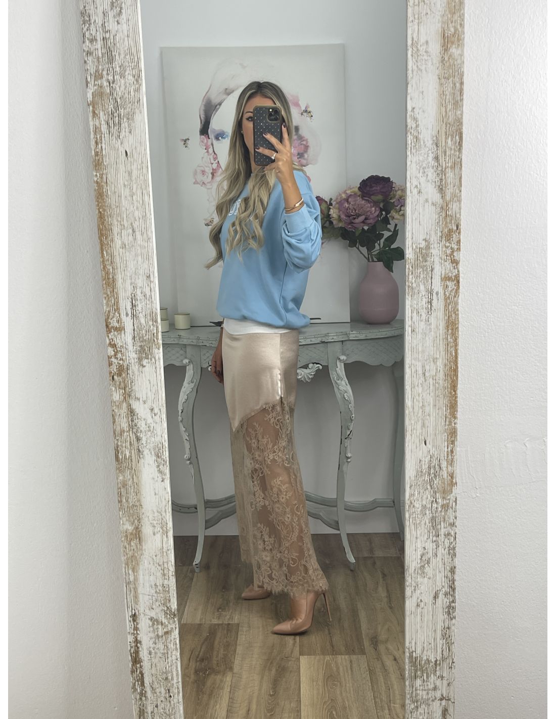La modelo lleva puesta la talla S, ella utiliza de forma habitual talla XS-S y mide 1,60 cm