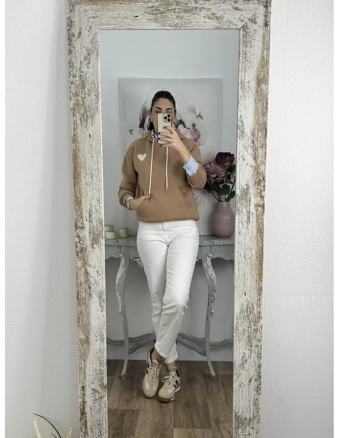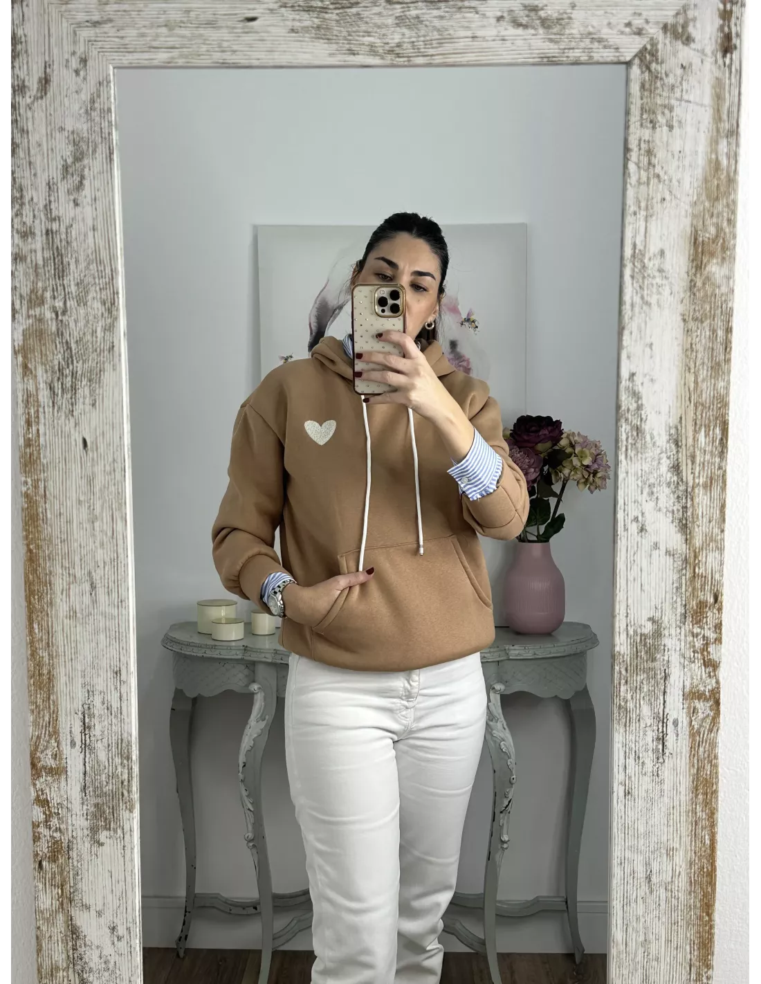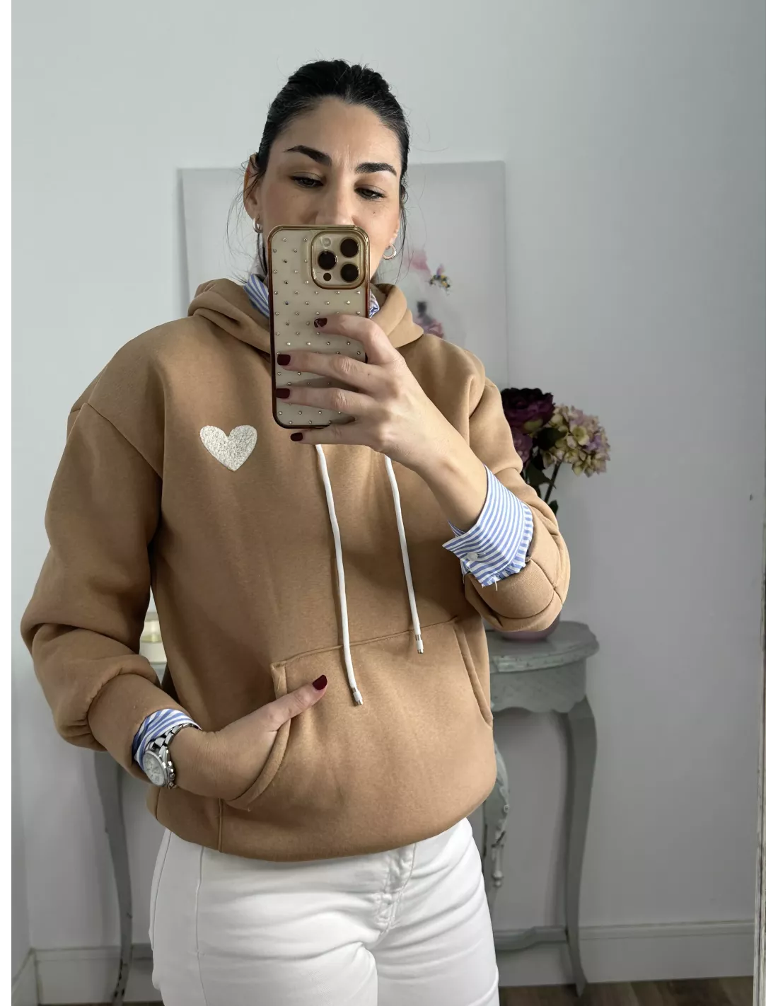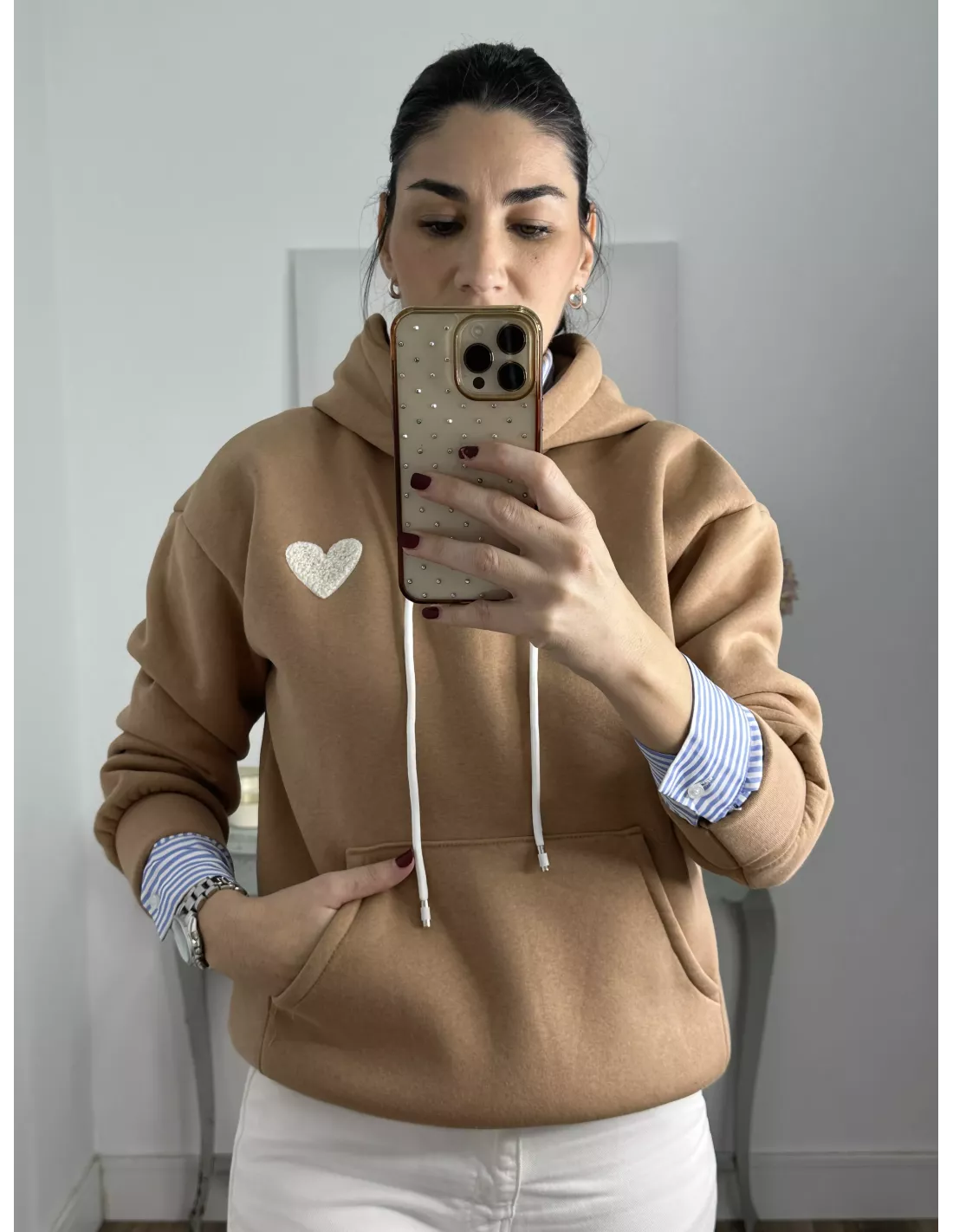 Sudadera camel capucha con corazón