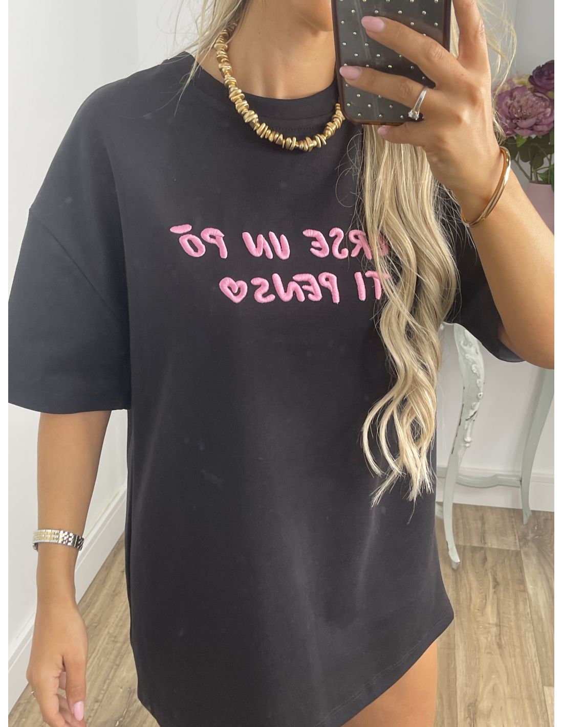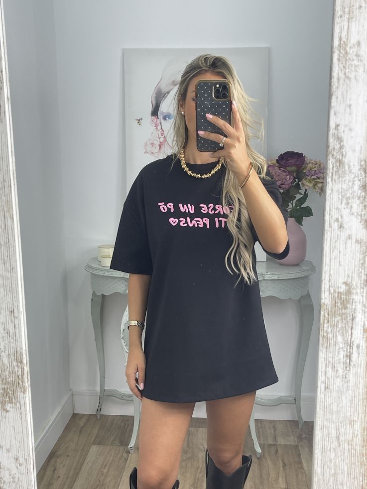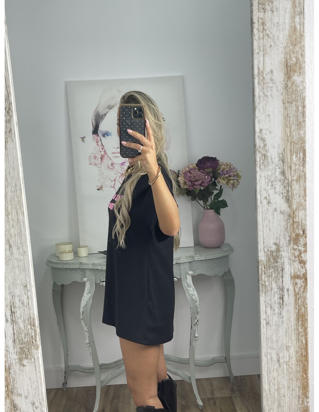 Sudadera de cuello a Caja, de manga corta con letras bordadas. El corte es recto. No se puede utilizar este vestido, es corta la modelo lleva un Short debajo.