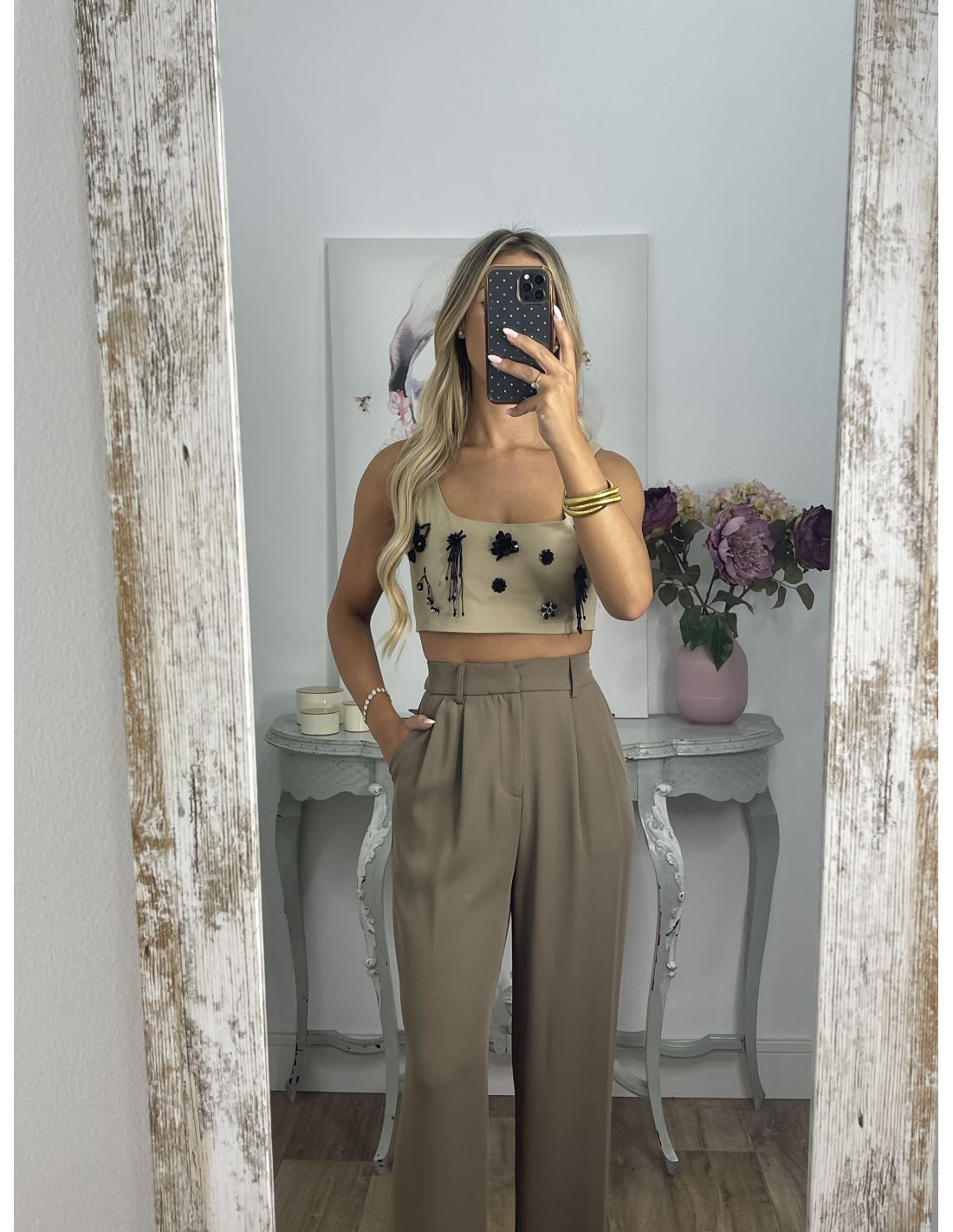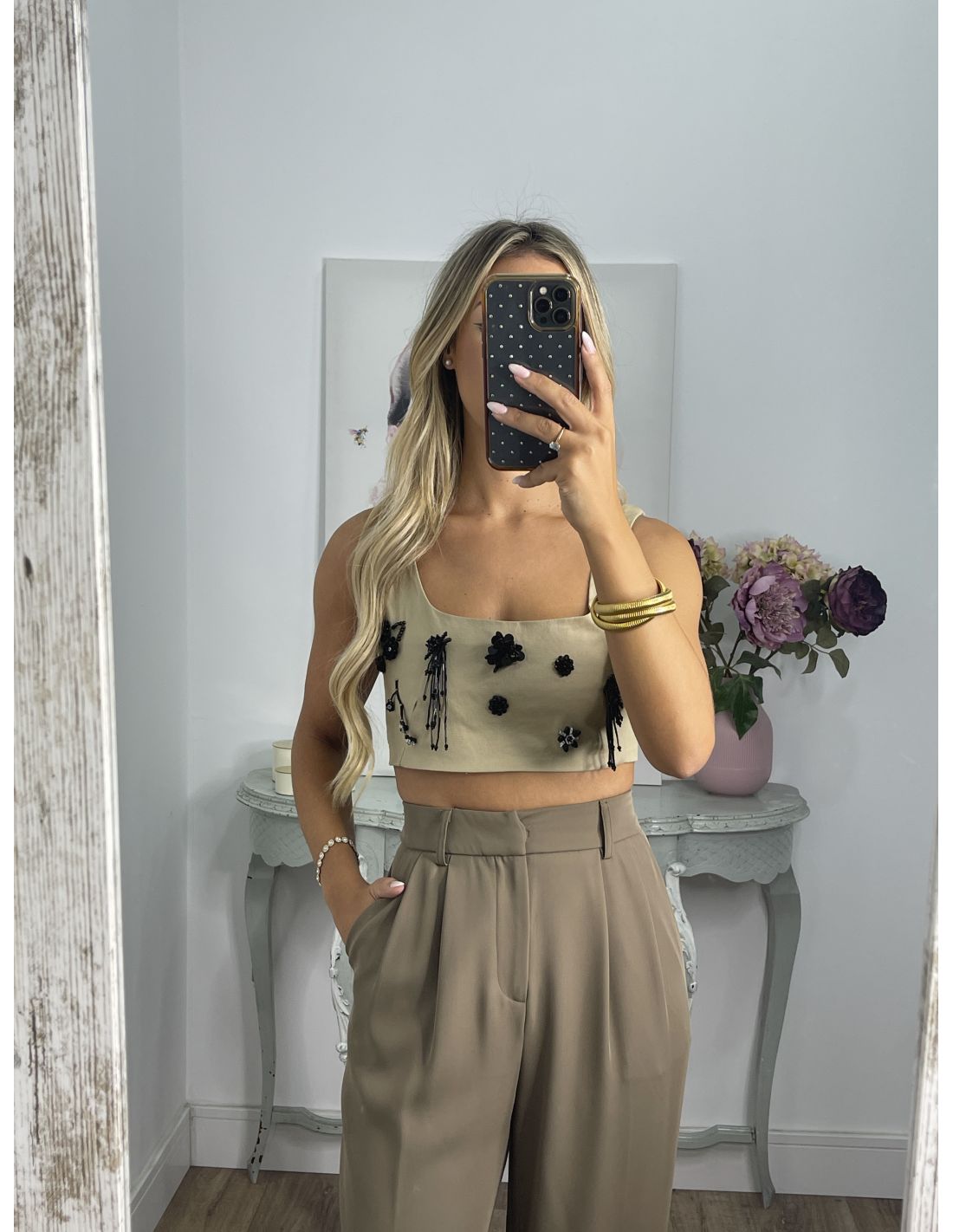 Top cortito y ajustado con detalles de Abalorio en la parte delantera y la parte de atrás es de nido de abeja. Talla justo, Estas dos tallas, coger la talla mayor.