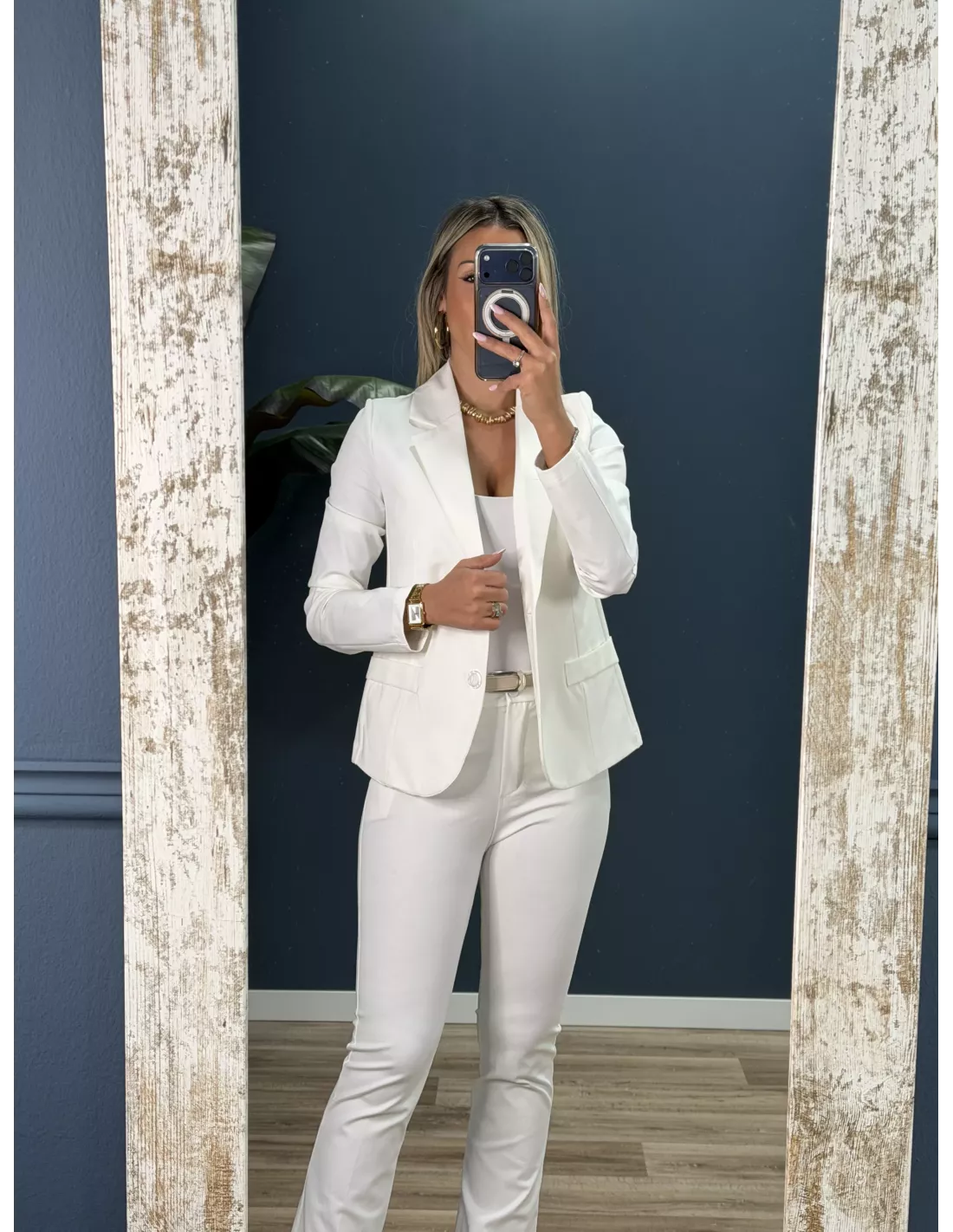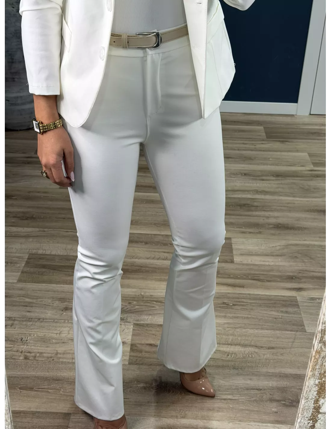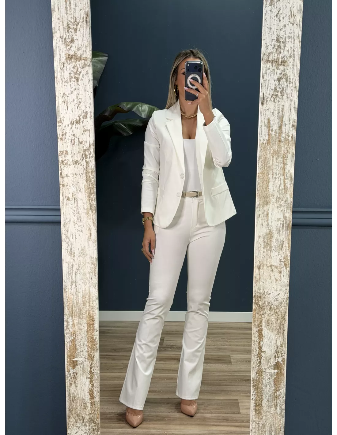 Traje tejido de punto grueso. La chaqueta no va forrada se cierra con dos botones y simula bolsillo, pero no son bolsillos. El pantalón de tiro medio alto, incluye el cinturón, bolsillos tipo chino y es decirte acampanado, no tapa el zapato.
