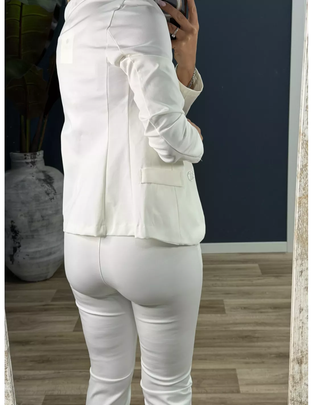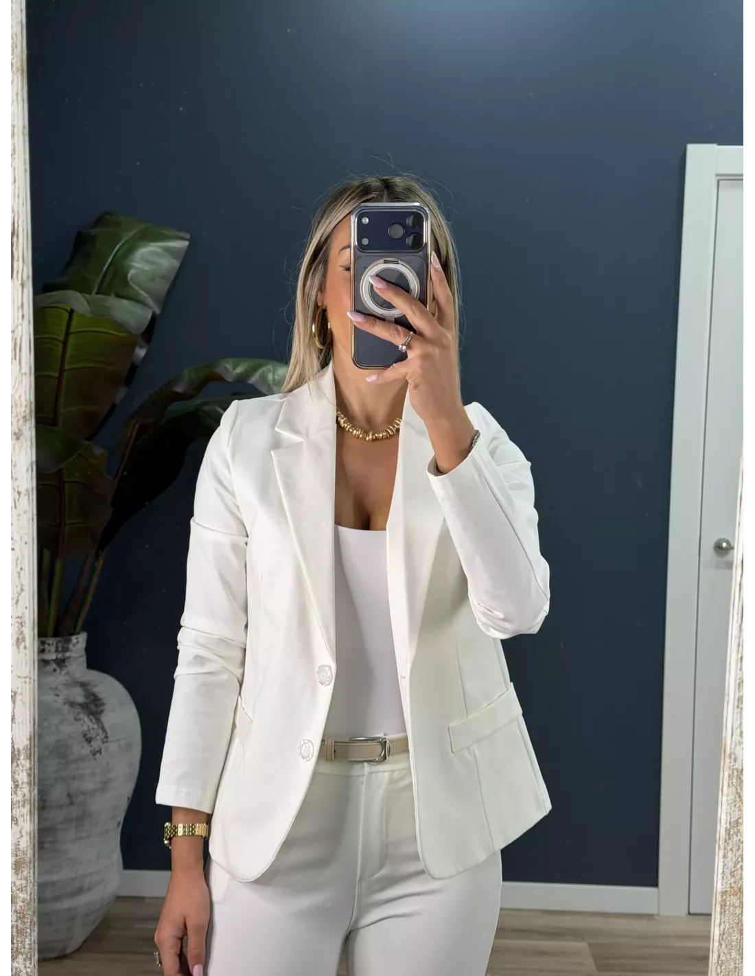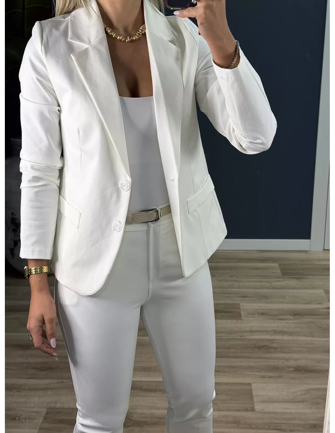Traje tejido de punto grueso. La chaqueta no va forrada se cierra con dos botones y simula bolsillo, pero no son bolsillos. El pantalón de tiro medio alto, incluye el cinturón, bolsillos tipo chino y es decirte acampanado, no tapa el zapato.
