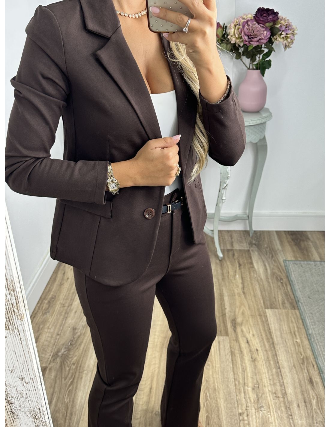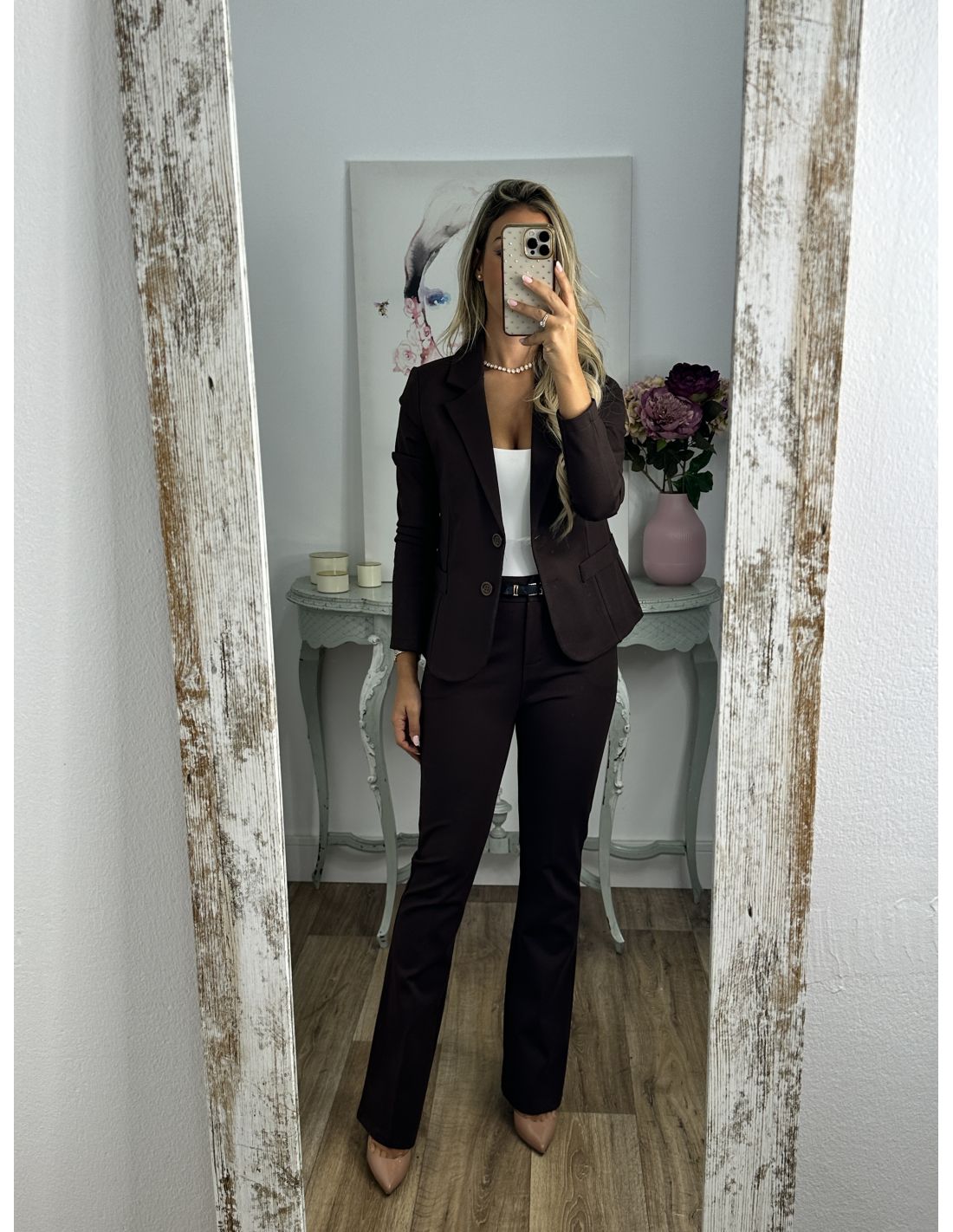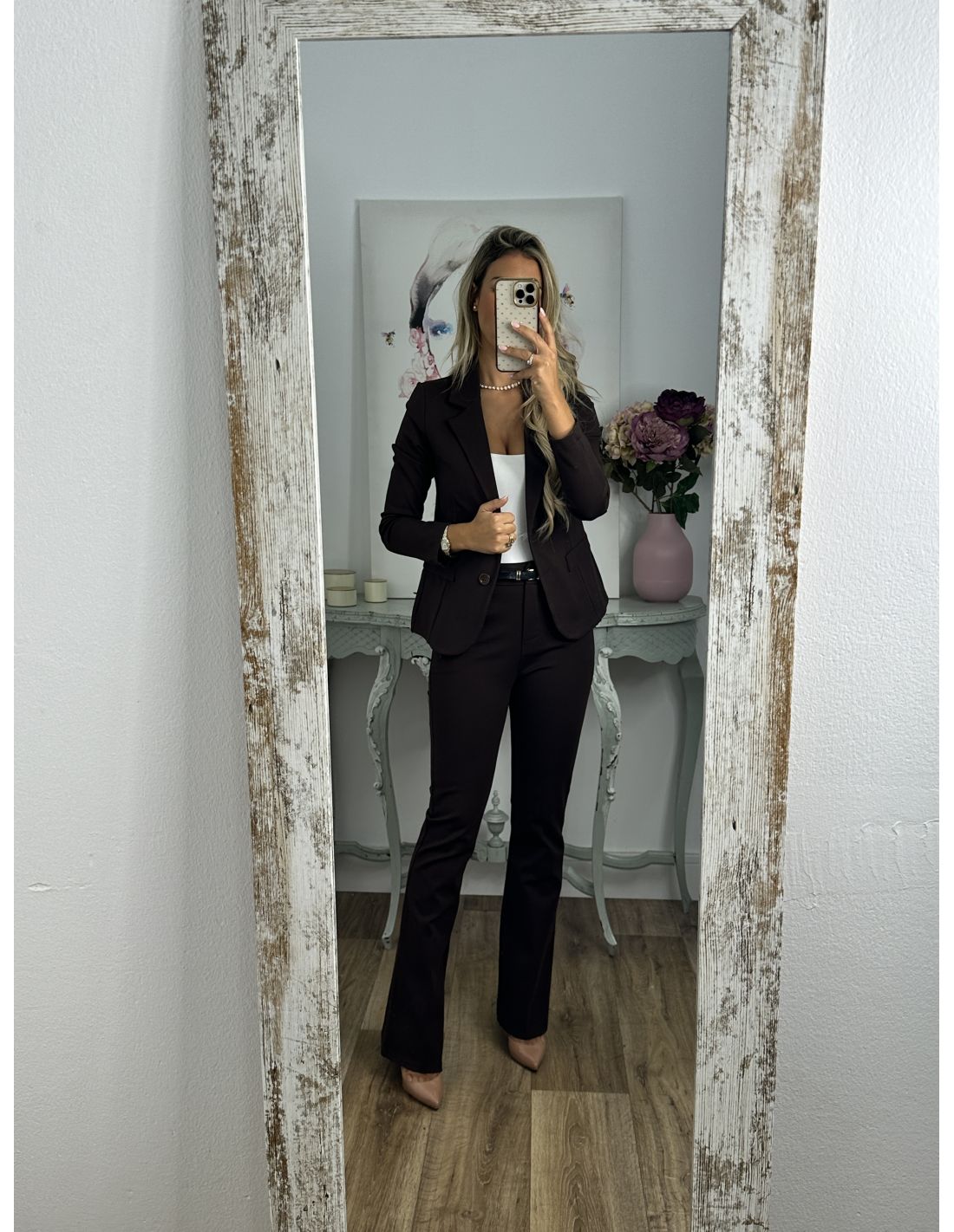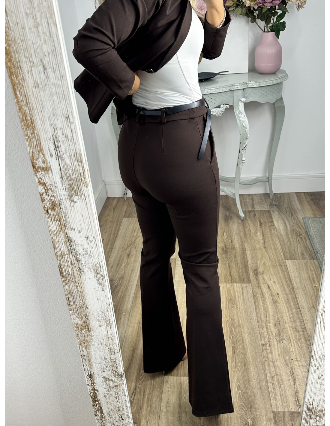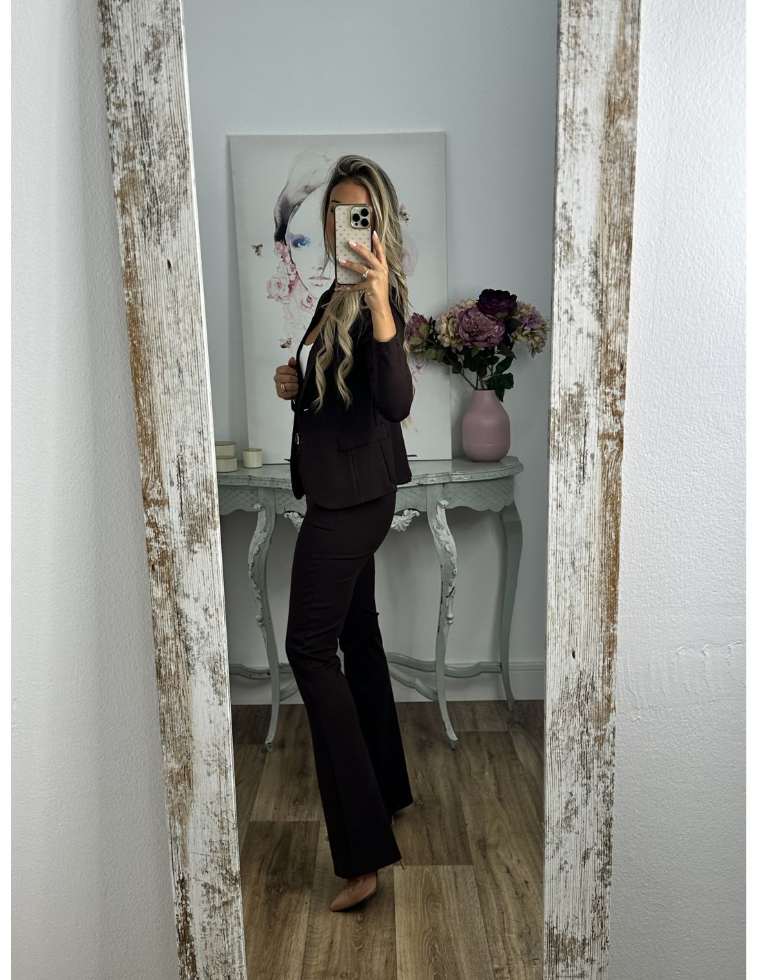 Traje tejido de punto grueso. La chaqueta no va forrada se cierra con dos botones y simula bolsillo, pero no son bolsillos. El pantalón de tiro medio alto, incluye el cinturón, bolsillos tipo chino y es decirte acampanado, no tapa el zapato.