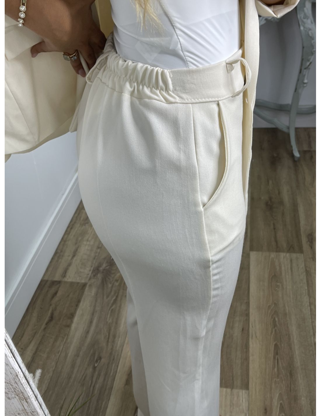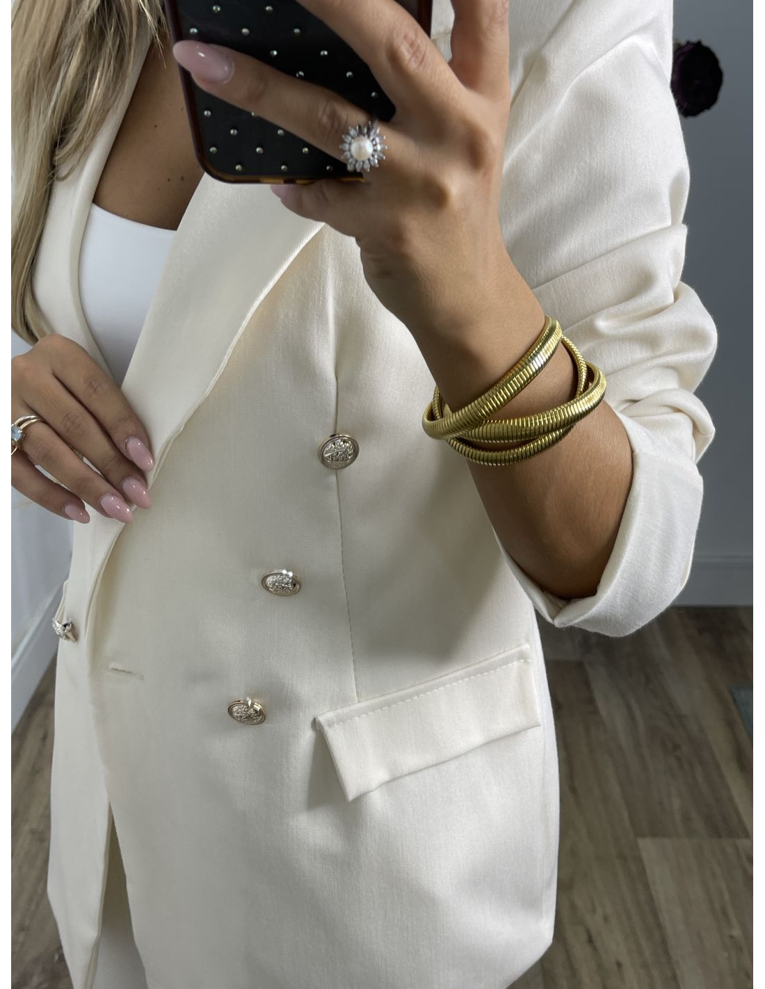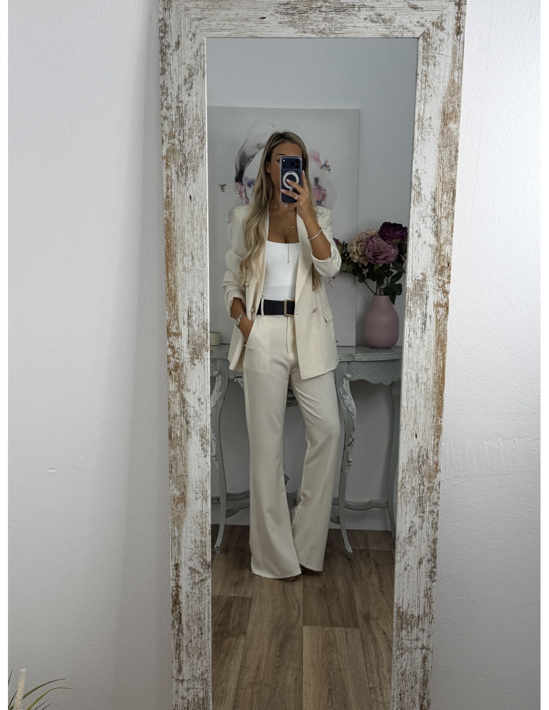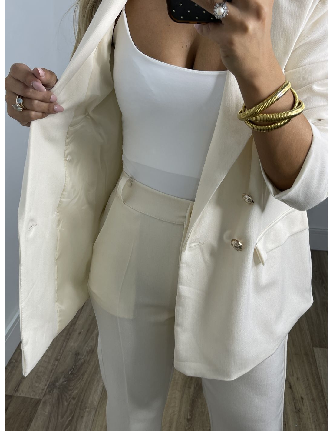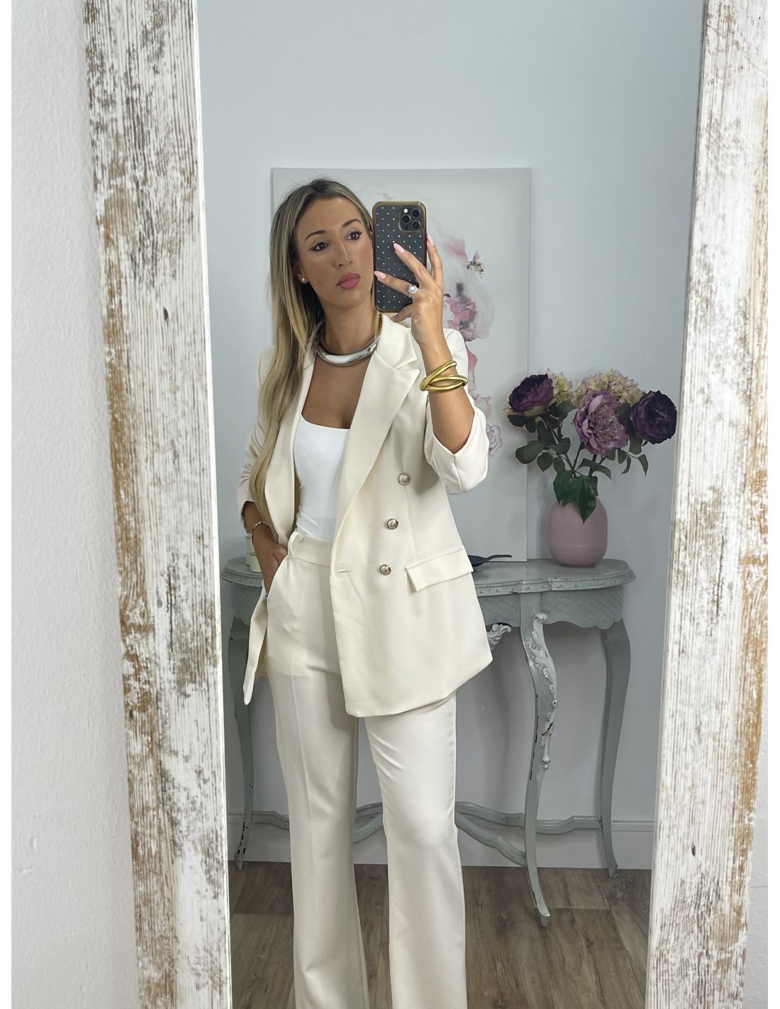 Traje de chaqueta y pantalón. La chaqueta va forrada y tiene hombreras, el corte es montado, los botones son dorados. El pantalón en la parte de atrás de la cintura lleva goma. El corte del pantalón es con forma abajo. Si eres alta mirar la medida del largo del pantalón.