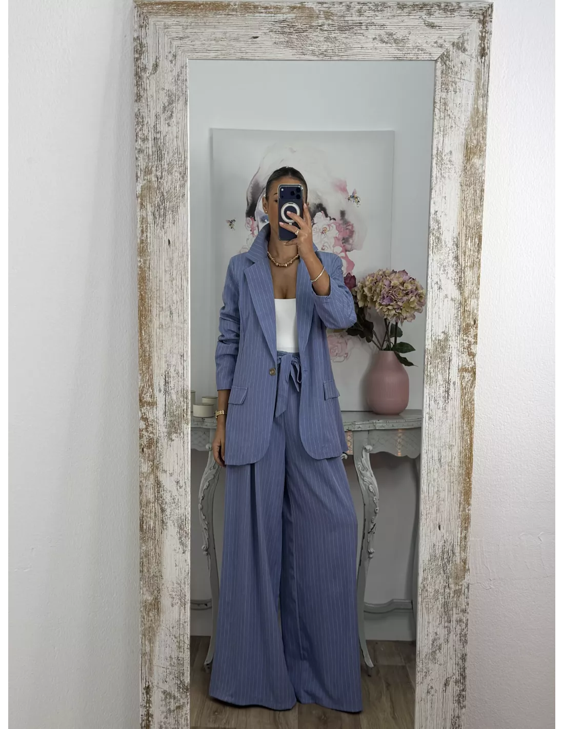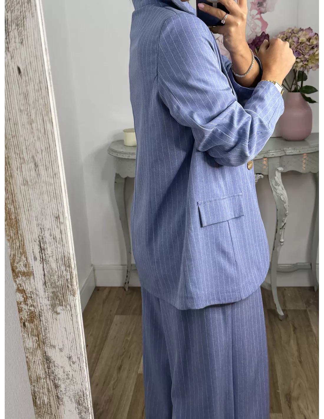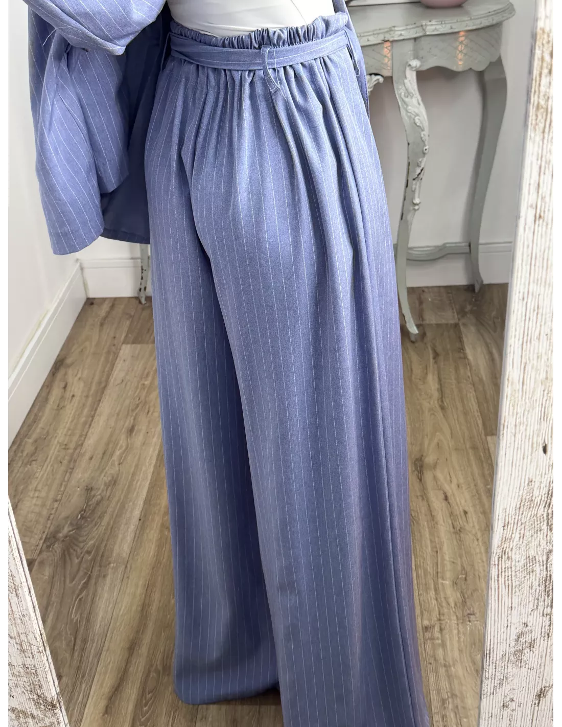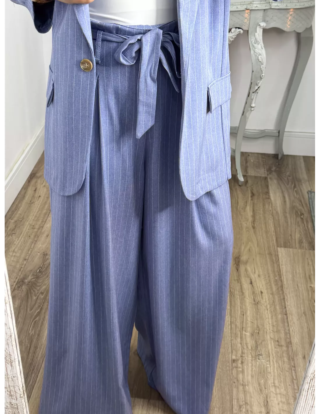 Traje de chaqueta y pantalón. La chaqueta va forrada, tiene hombreras y es de corte oversize, no tiene bolsillos. El pantalón es tipo Palazzo de talle alto que trae cinturón del mismo tejido. La parte de atrás de la cintura lleva goma.