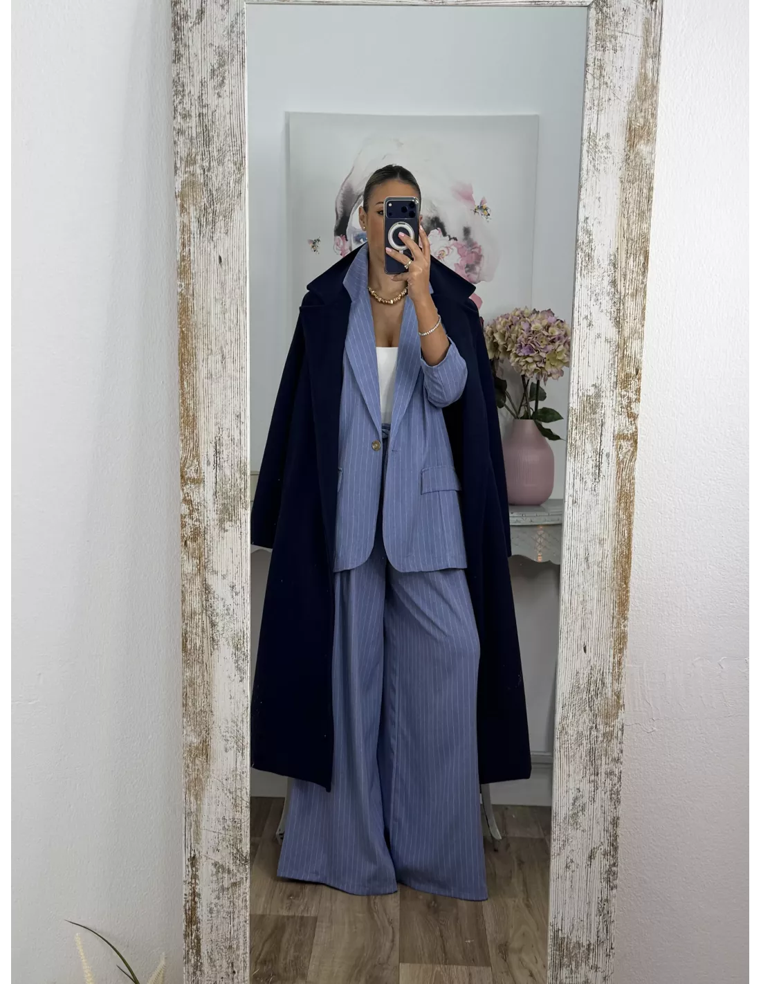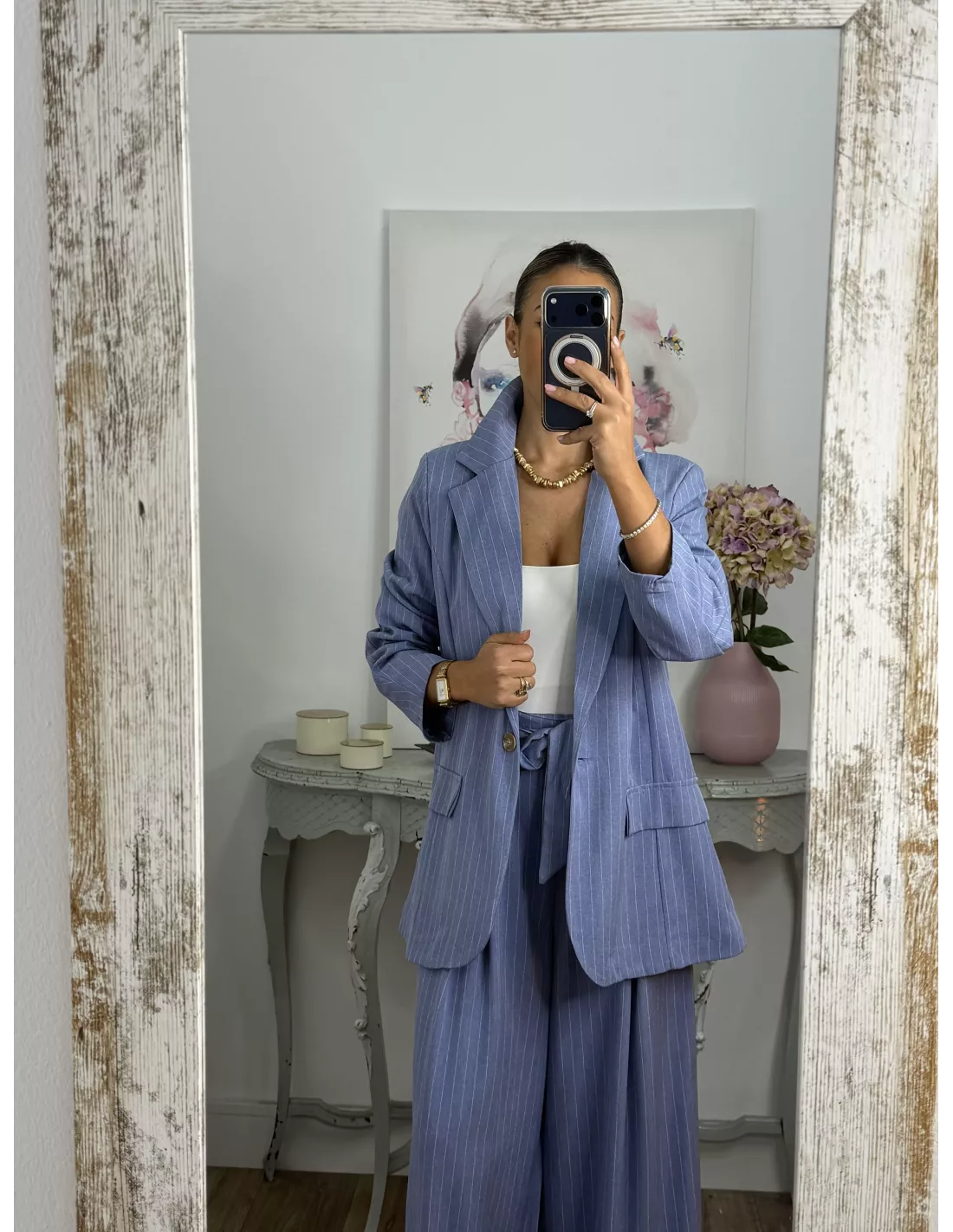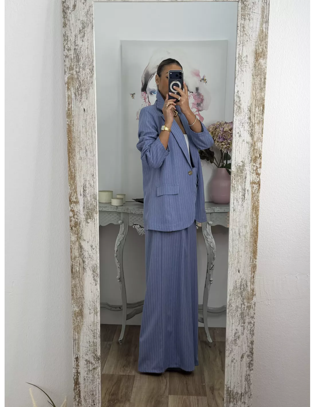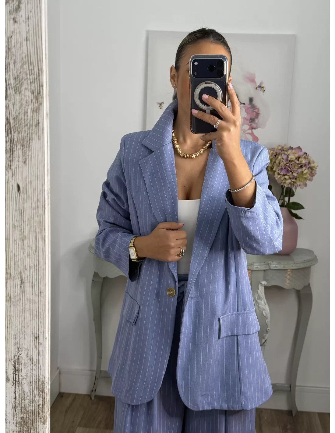 Traje de chaqueta y pantalón. La chaqueta va forrada, tiene hombreras y es de corte oversize, no tiene bolsillos. El pantalón es tipo Palazzo de talle alto que trae cinturón del mismo tejido. La parte de atrás de la cintura lleva goma.