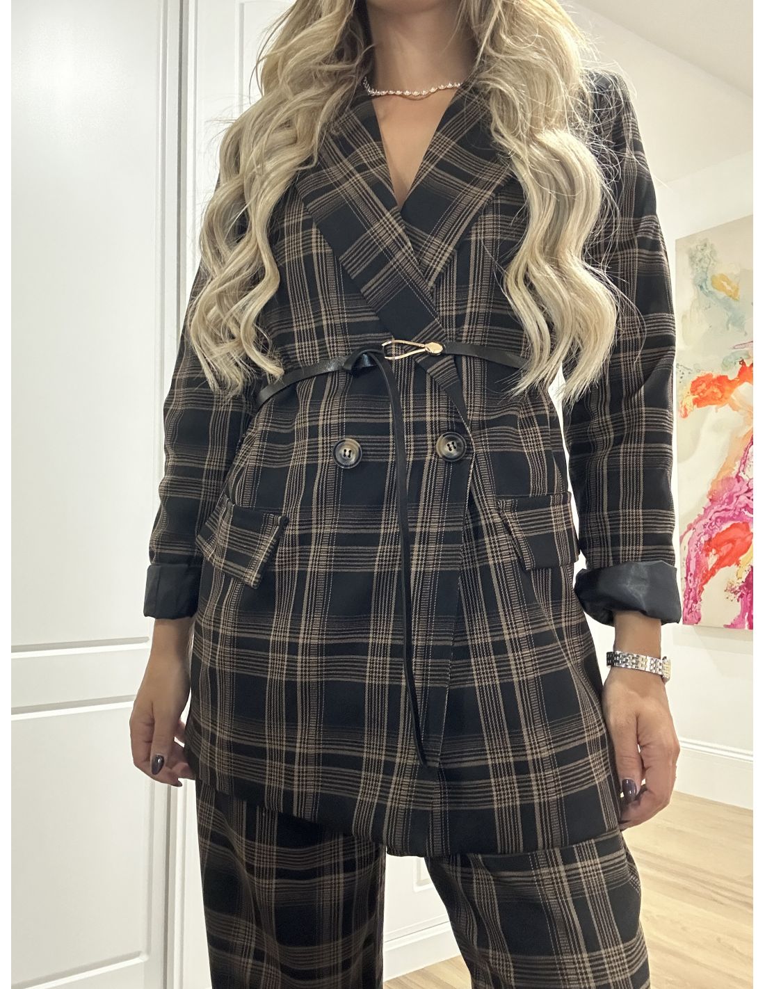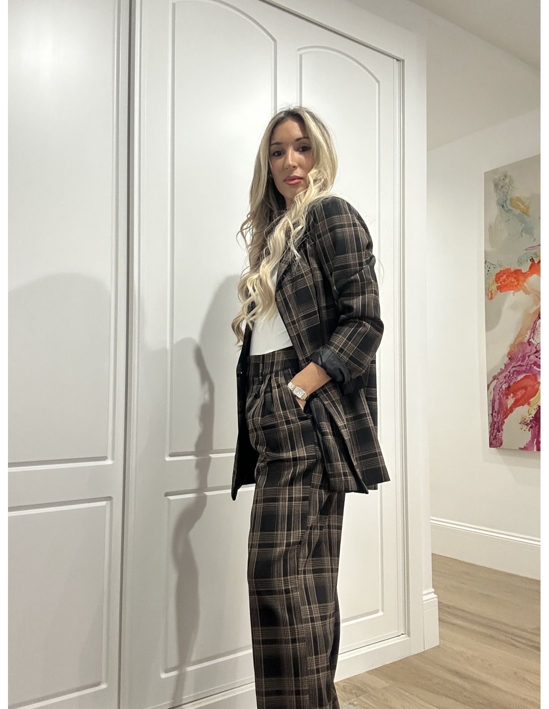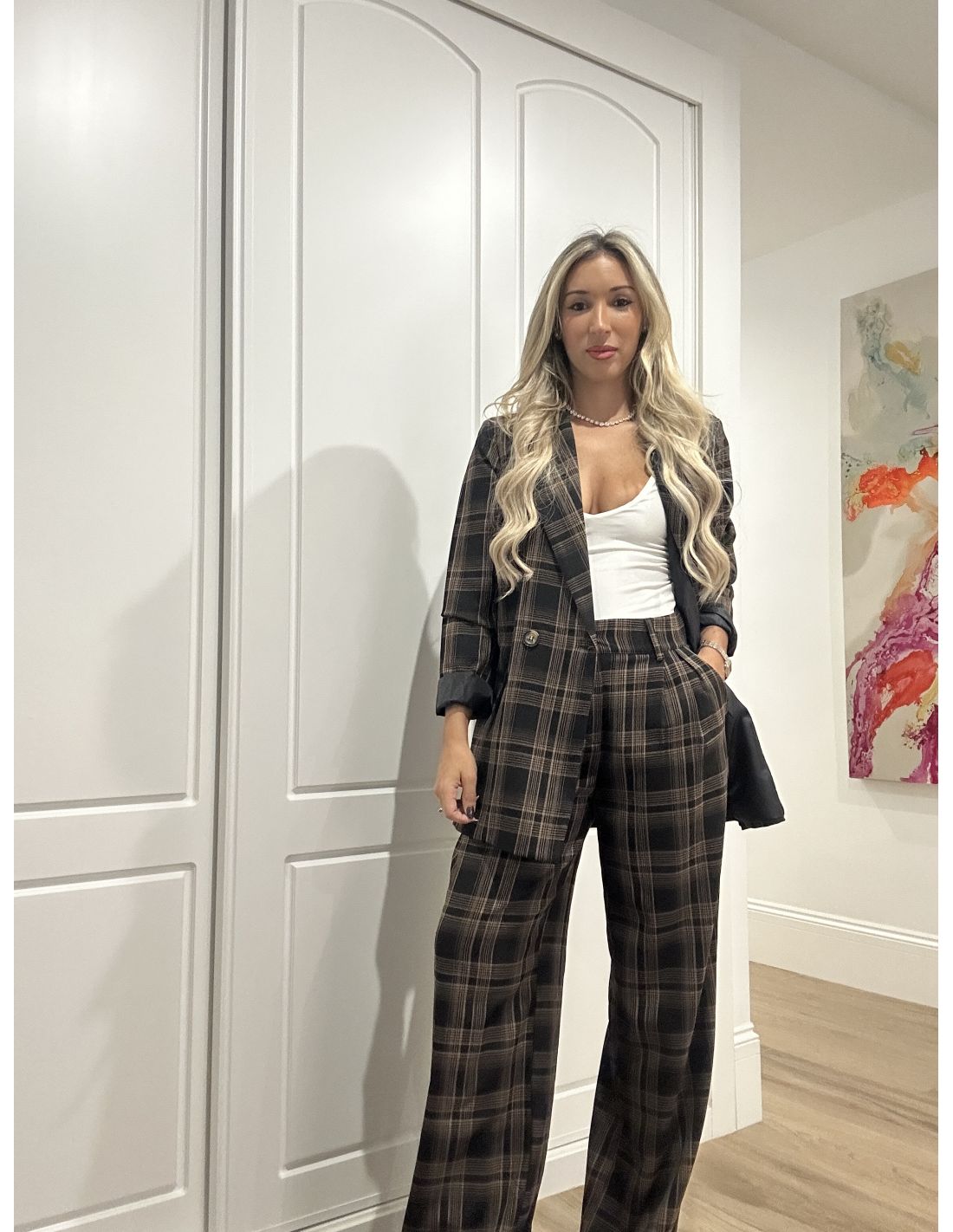 Traje de chaqueta y pantalón. La chaqueta va forrada tiene hombreras y es de corte montado trae el cinturón que es fino. El pantalón es de pinzas en la parte delantera con bolsillos, tipo chinos y de corte, recto y amplio.