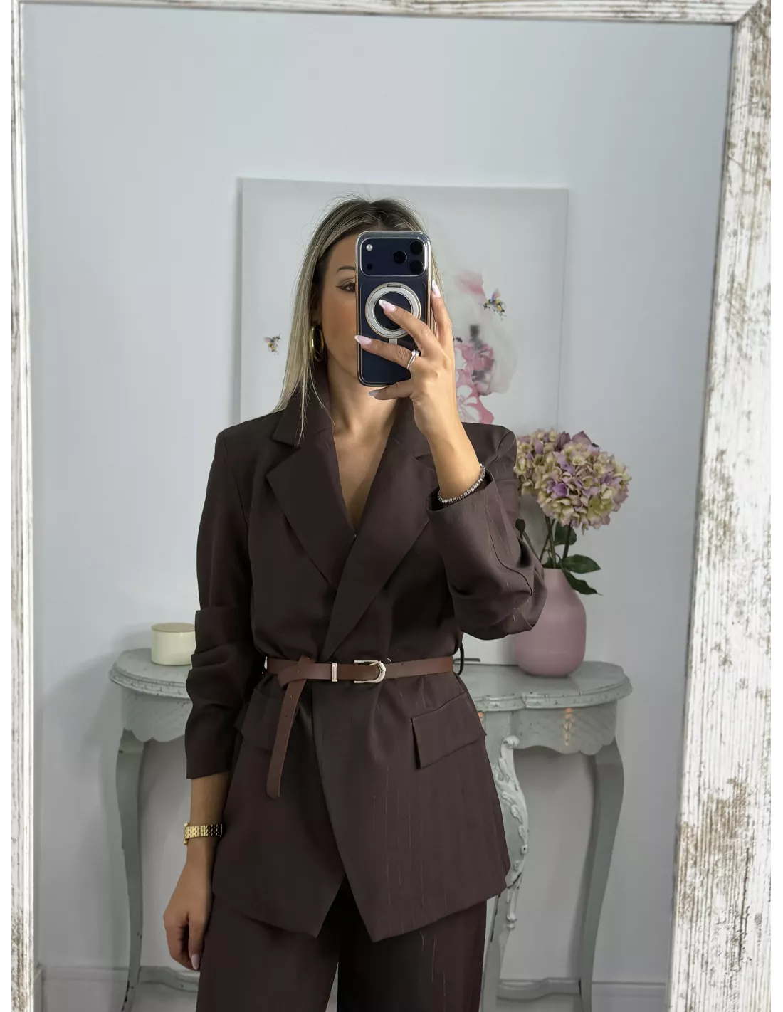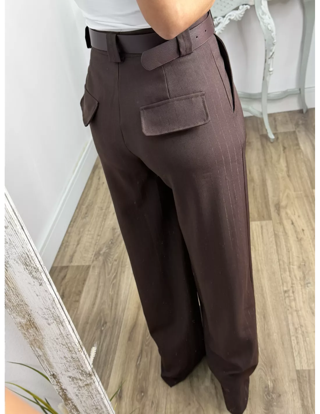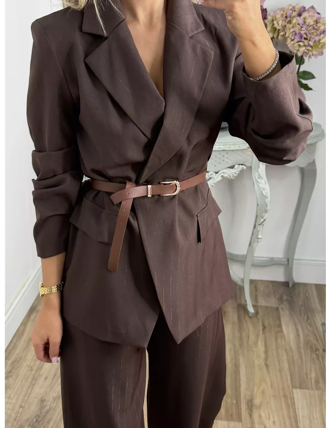 Traje de chaqueta con raya diplomática. La chaqueta es de corte montado, y lleva cinturón en marrón, no va forrada. El pantalón de pinzas, incluye el cinturón.