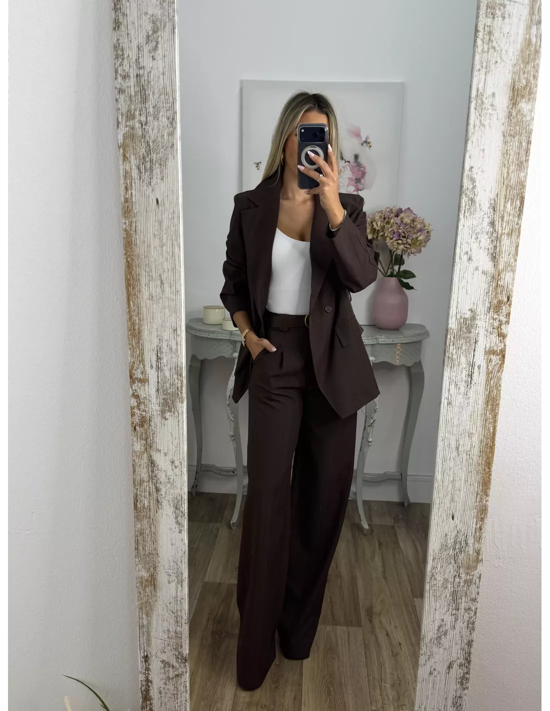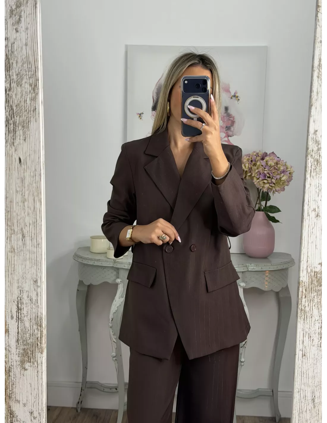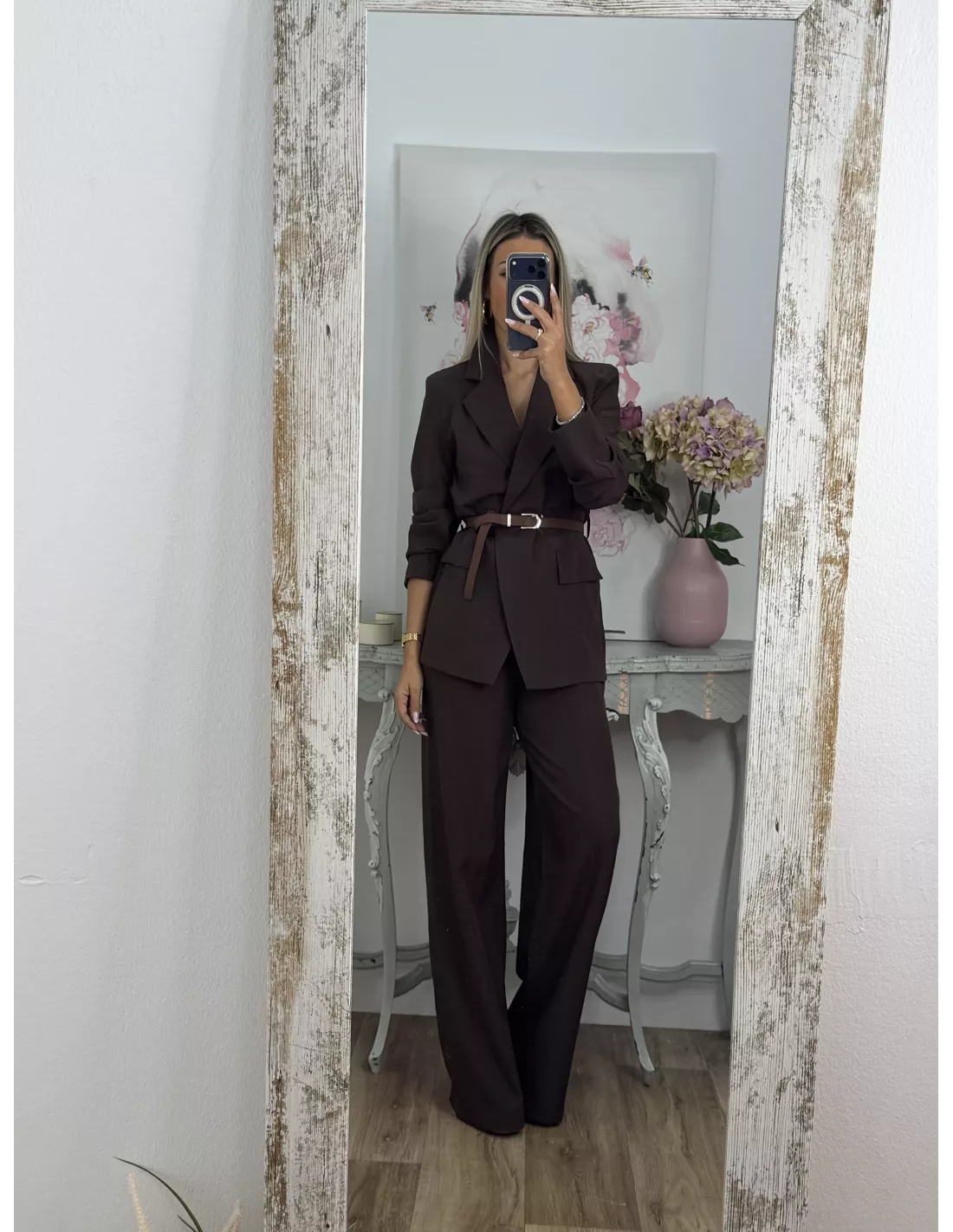 Traje de chaqueta con raya diplomática. La chaqueta es de corte montado, y lleva cinturón en marrón, no va forrada. El pantalón de pinzas, incluye el cinturón.