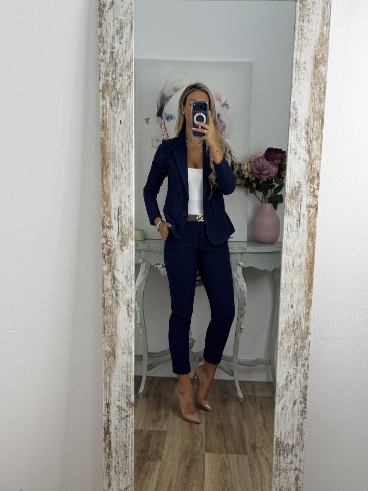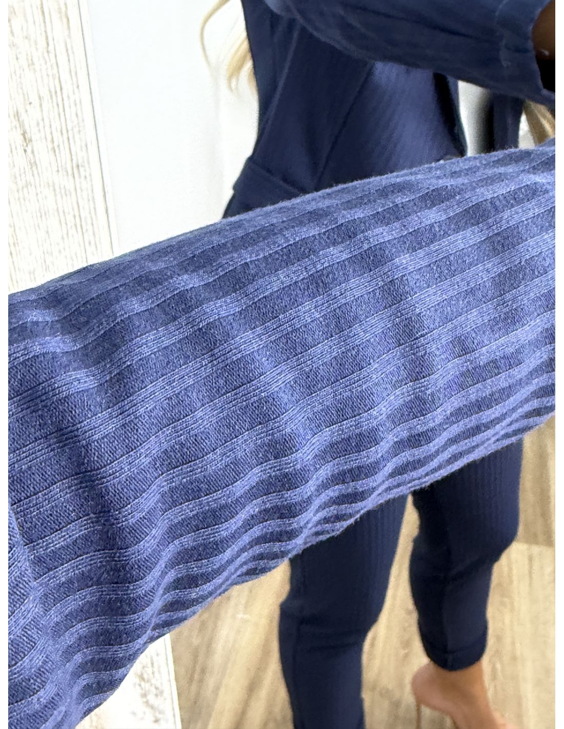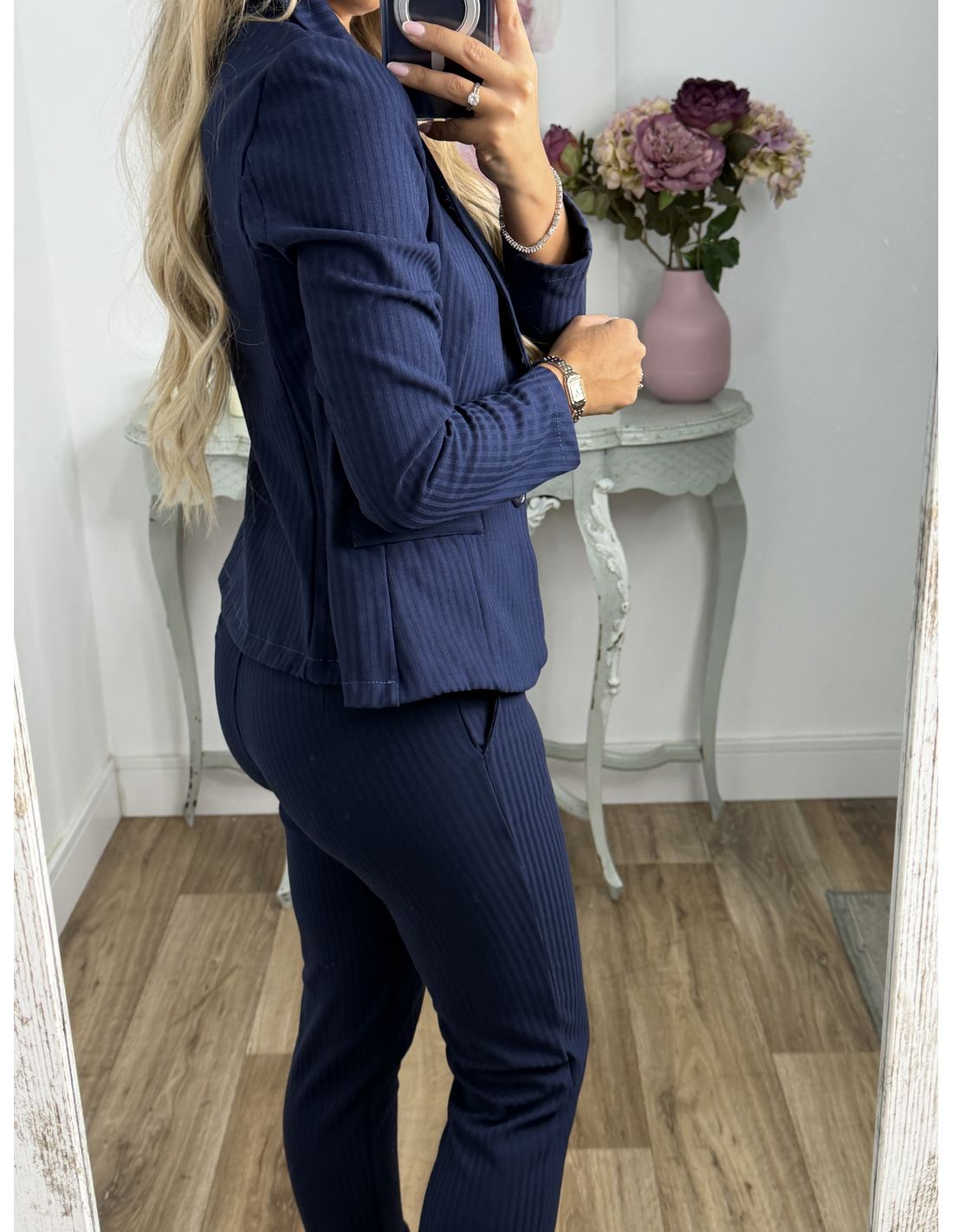 Traje tejido de punto grueso. La chaqueta no va forrada se cierra con dos botones y simula bolsillo, pero no son bolsillos. El pantalón de tiro medio bajo incluye el cinturón, bolsillos tipo chino. El pantalón es normal no lleva la doble en el bajo.