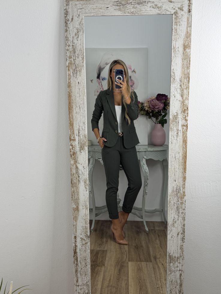 Traje tejido de punto grueso. La chaqueta no va forrada se cierra con dos botones y simula bolsillo, pero no son bolsillos. El pantalón de tiro medio alto, incluye el cinturón, bolsillos tipo chino.
